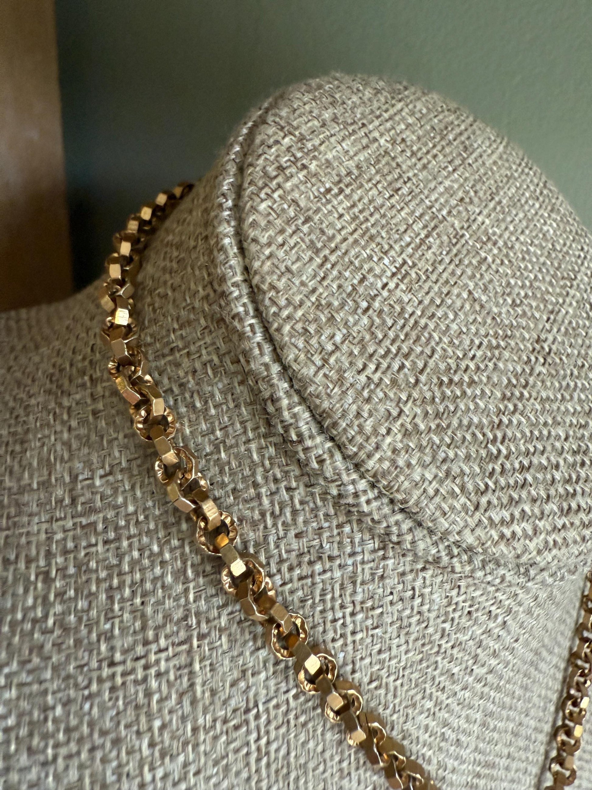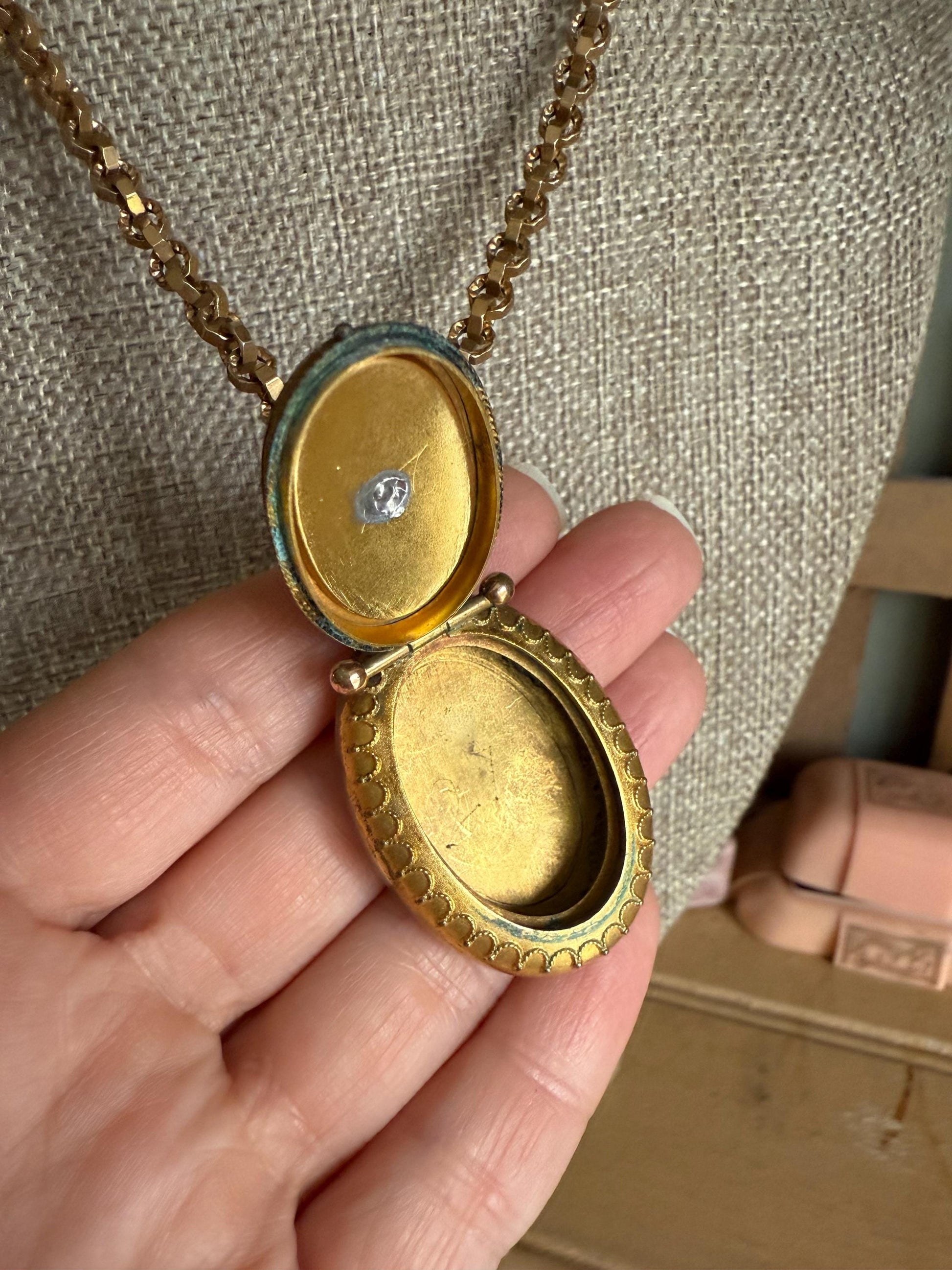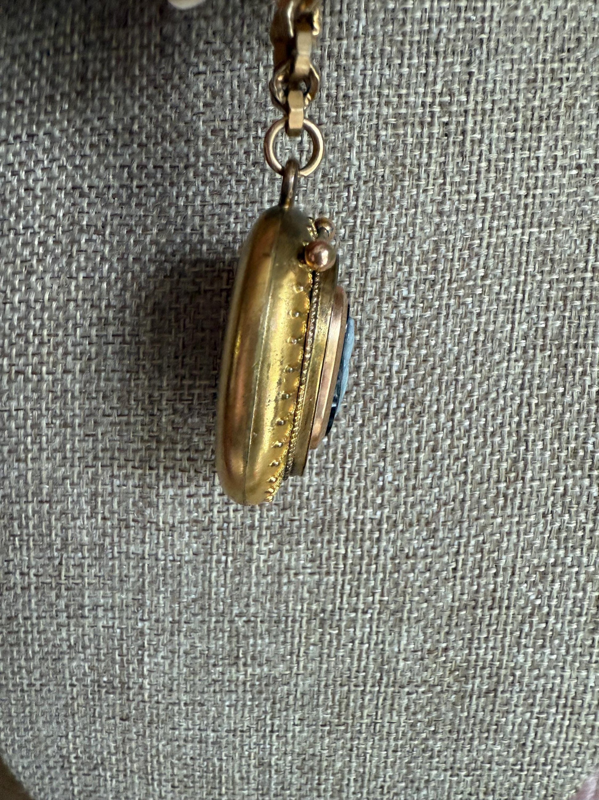 Unusual antique Victorian gold filled large locket featuring a hand carved banded agate cameo of a full figure woman. The locket opens at the bottom by a little knob. Surrounded the cameo is a twisted rope and Etruscan style wirework. The metal colors are yellow and rose with a satin finish. Length 1 3/4" x 1" wide, 1/2" deep. On antique chunky link chain with older style spring ring clasp. 16" length.