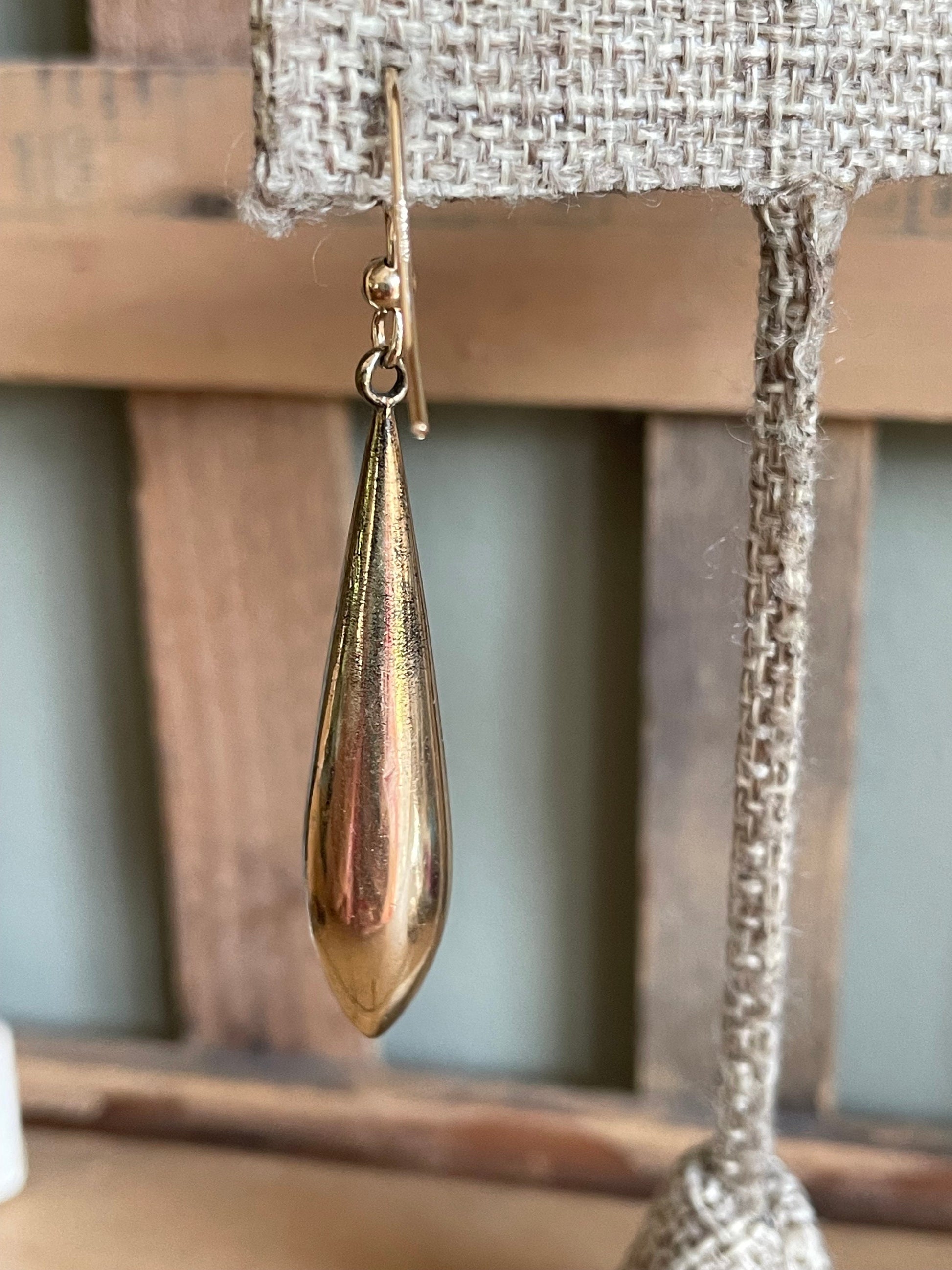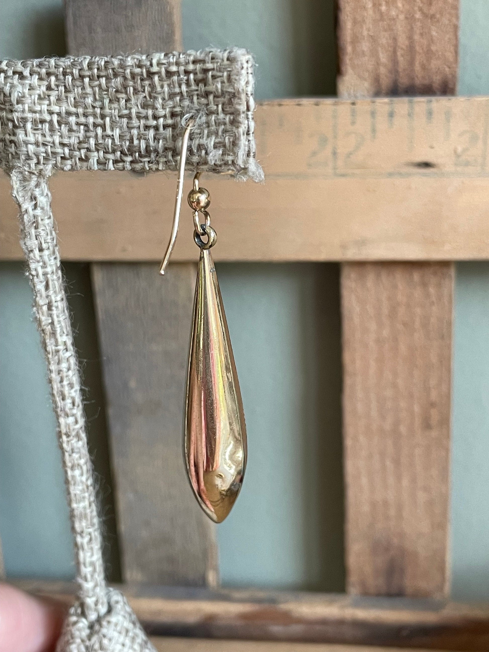 Gold filled victorian torpedo earrings featuring black tracery enamel. Possibly mourning piece. The length 2.25" and width is 5/16". New gold filled hooks. The enamel is in very good condition. Please note to slight dimples to one of the backs. I've priced these to consider the condition.