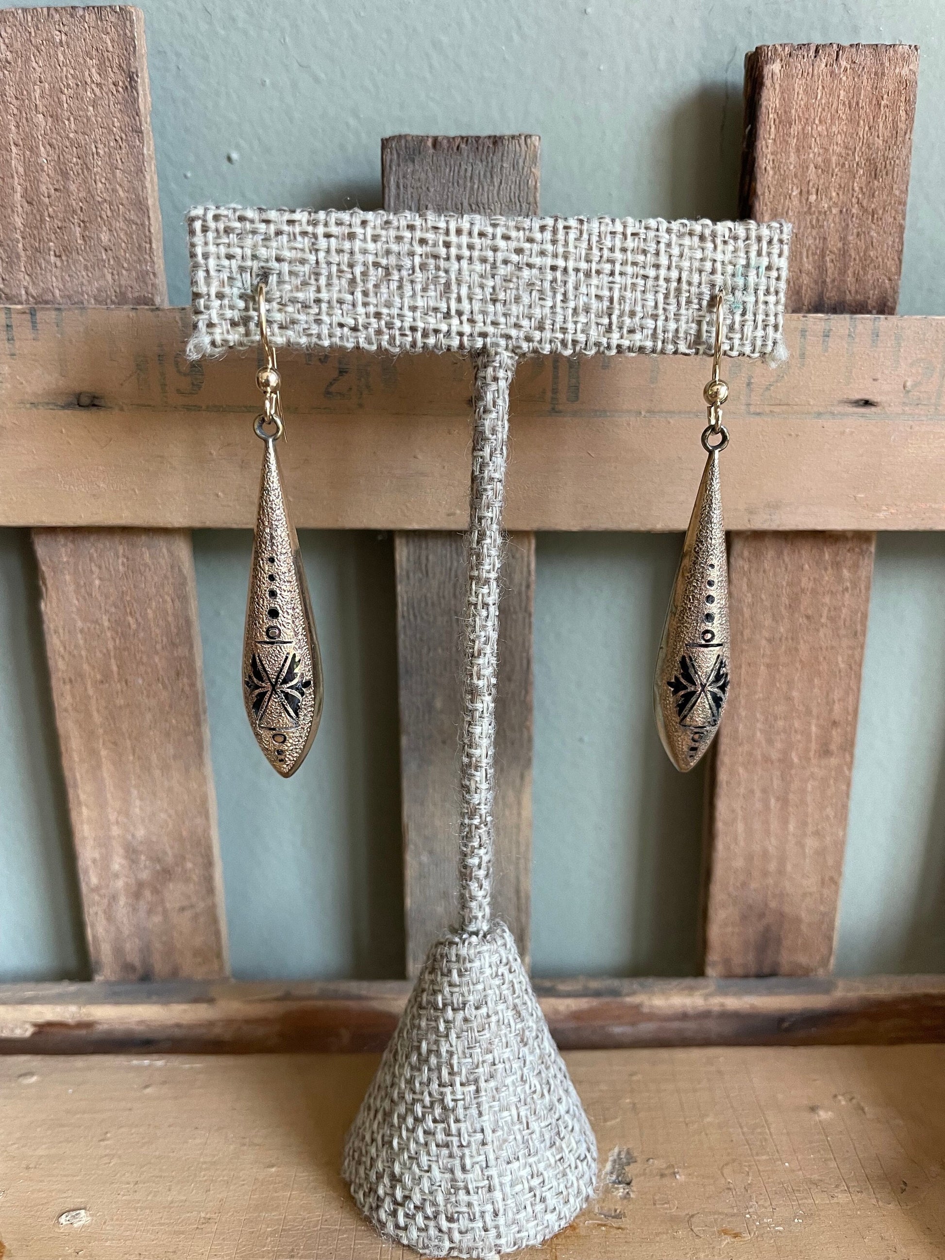 c1880 Victorian Gold Filled Black Tracery Enamel Torpedo Earrings