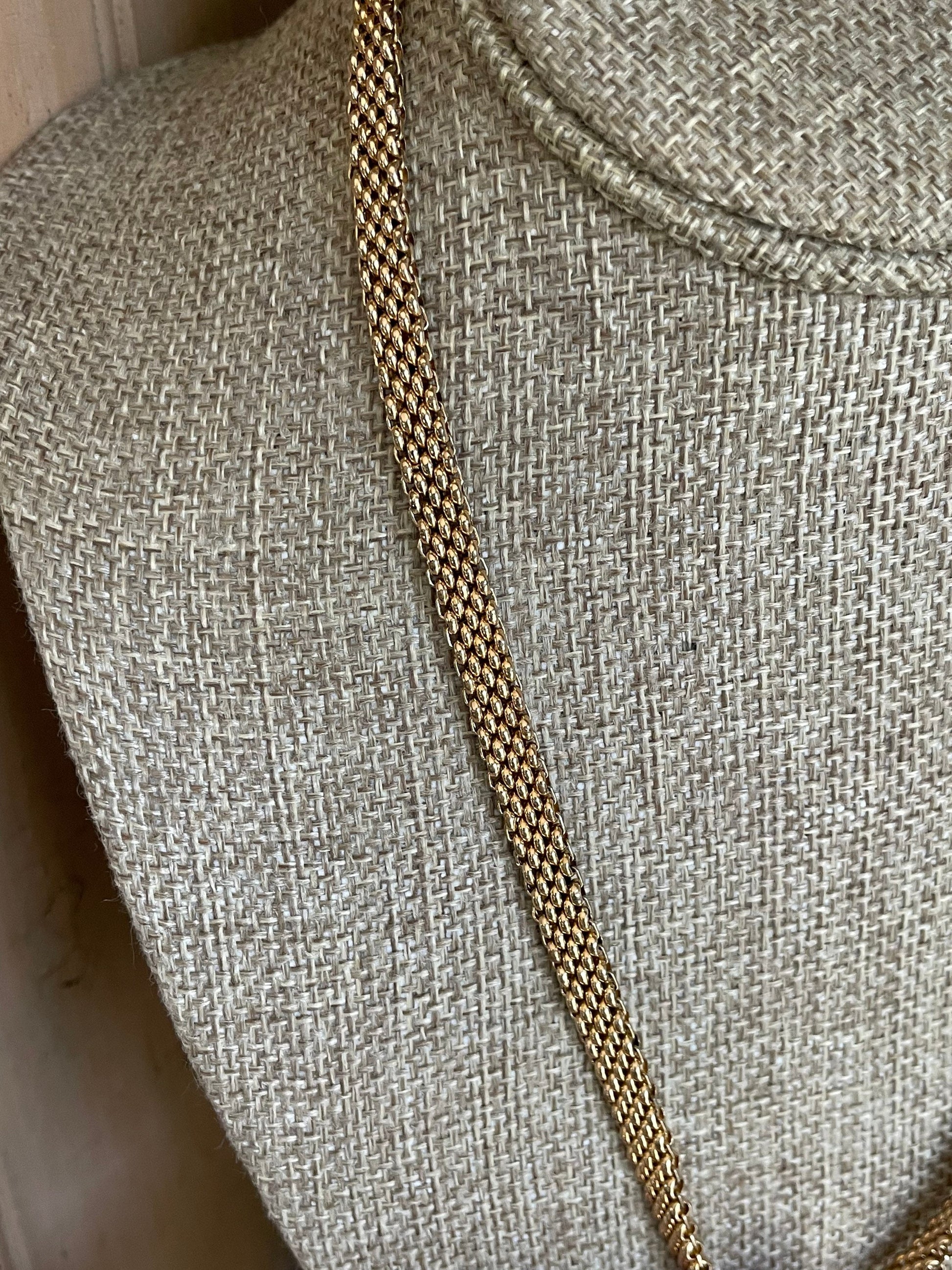 Rose gold filled with a hand carved black and white sardonyx of a lady in profile. She is bezel set in a fancy pendant that dangles from a highly decorative bale. The chain is 6.16 mm tall. The pendant measures 18.50 mm wide. The clasp is on the back side of the pendant.