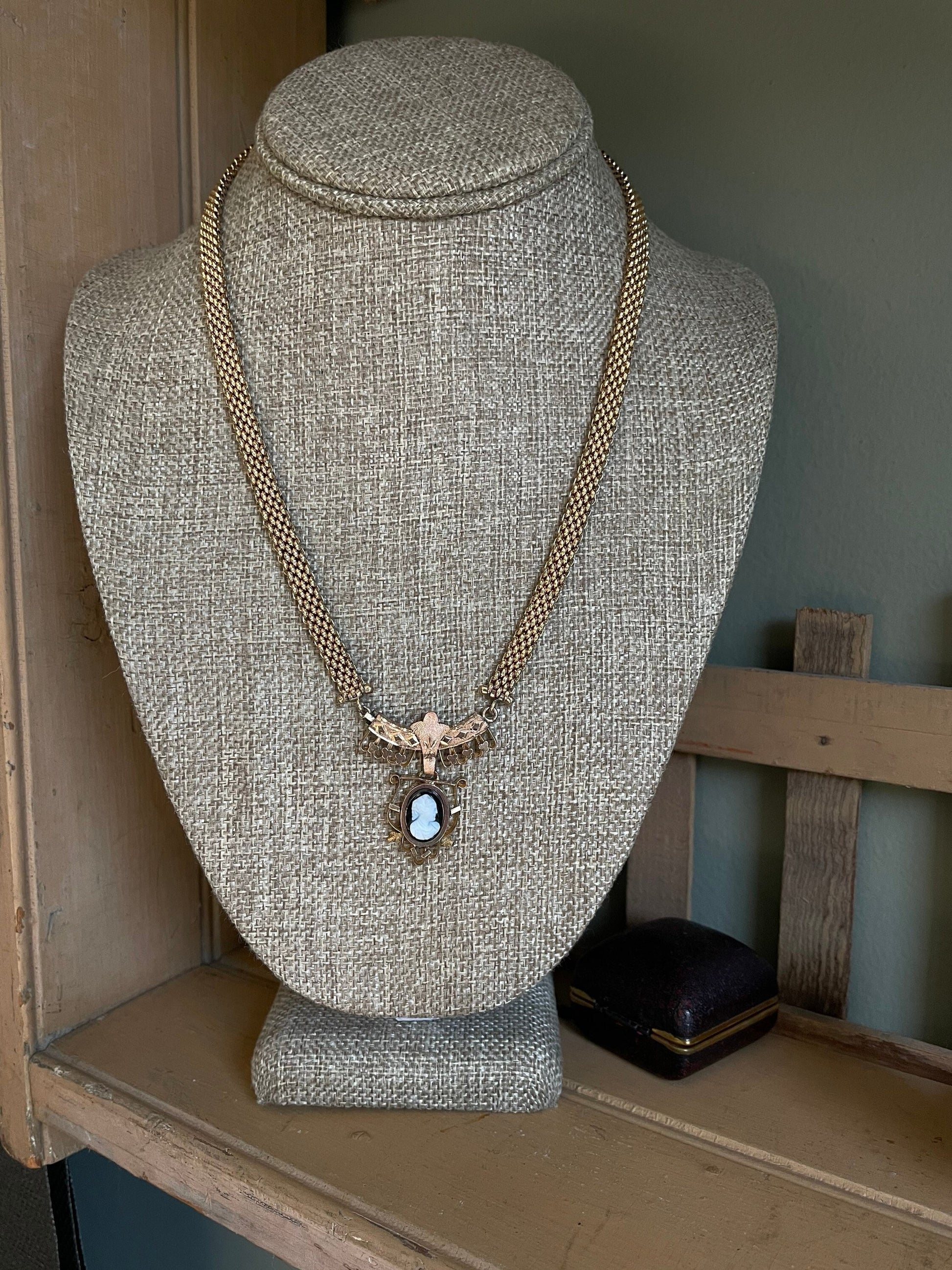 c1880 Victorian Rose Gold Filled Necklace with Sardonyx Carved Cameo