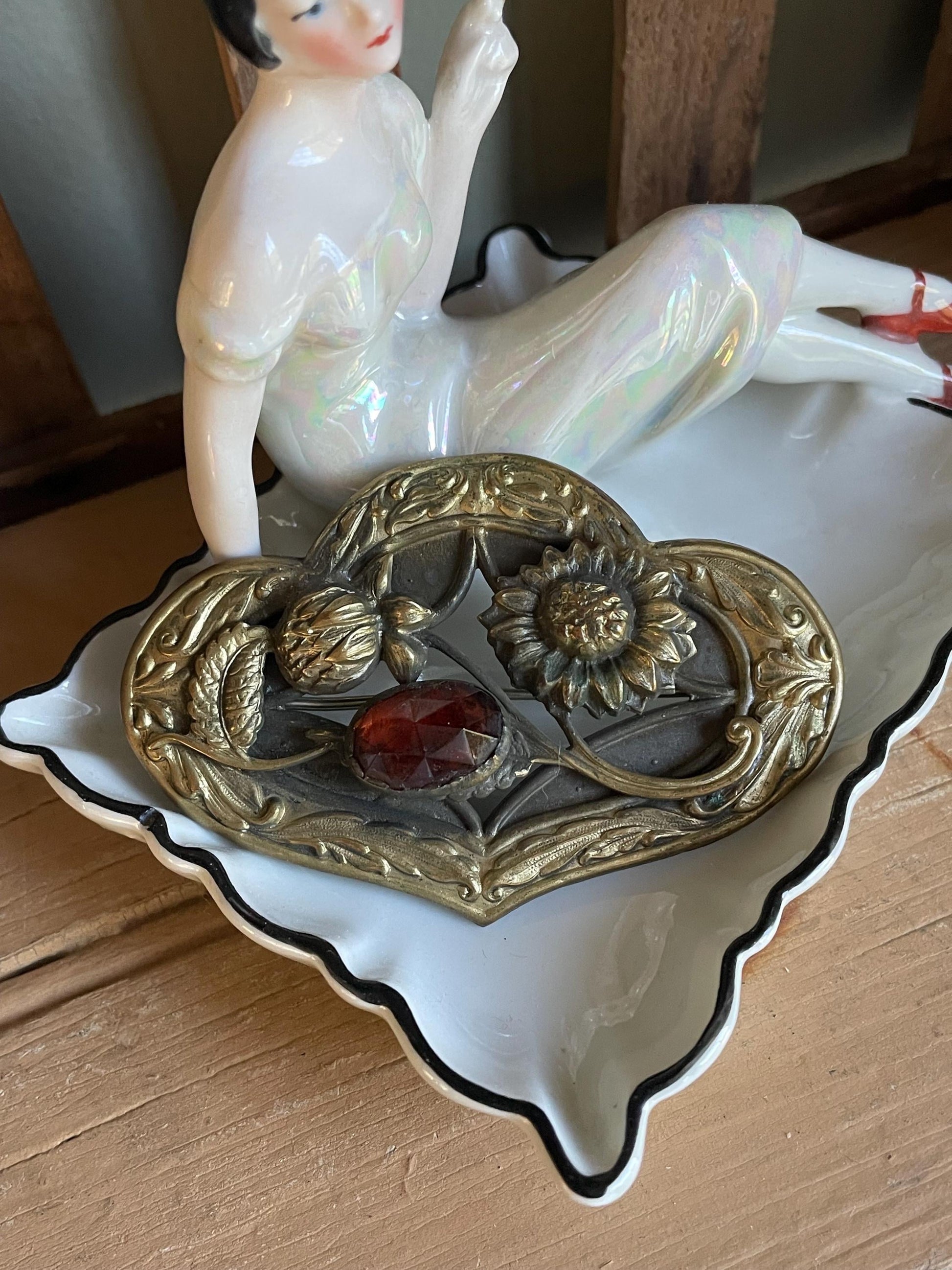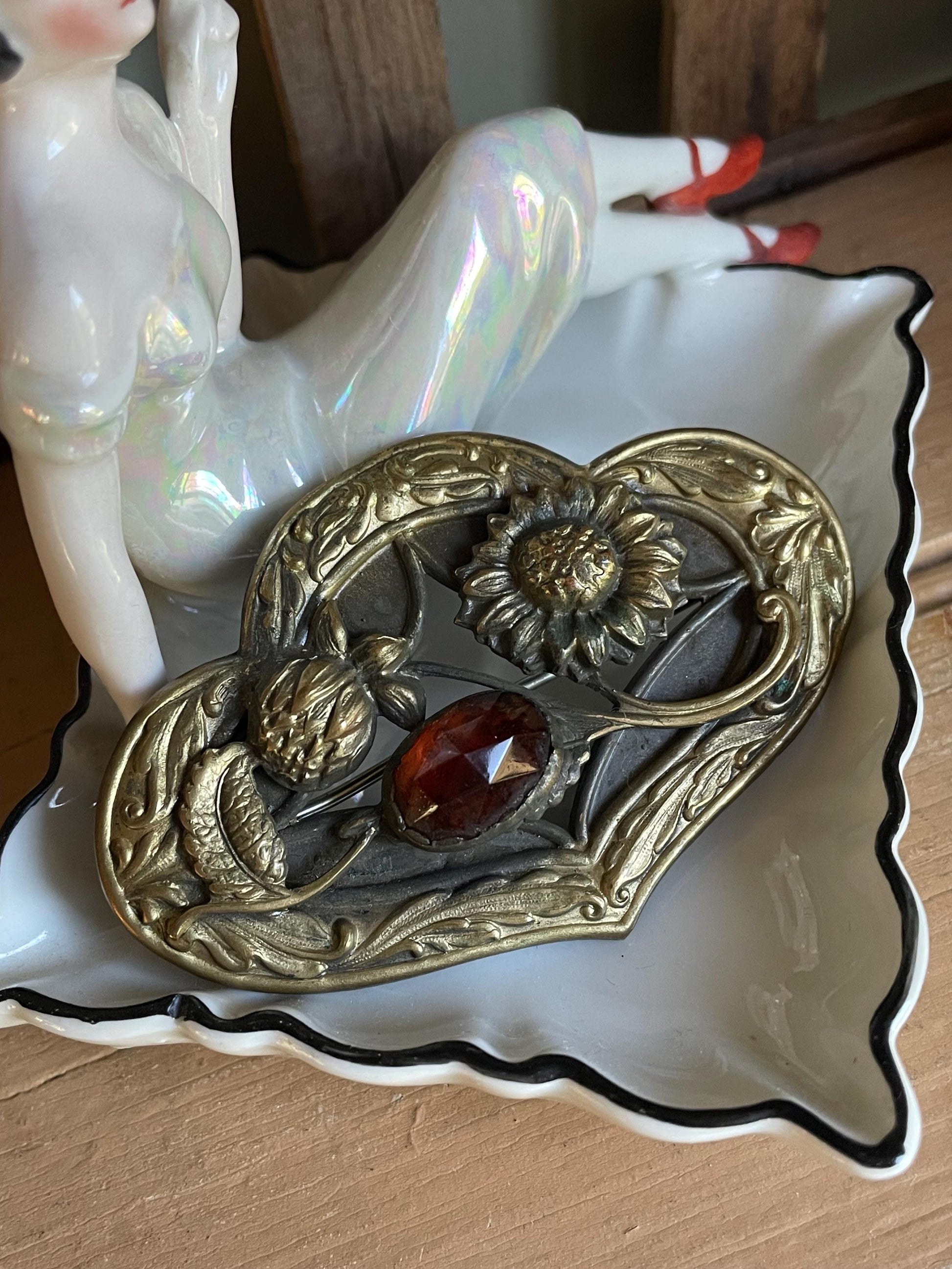 A lovely example of an Edwardian Sash brooch. Worn around the waist to hold the ends of a fabric sash. The metal is a brass alloy mixture-has a beautiful warm antique tone. The brooch has a floral open work center with decorative border. An oval orangey brown top facted glass stone is bezel set. Backside has a c-clasp. Approx. 3 x 2"