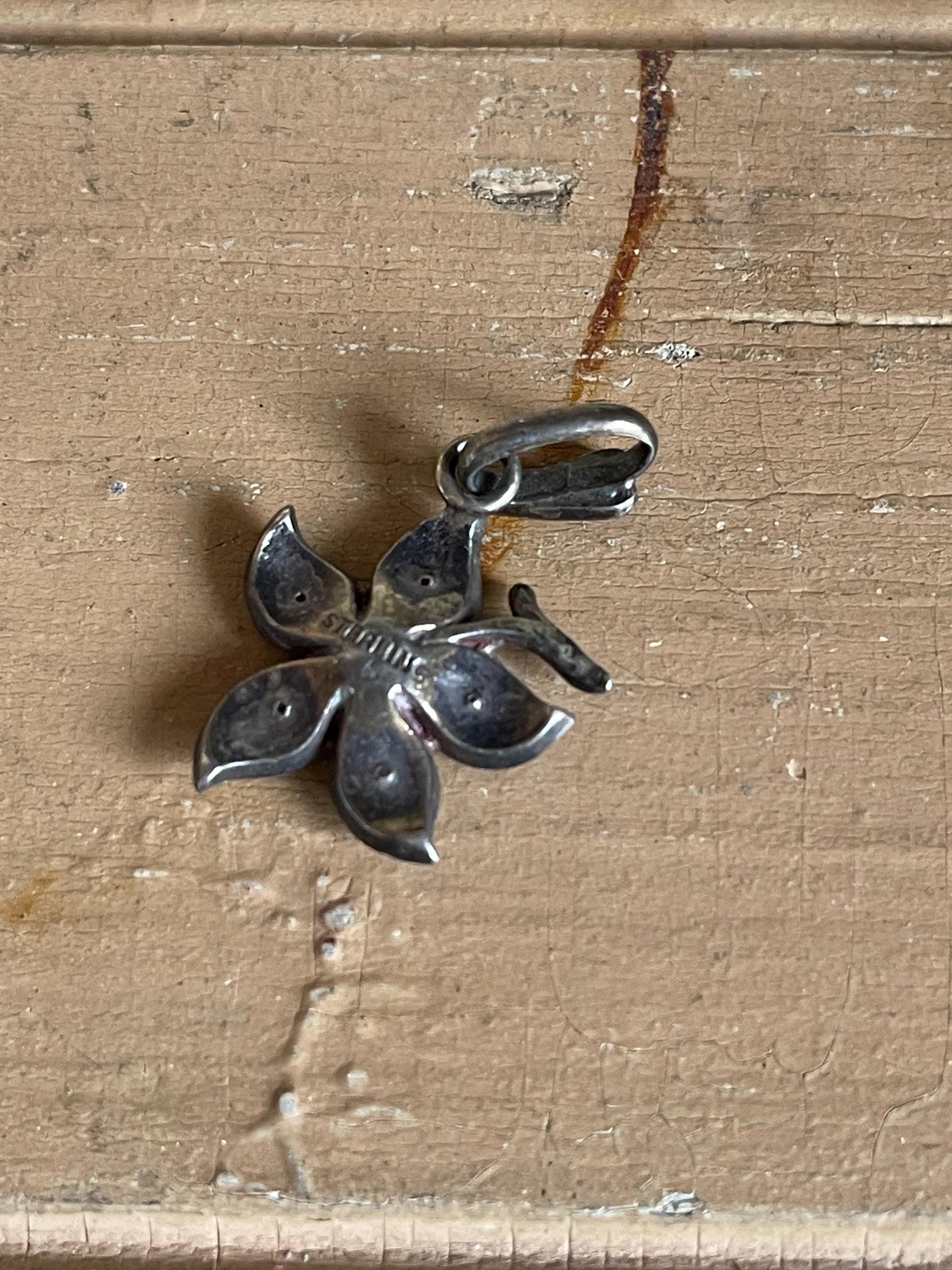 Edwardian silver flower pendant set with glass turquoise and pearls. 1" top to bottom 3/4" wide. Very good condition. I do have chains available-message me.