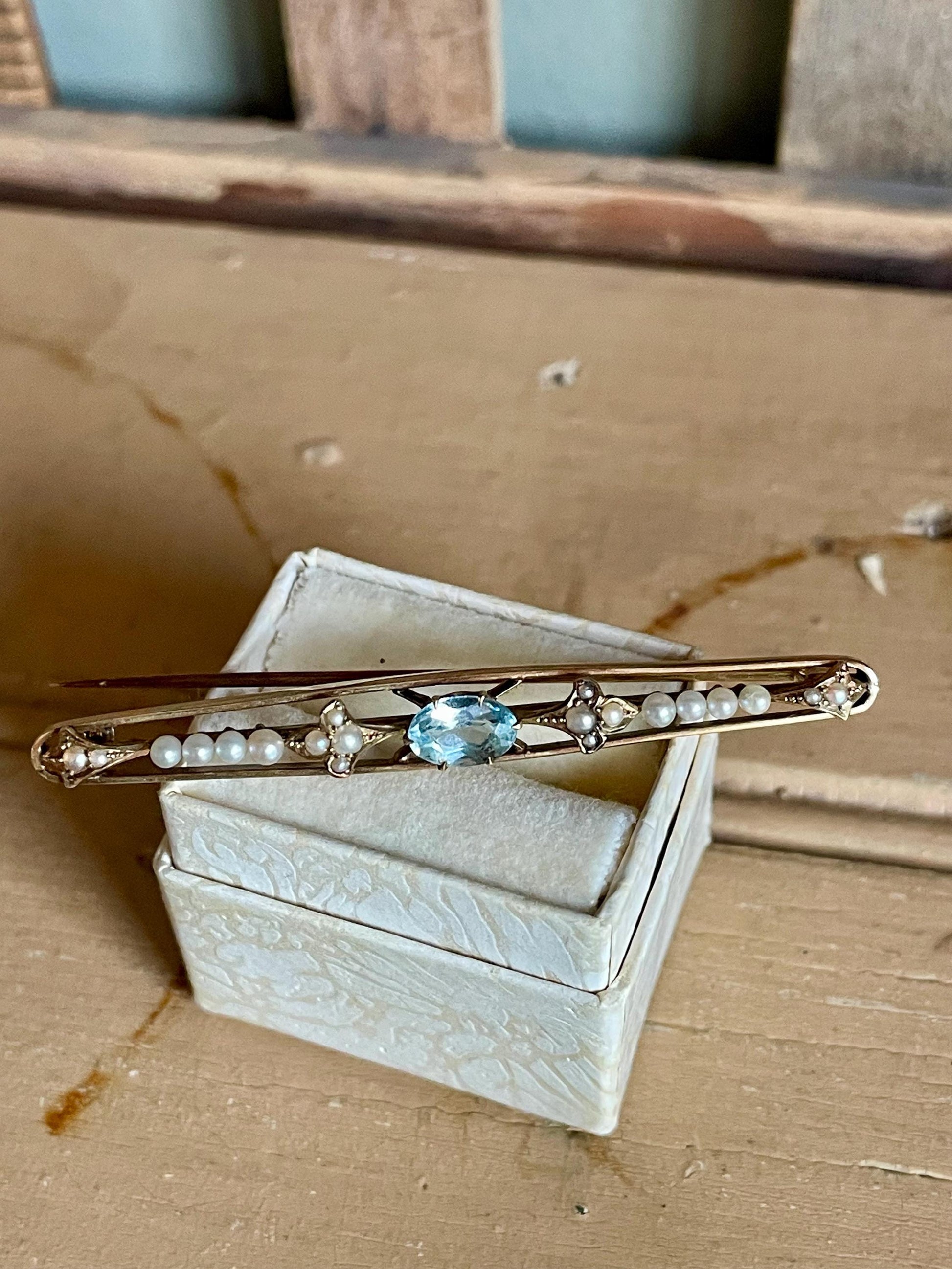 Edwardian bar brooch in 14K yellow gold (marked on clasp and tested). The brooch features an oval aquamarine 7.23 x 4.60 mm approx. .60 ct, set by six prongs. Natural seed pearls post set and bead set throughout brooch. Edwardian style locking c-clasp.