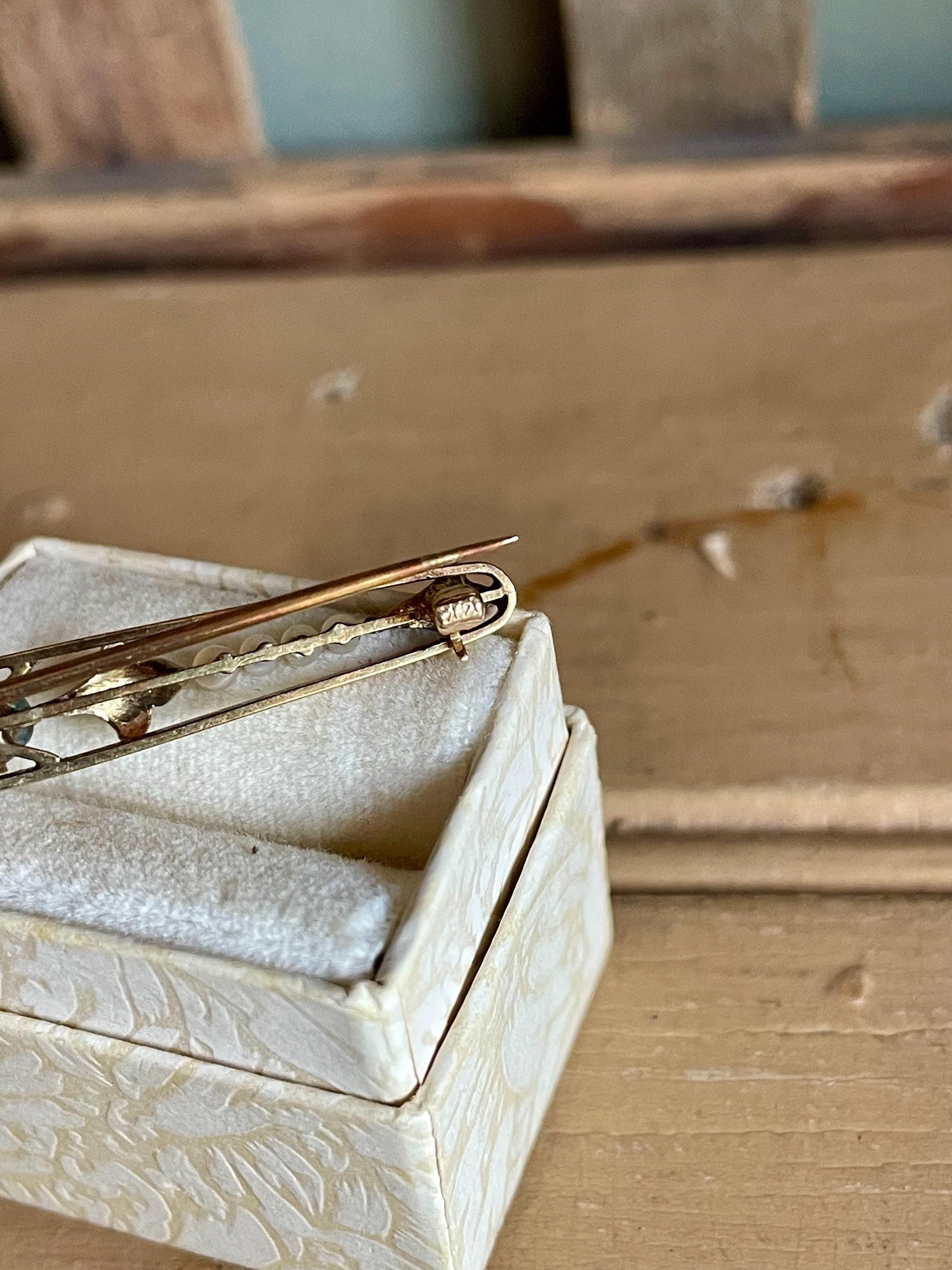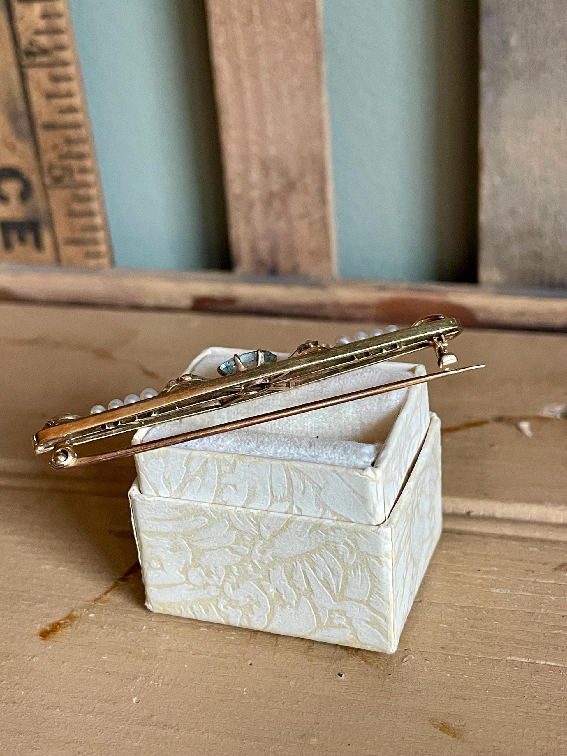 c1915 Edwardian Antique 14K Yellow Gold Oval Aquamarine and Natural Seed Pearl Brooch