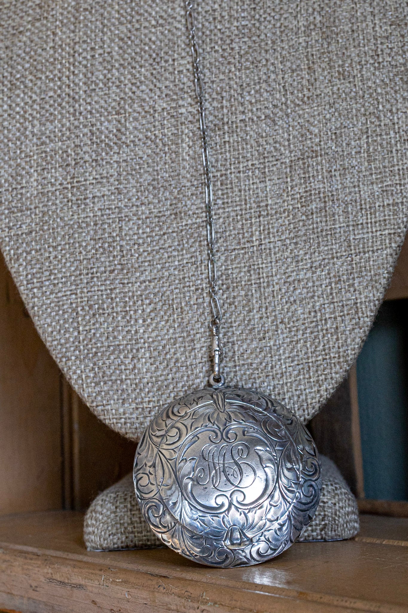c1920 Art Deco Hand Engraved Round Locket Style Compact on Long Chain