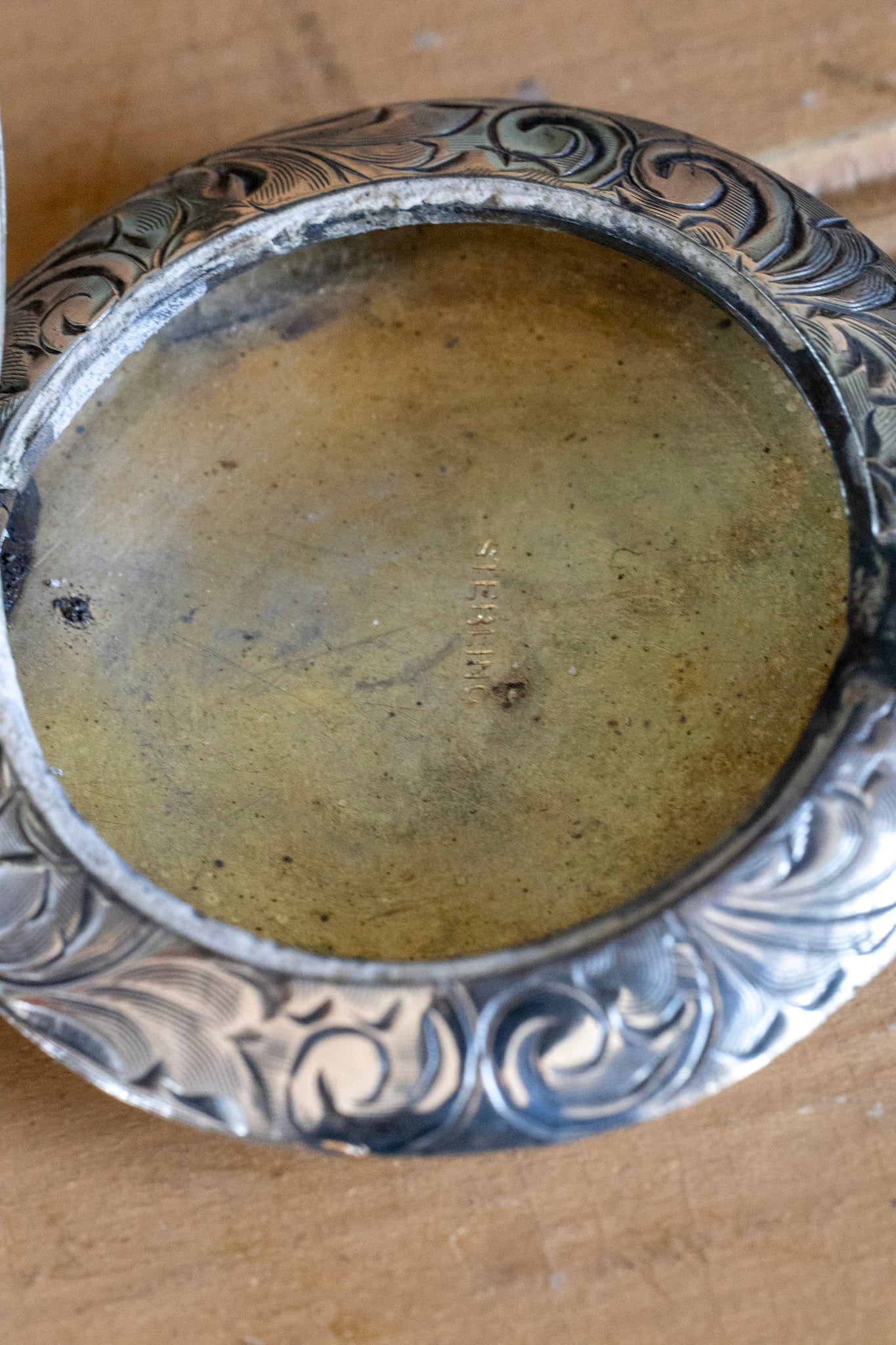 An exquisite original 1920s sterling silver powder compact, beautifully crafted during the glamorous Art Deco era. The round case features intricate hand-engraved floral scrollwork with a classic monogram-style center cartouche, interior has a gold gilt. Compact is 2" diameter. In very good condition-hinge is tight, clicks shut.