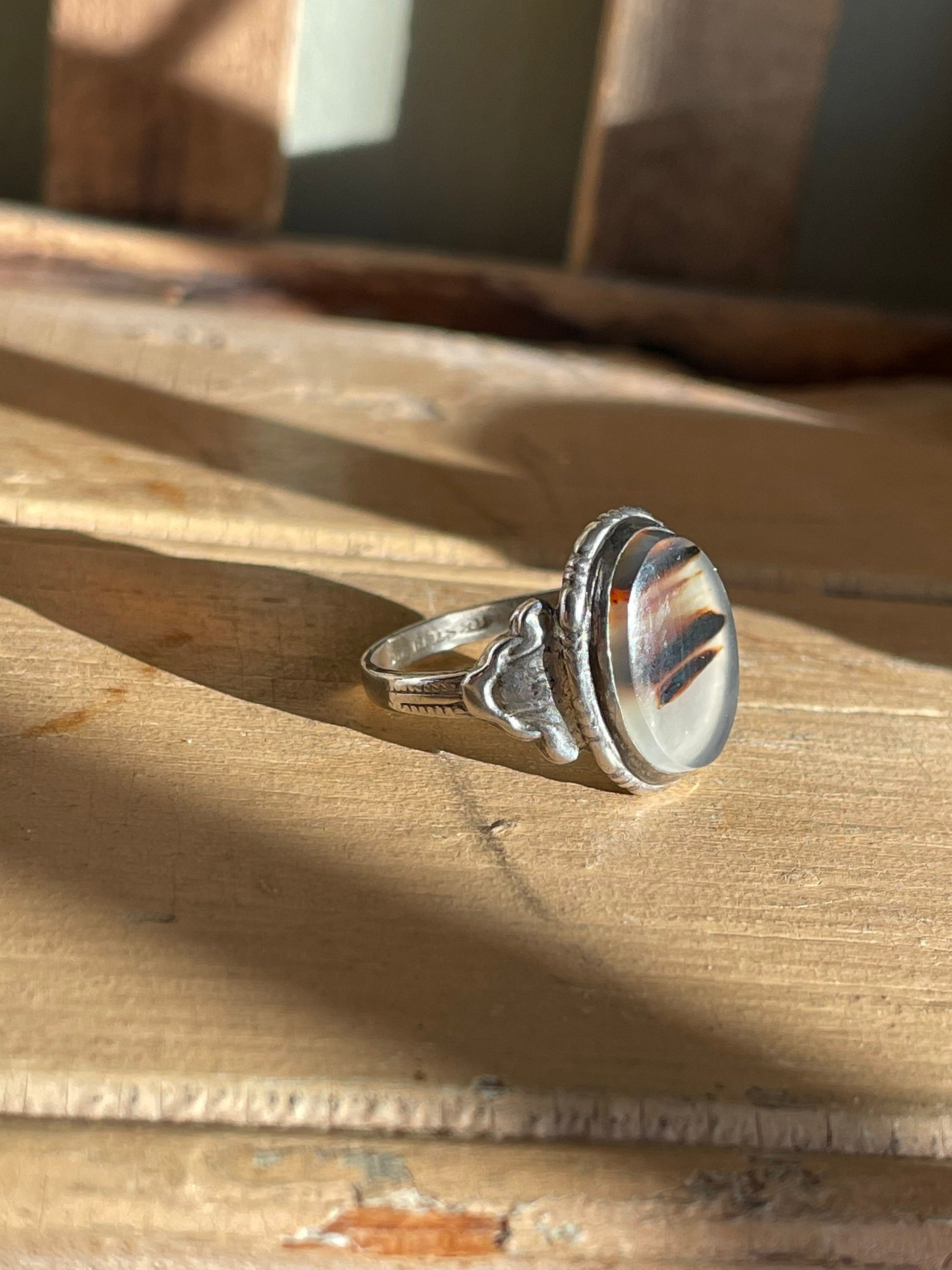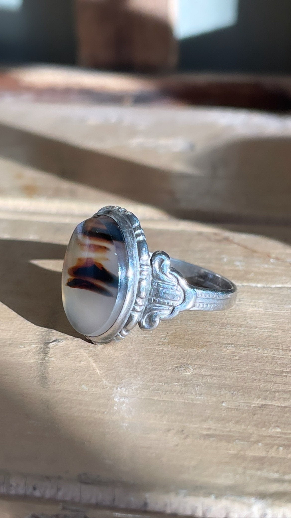 Sterling silver (marked in shank and tested) ring featuring an oval agate measuring approx. 14 x 11 mm, bezel set in decorative frame. Currently a size 6.75 but message me if you need sizing service for an estimate.