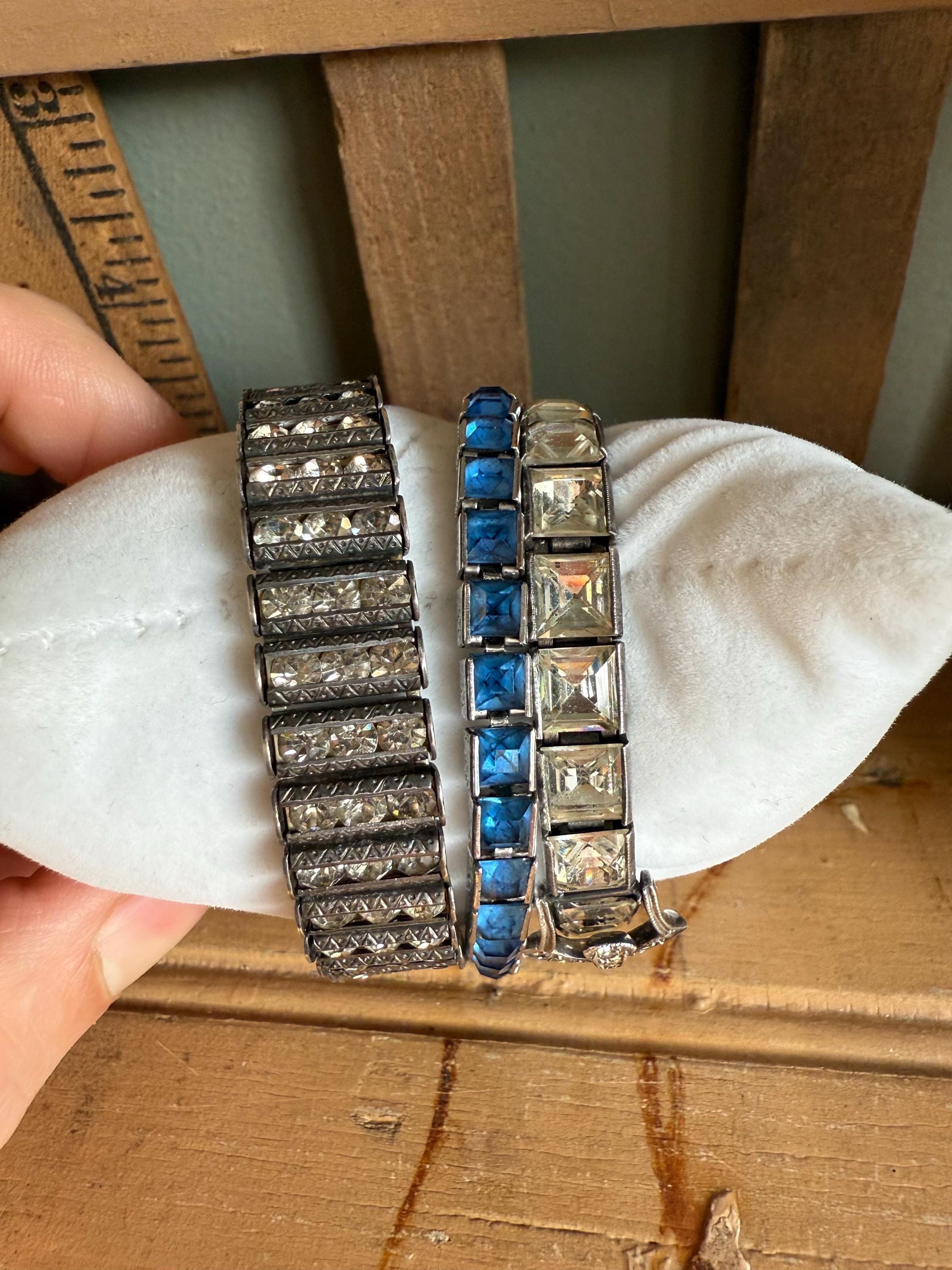 Authentic Art Deco braclets in sterling silver (all are stamped sterling) set with crystal/rhinestones.