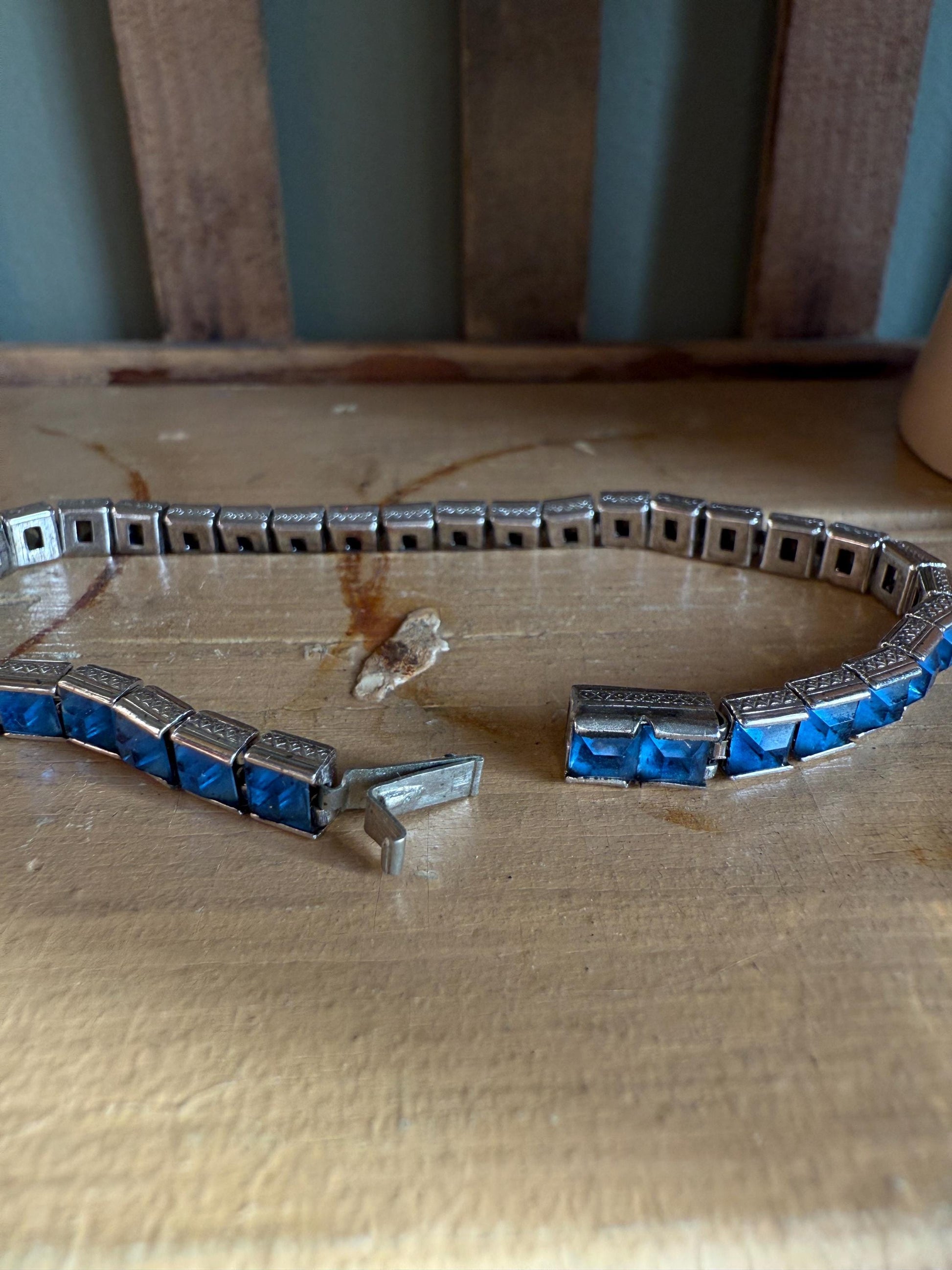 2) Square Cut Blue rhinestone set bracelet, engraved sides, hidden box clasp, 7 1/8" length x 3/16" wide, unpolished.
