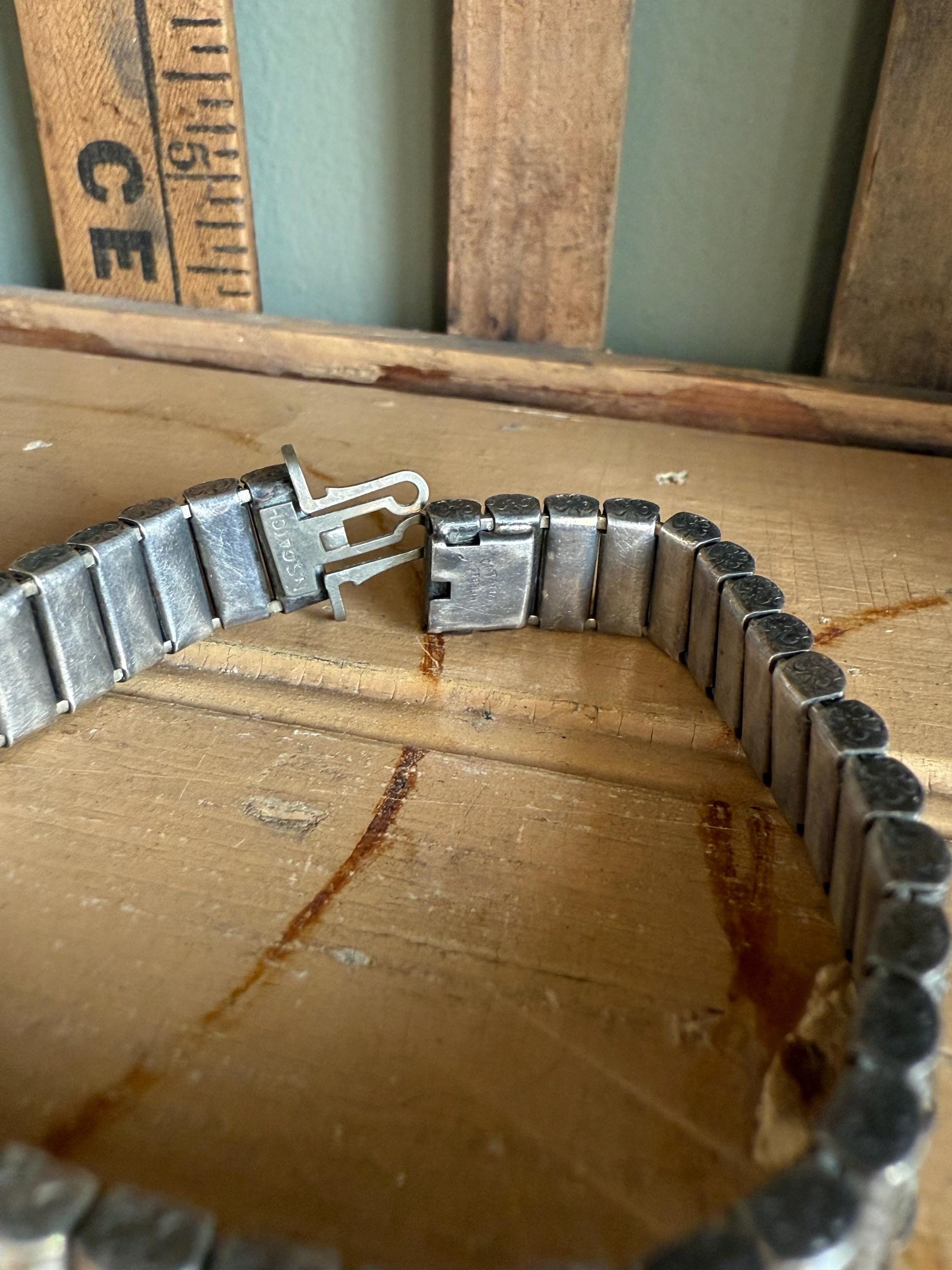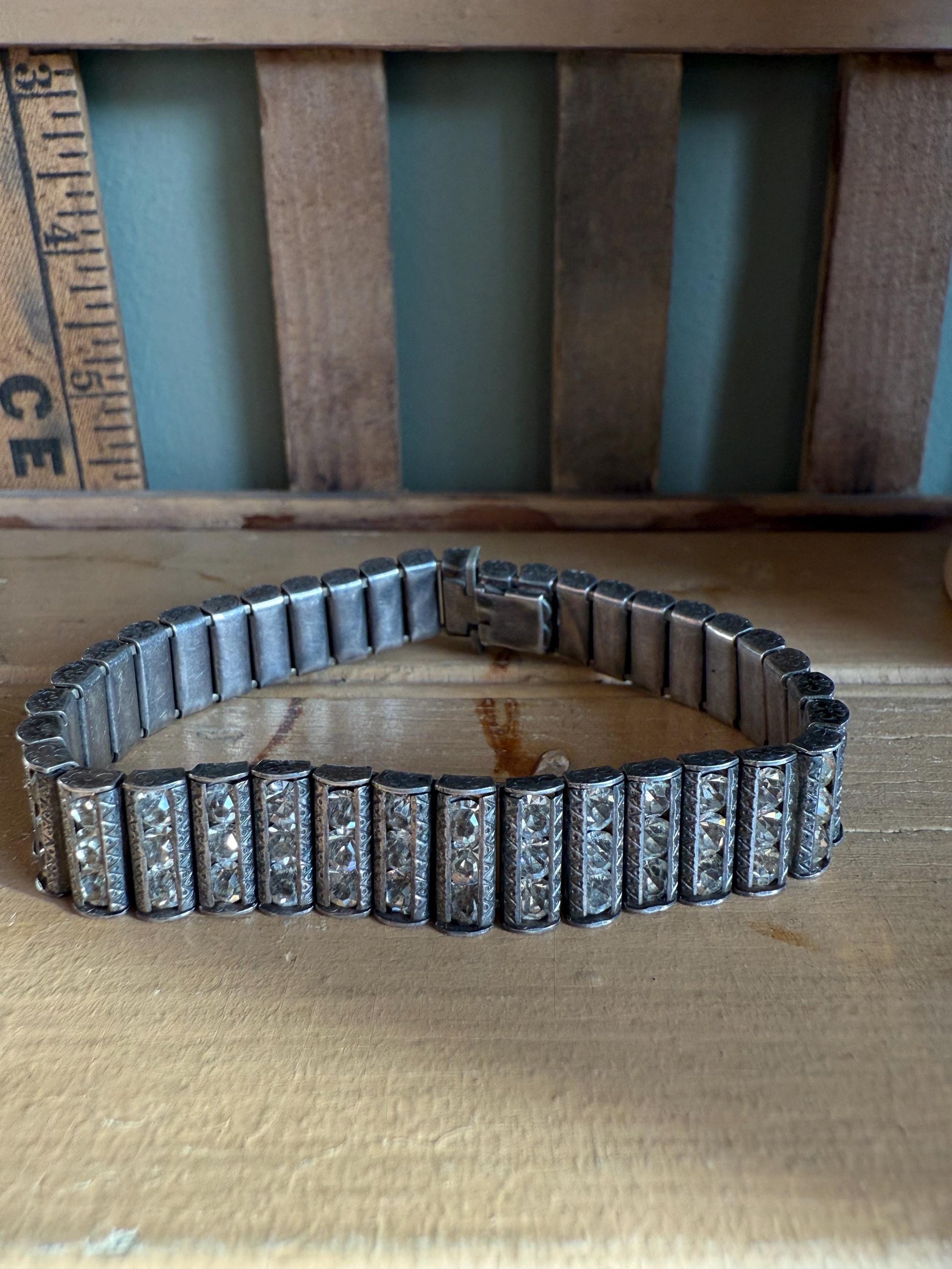 1) Wide Bracelet-Three round cut rhinestones in channel links, channels engraved, sides engraved with flowers, push in hidden box clasp, press side release, has not been polished so it will brighten up with a polishing cloth. Rhinestones are a more silver color. 7" length x 7/16" wide.