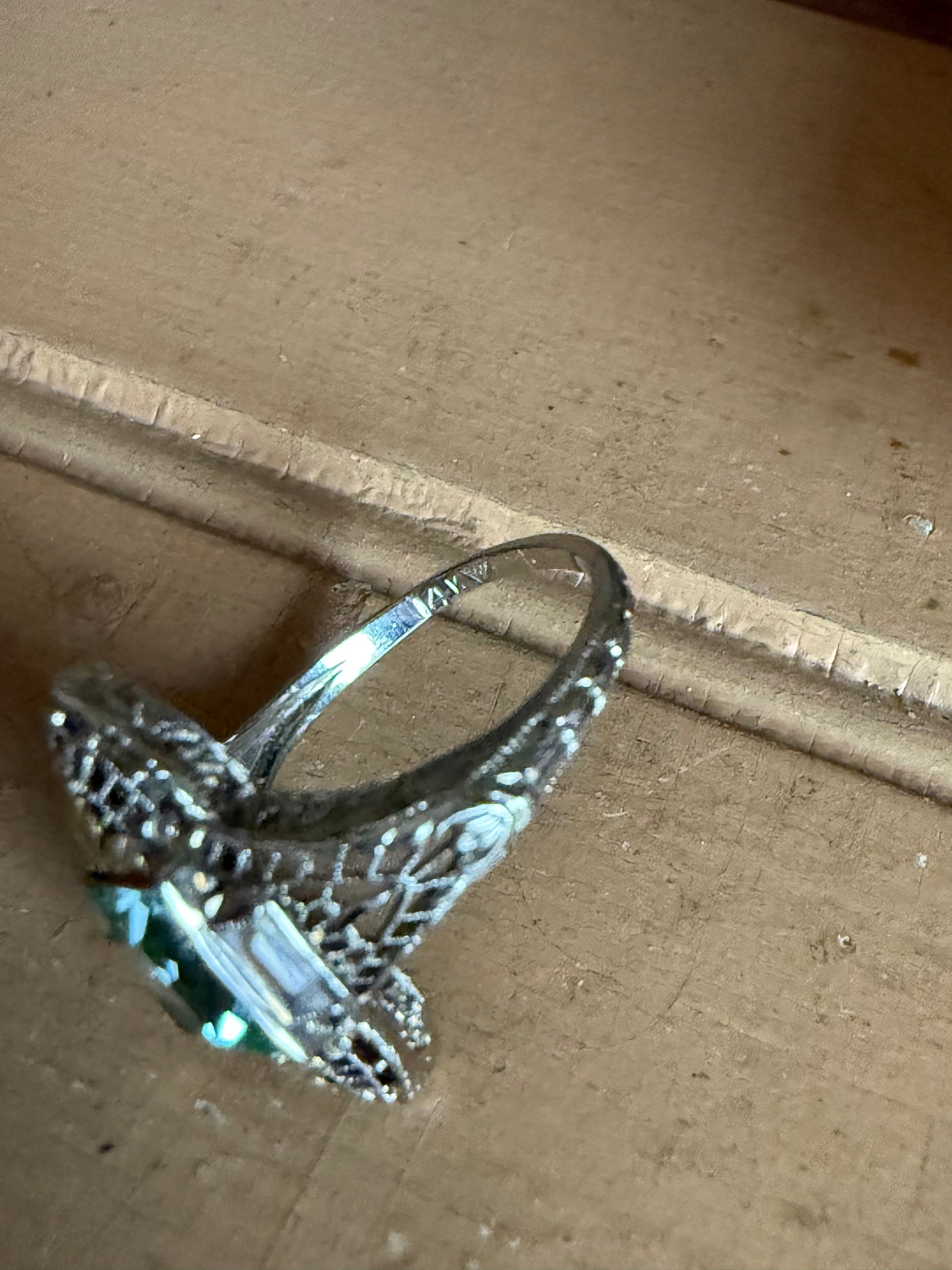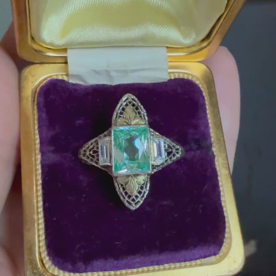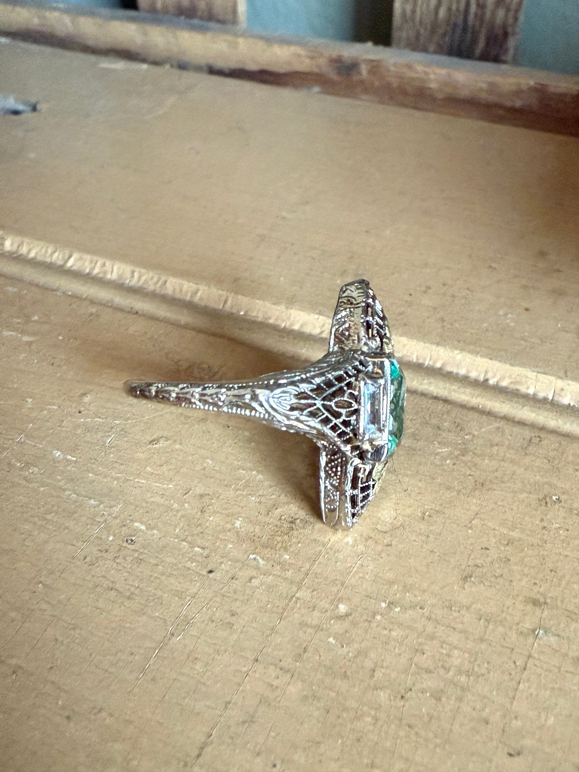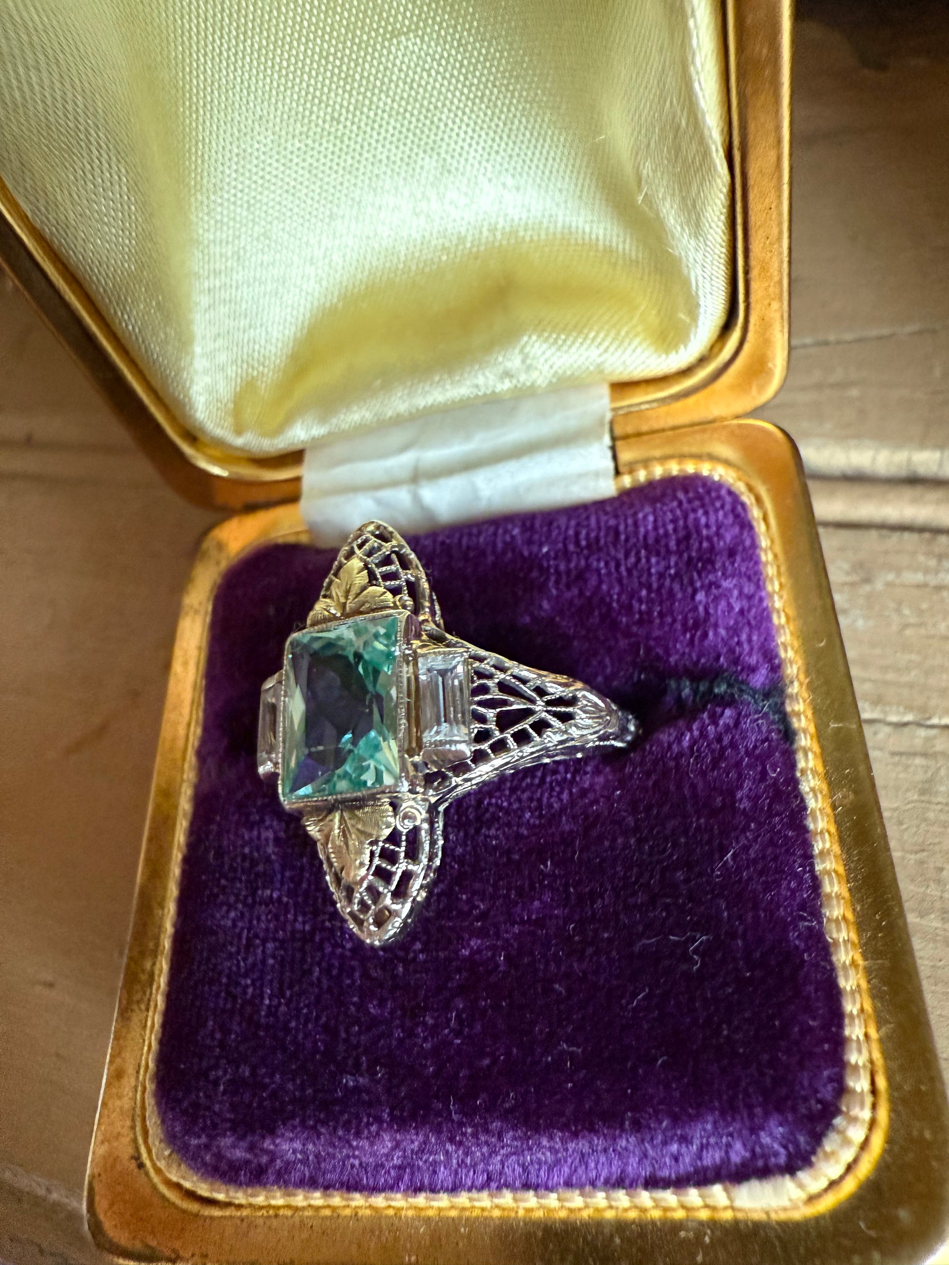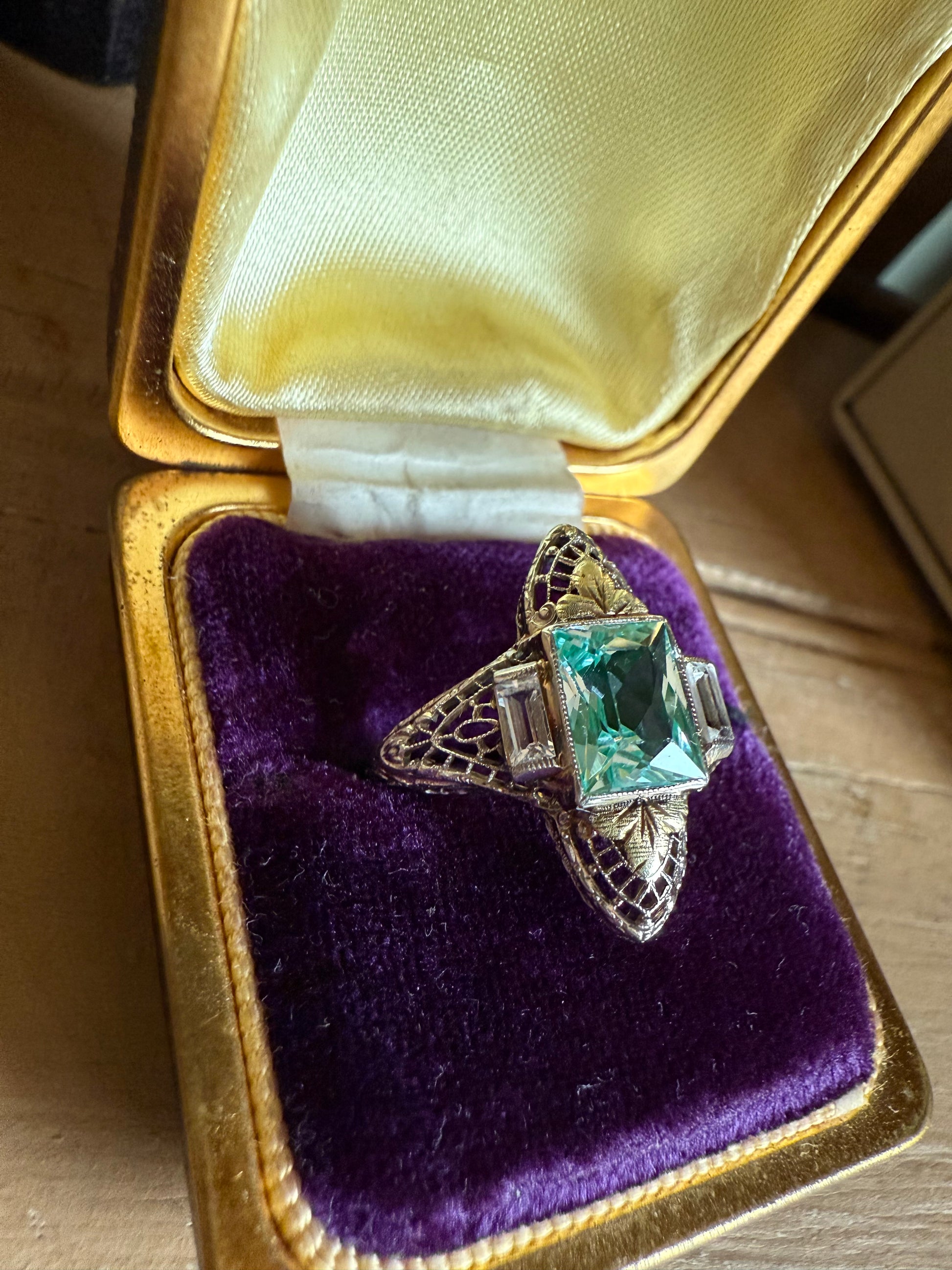 C1940 14K White and Yellow Filigree Aqua and White Spinel Ring