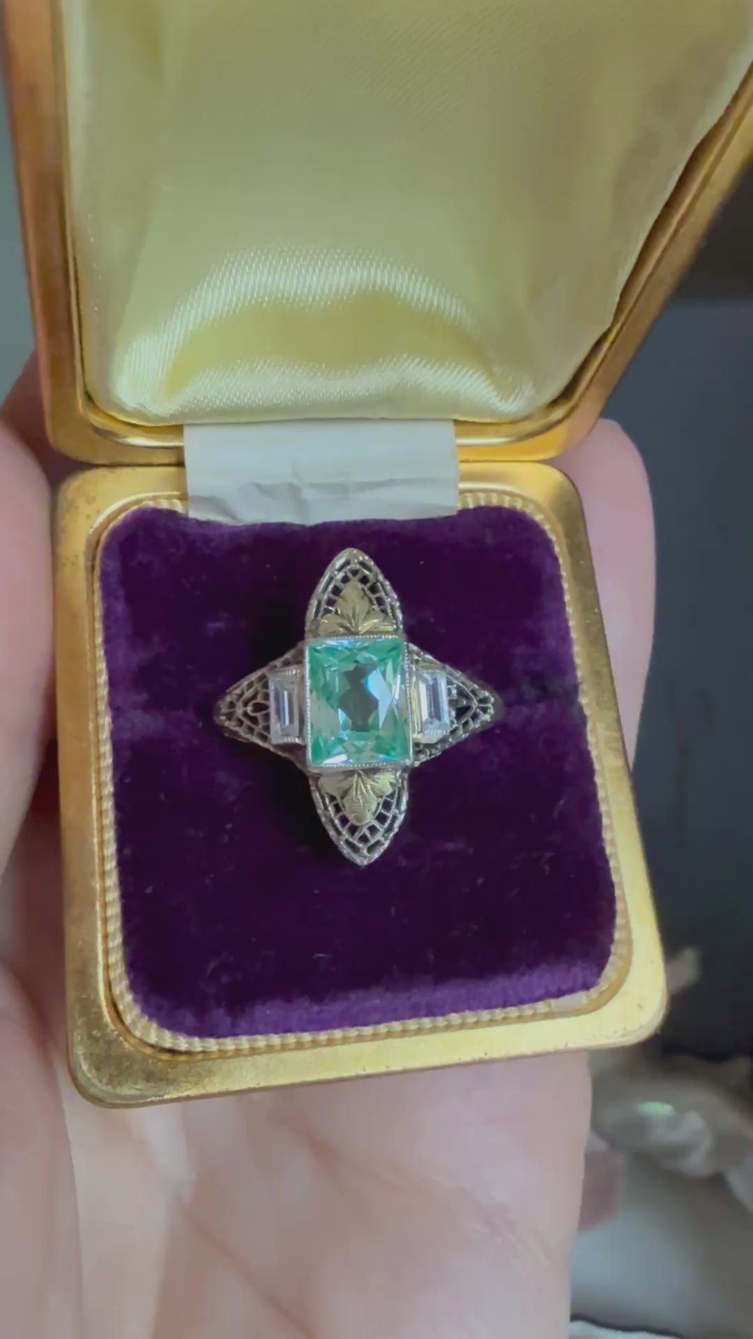 c1940 Late Art Deco period ring in 14K yellow and white gold. The center gemstone is a spinel in a greenish/bluish -intense aquamarine color, measuring 8.6 x 6.6 mm bezel set with a milgrain edge. On each side are two white spinels emerald cut. Gorgeous filigree setting with yellow gold texted leaves on the north and south side of the main stone. Even the shoulders are engraved. Stamped 14K and verified.