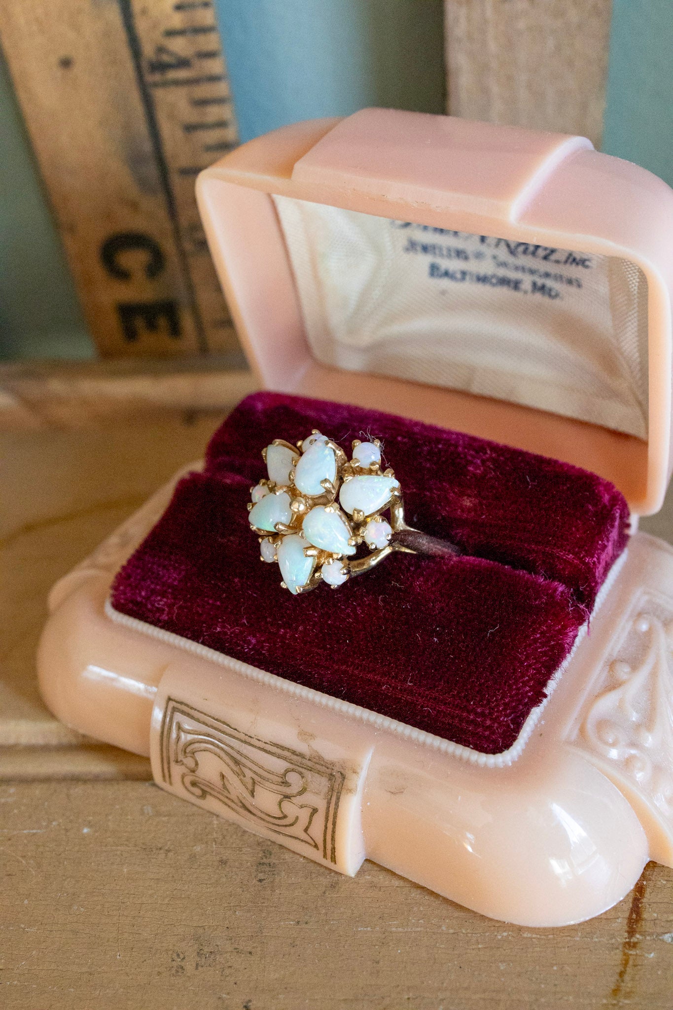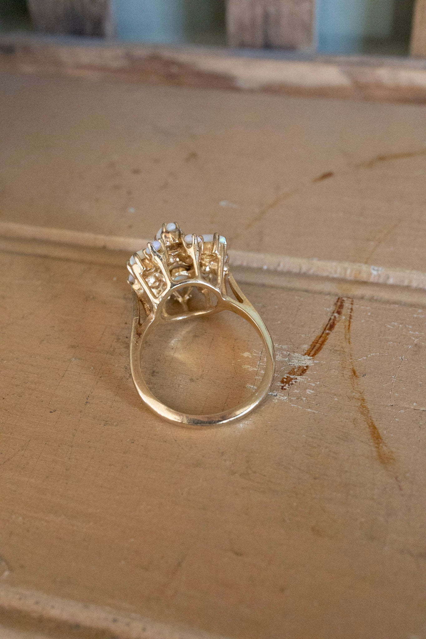 14K yellow gold ring (stamped inside shank and tested) vintage ring dating to the 1970's featuring opals. The opals are round and pear cuts with play of color in blues, greens and purples. All gemstones are prong set and in very good preowned condition.