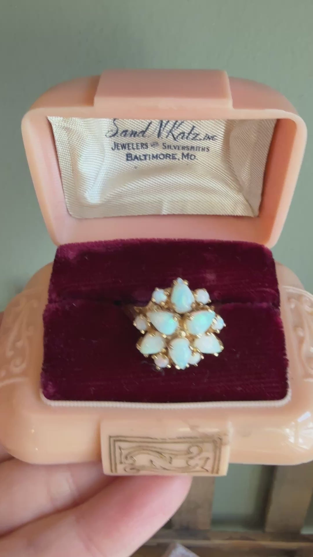 The front measures 5/8" wide and the opals sit up off the finger approx. 1/2". Dramatic setting.