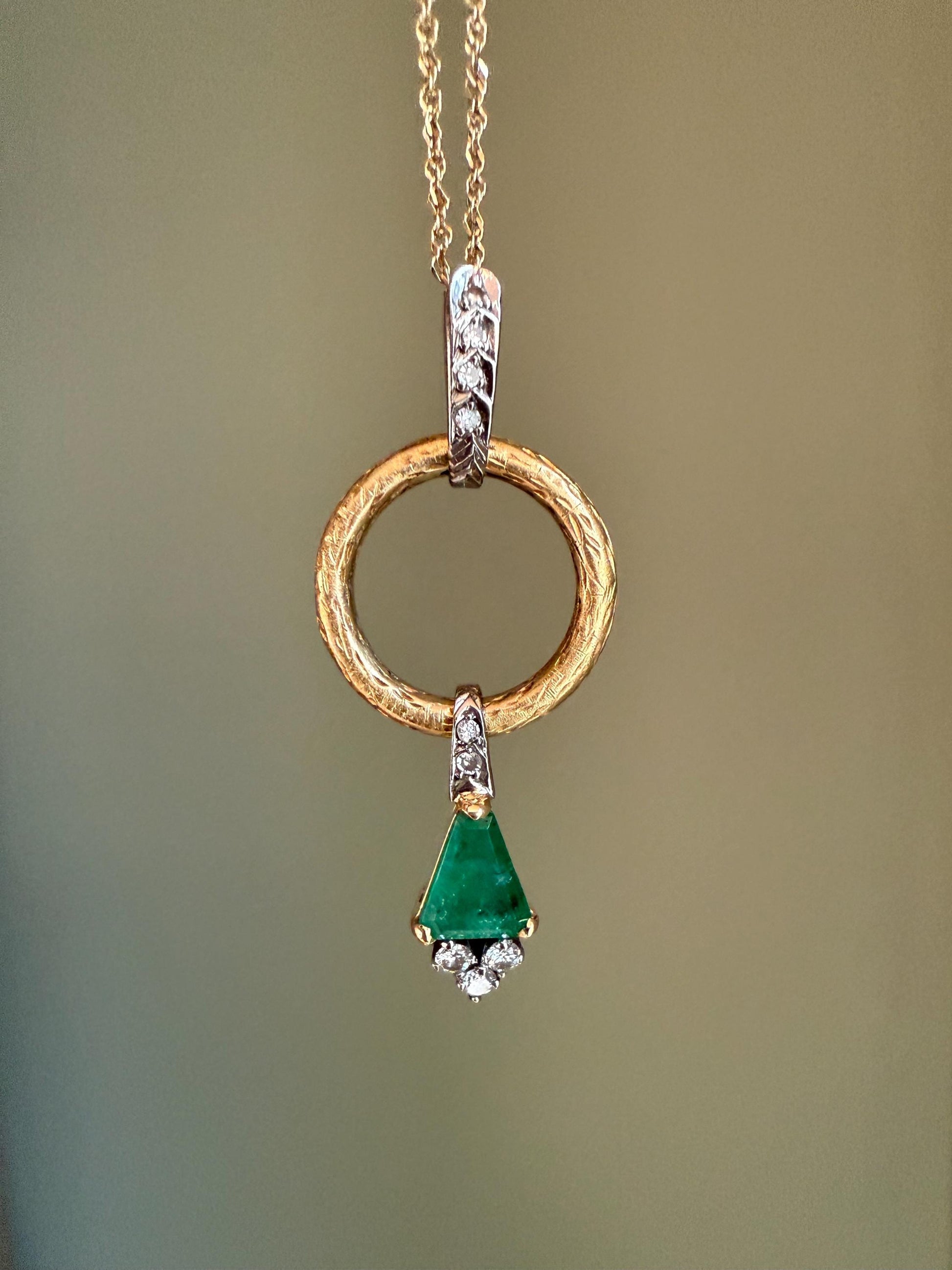 Vintage unique custom designed pendant. The pendant features a tapered baguette cut natural emerald, slightly bluish green-med dark hue. Measures approx. 6.5 x 5.6 mm, about 1 ct, with three round cut diamonds weighting approx. .06 cts at the bottom and two round cut diamonds at the top (all set in white gold). The emerald freely moves along the 5/8" diameter engraved ring, at the top is a white gold bale set with additional round cut diamonds. Top to bottom 1 1/2" length.
