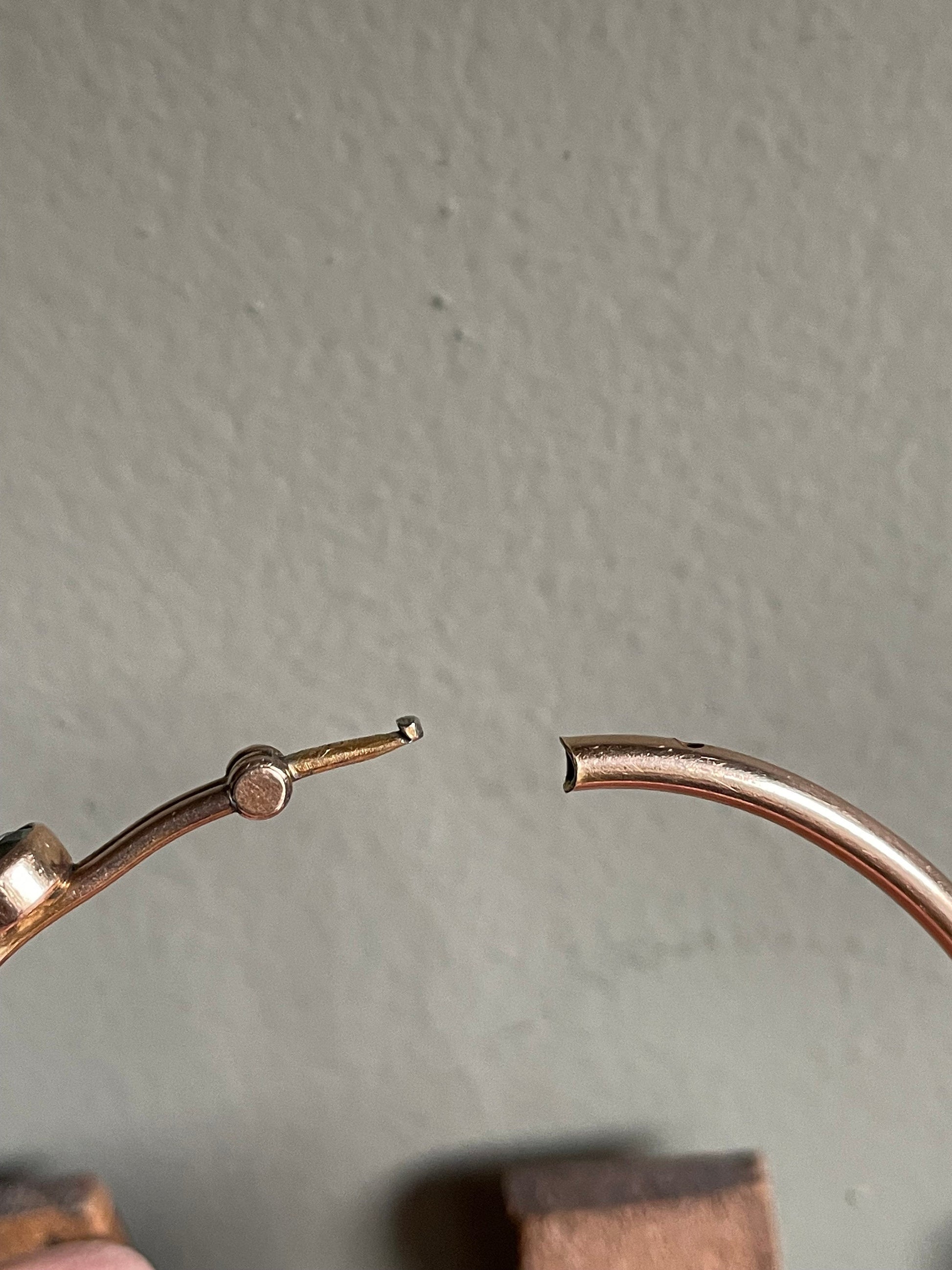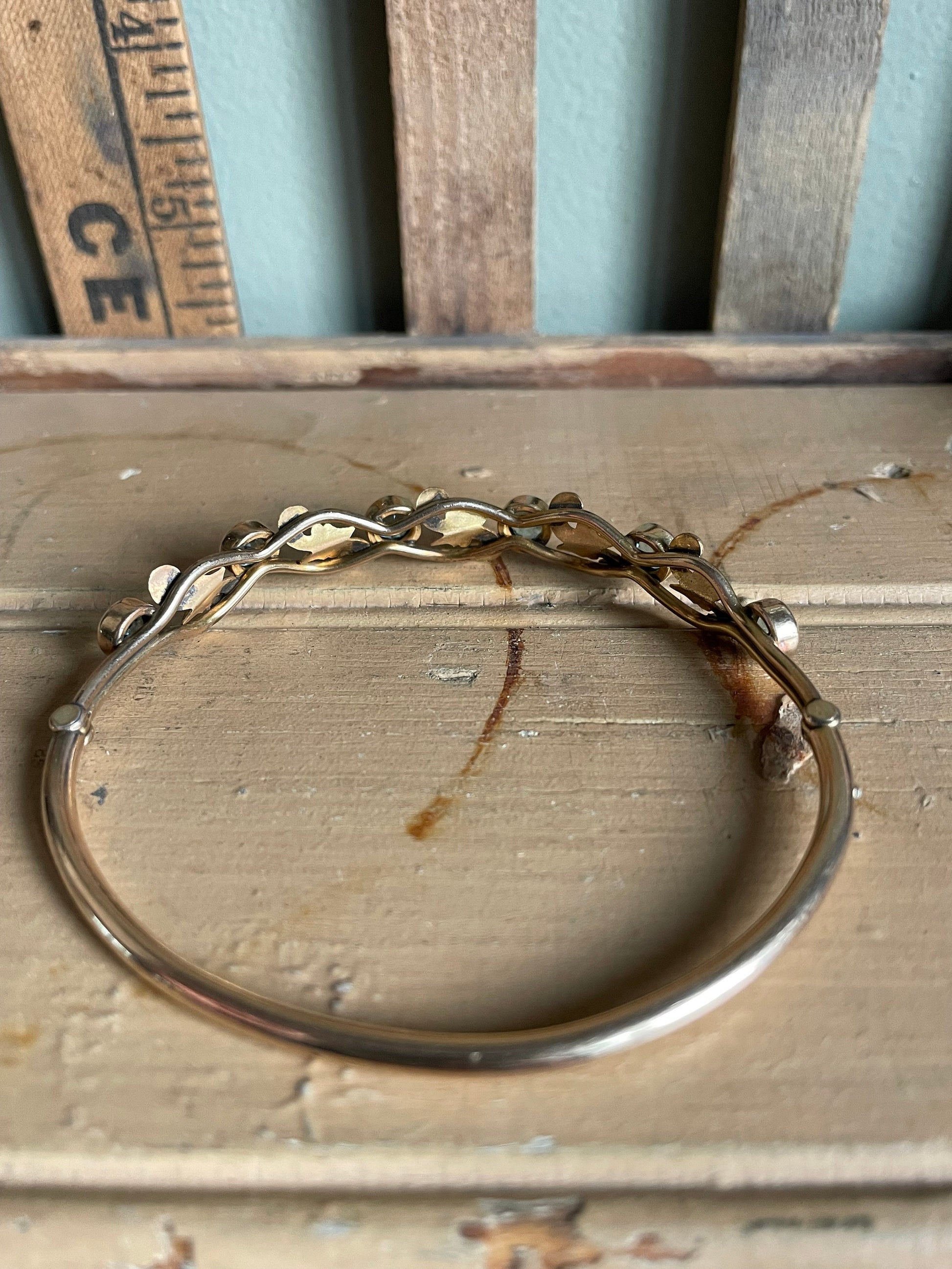 Gorgeous blue imitation zircon bezel set in a scrolling foliage motif. The bangle closes by hook. Will fit a wrist up to 7.75". Note it is a tad out of oval and under magnification there is some abrasions to the facet junctions but overall very good condition. 9.14 mm wide.