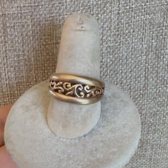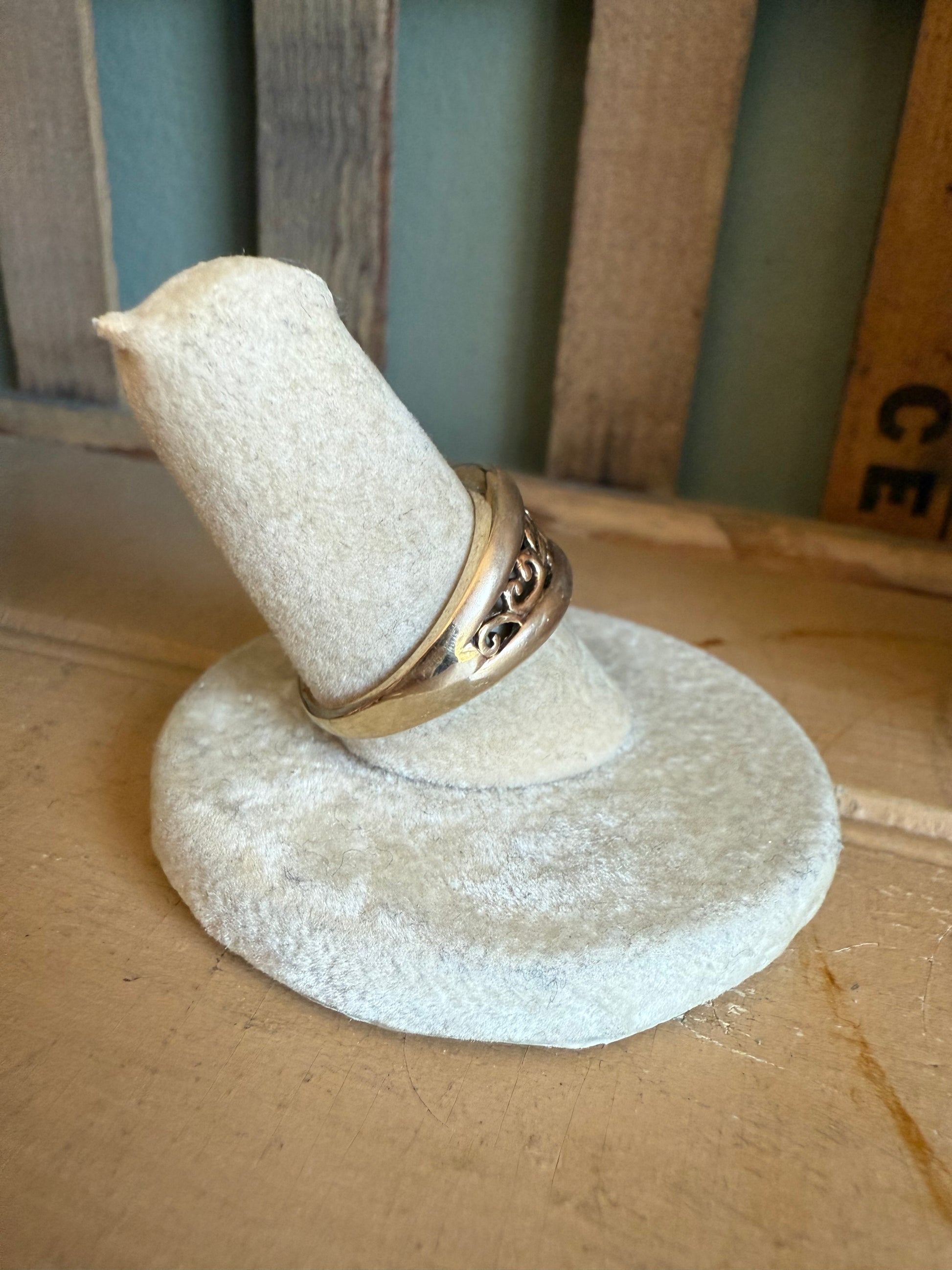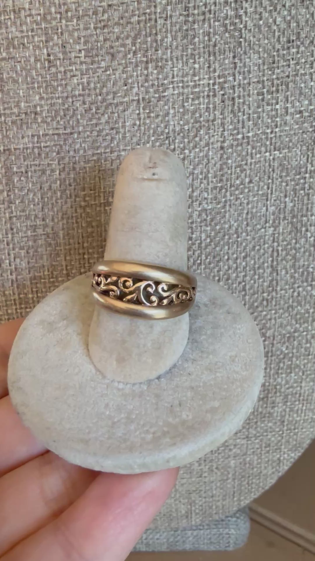 c1990 Stamped 10K (and verified) pierced scrollwork band. The edges have a stain polish. The front is 7/16" wide. The back is 1/8" wide. Currently a size 8 but message up for sizing service cost. 3.6 grams
