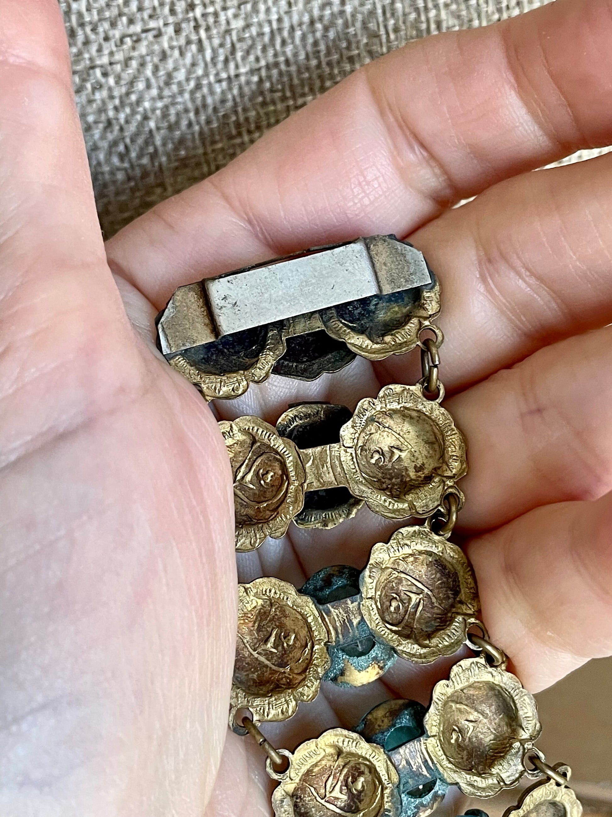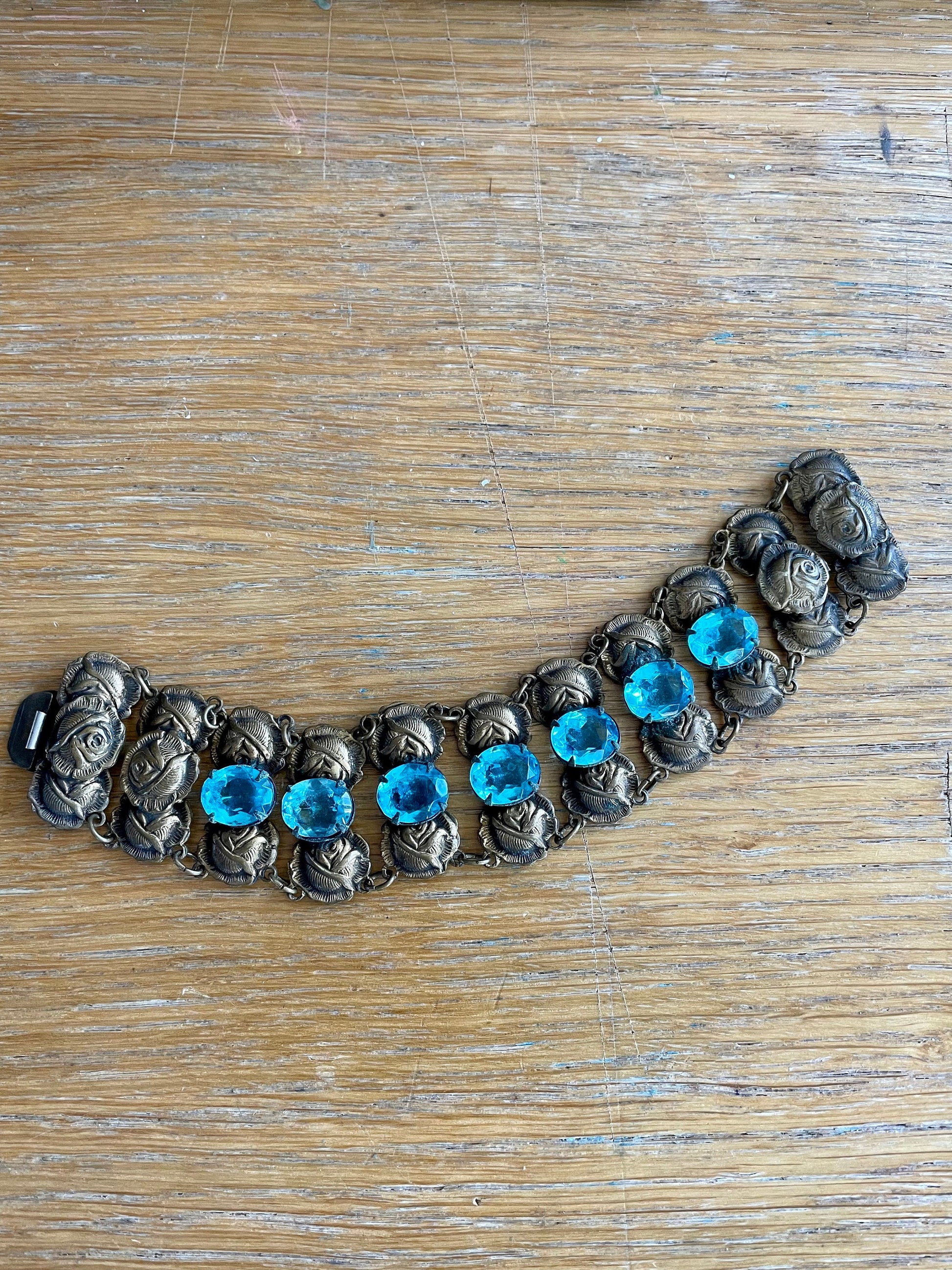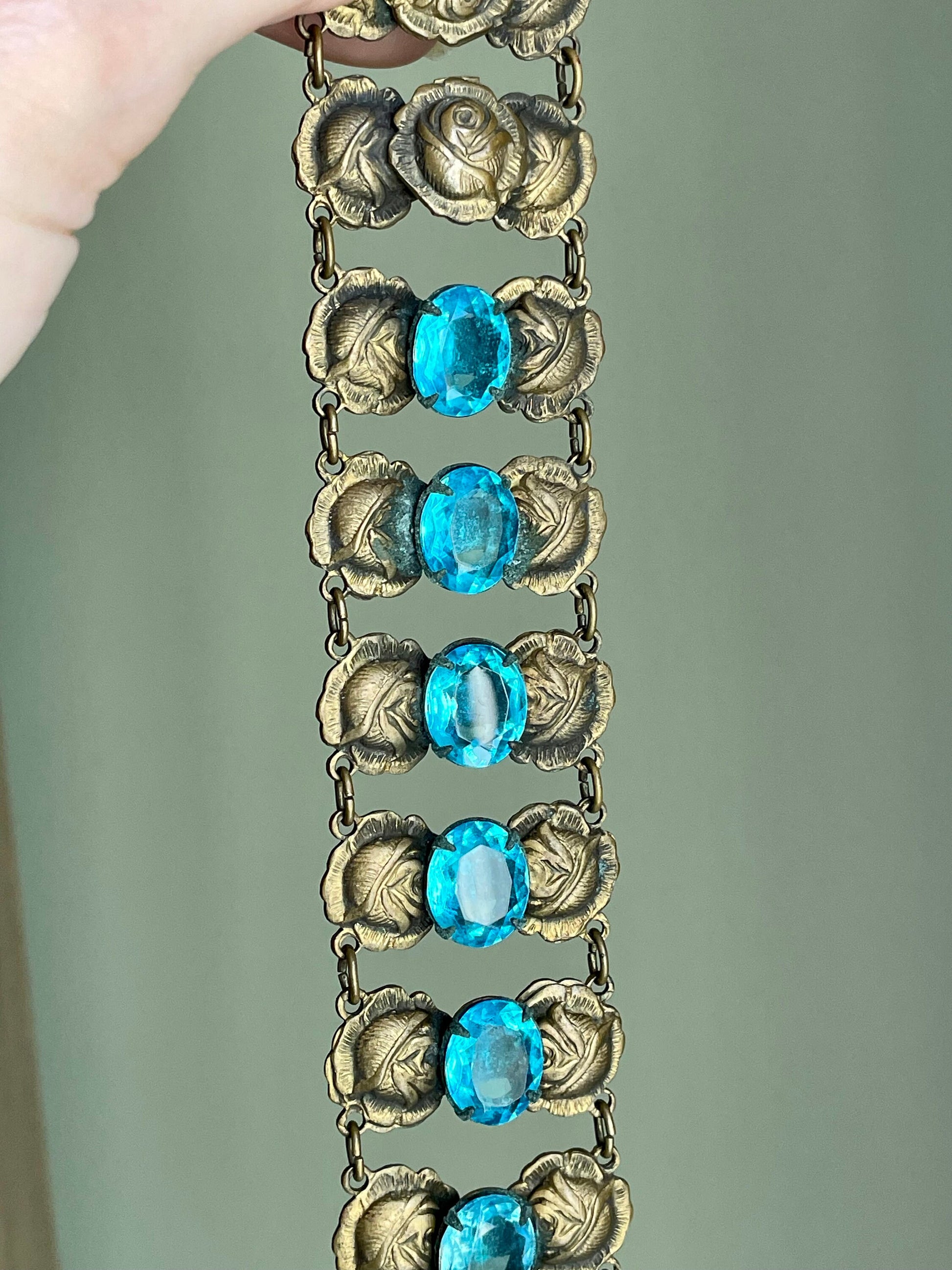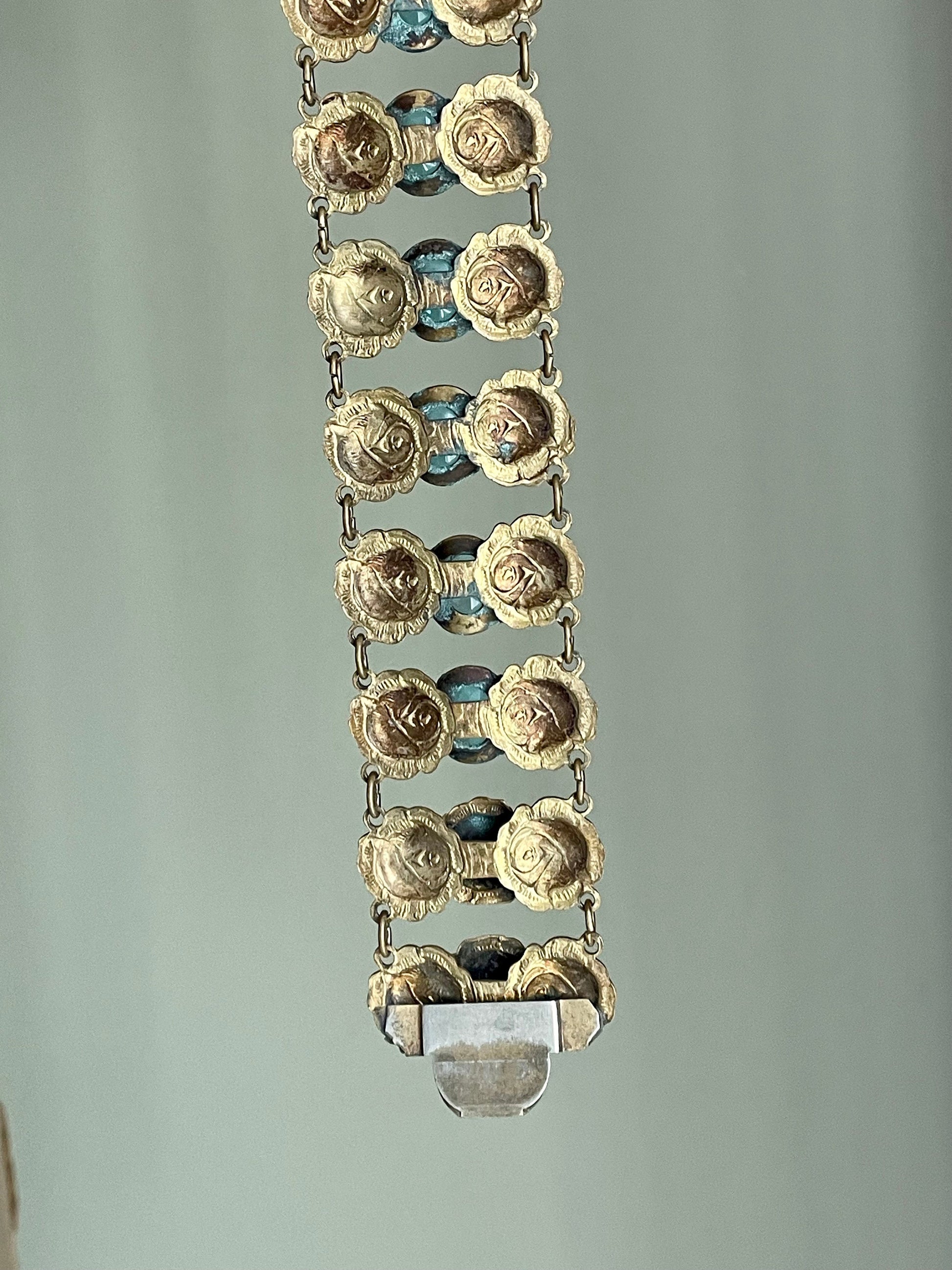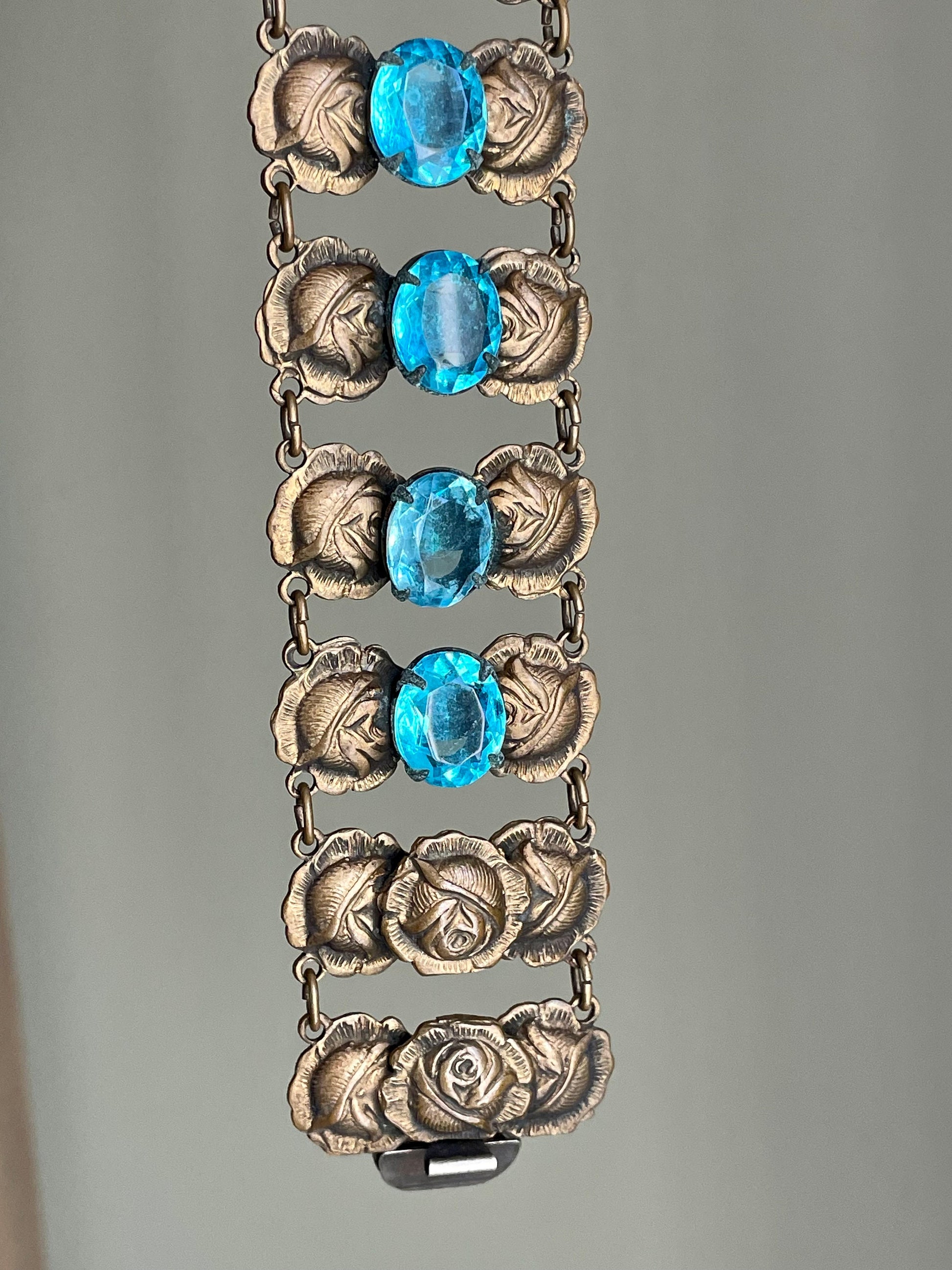A wide link bracelet featuring oval aquamarine color glass measuring approx. 12 x 10 prong set in links with rose motifs. The metal is a brass alloy mixture. 1 1/8" wide and 7.25" length. The condition is very good-just normal aging. The glass is still bright and sparkling. Hidden box clasp.