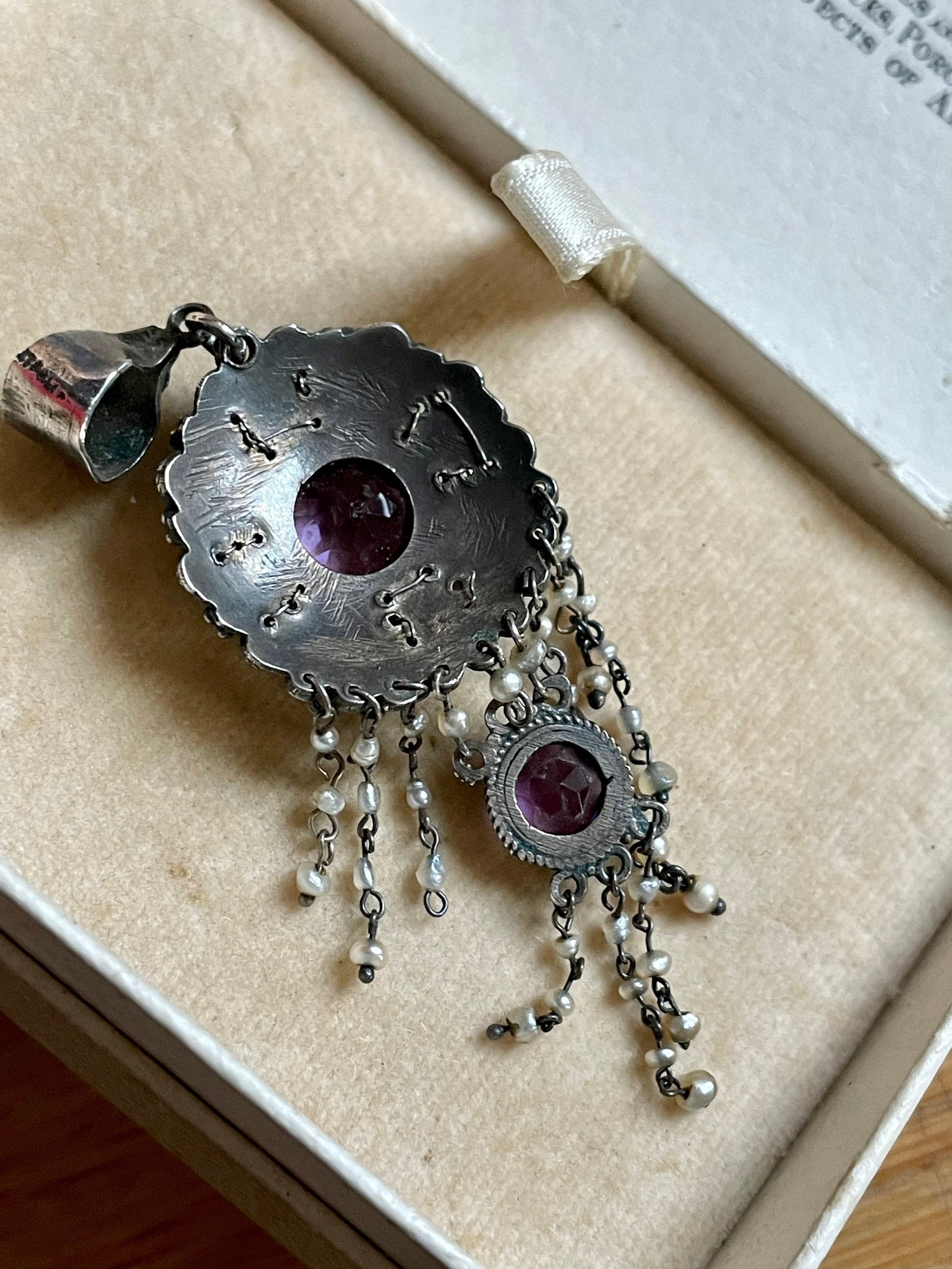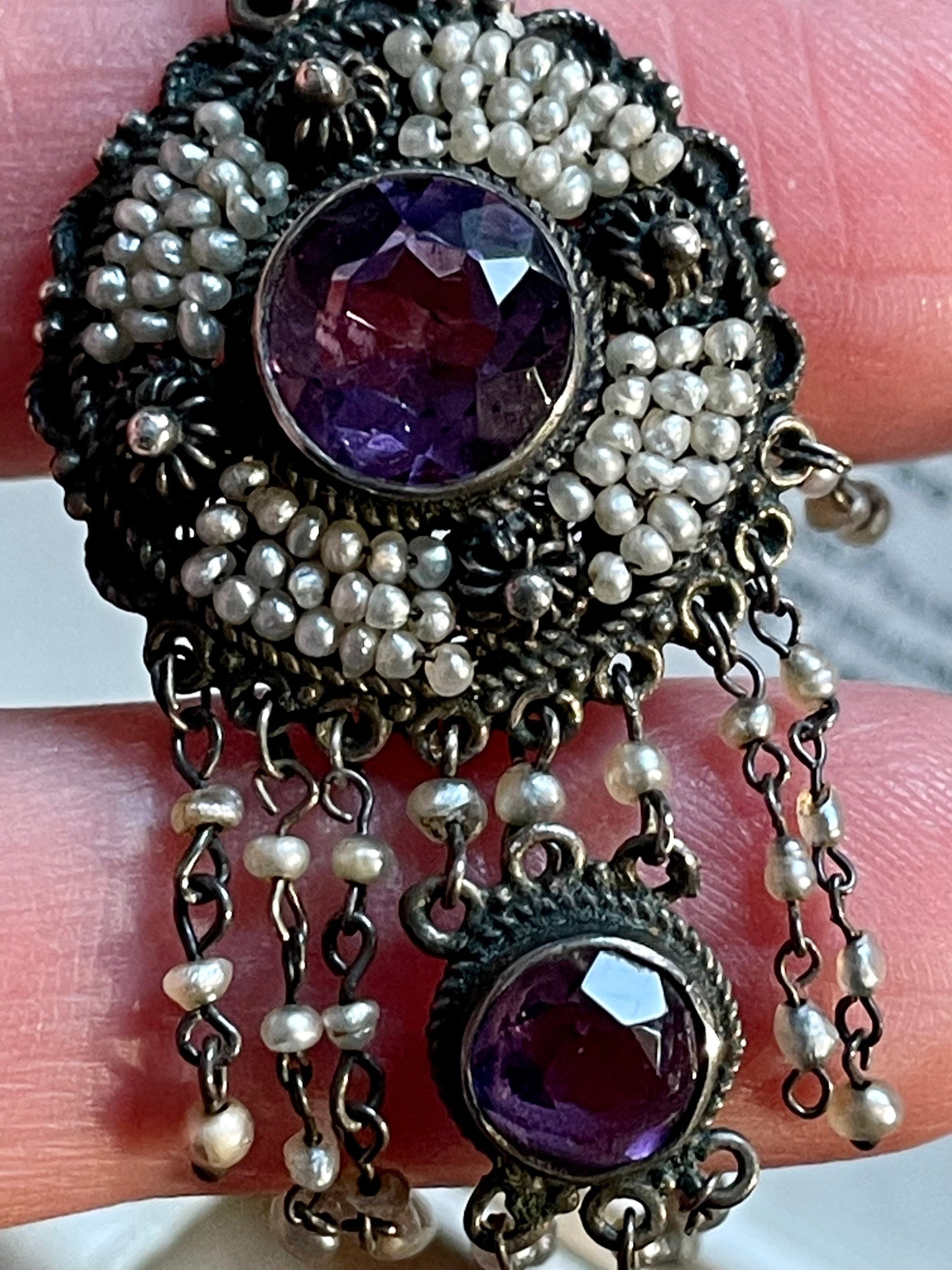 I date this to late Victorian / Art Nouveau. There are two round faceted amethyst measuring approx. 8 and 6 mm. The gems are bezel set. Around the largest amethyst is wire set seed pearls and wirework rosettes. The frame is decorative and has pearls dangling. There is a dangling amethyst with more seed pearl dangles. The bale is original and is decorated with wirework. It is nice an large to fit a thicker chain.