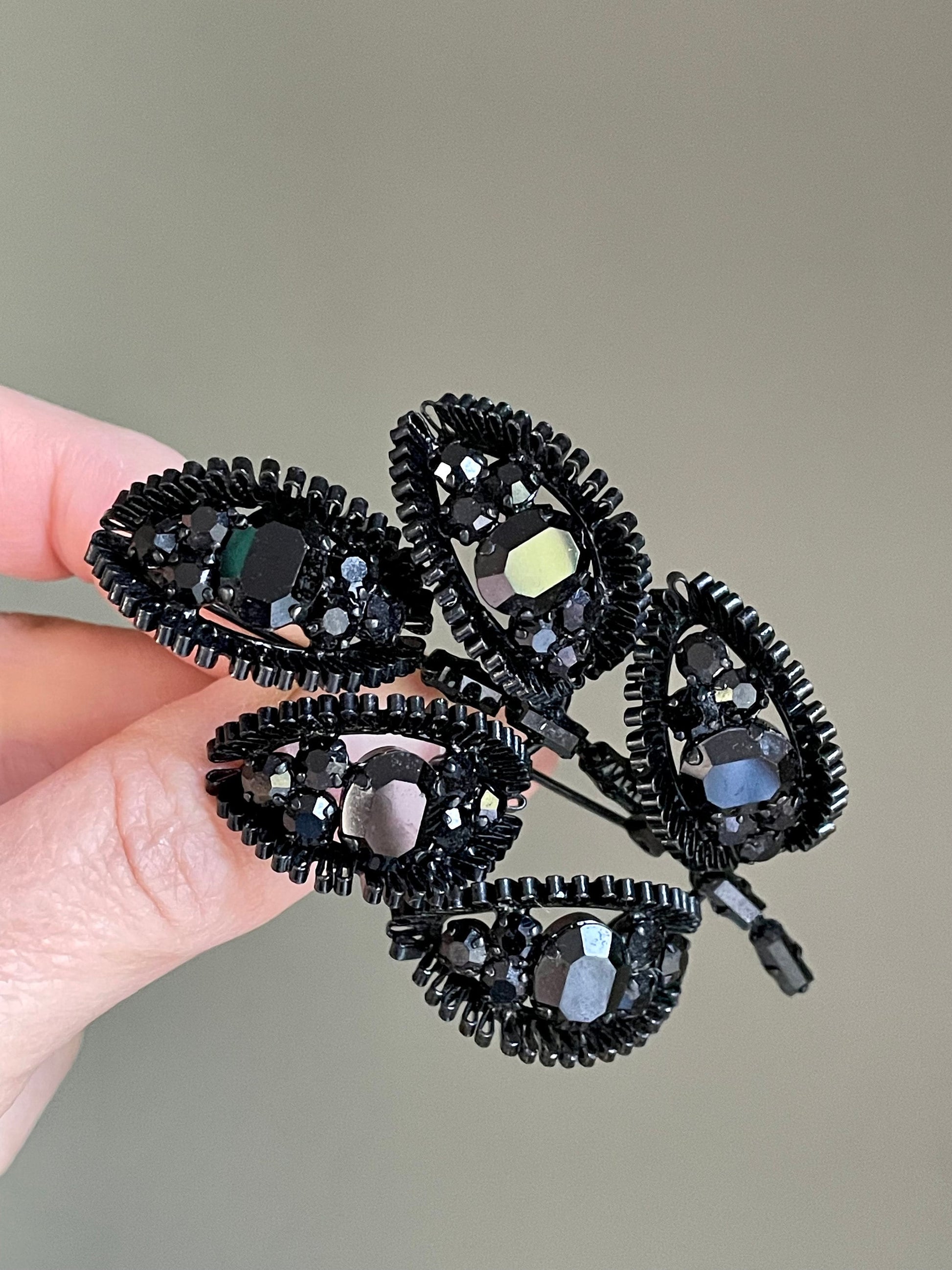 Not your typical mid century brooch. Made by Weiss (makers mark on back) in the mid century this brooch is quite large measuring 3” in length and highly decorative. Black faceted glass mimic the victorian era’s French jet. The glass is prong set. Note the wire work around the edges of the leaves. There are rectangle cut black glass prong set on the stem. It’s dramatic and high end looking. It’s like holding a piece of art in your hand. 1.75 inches wide.