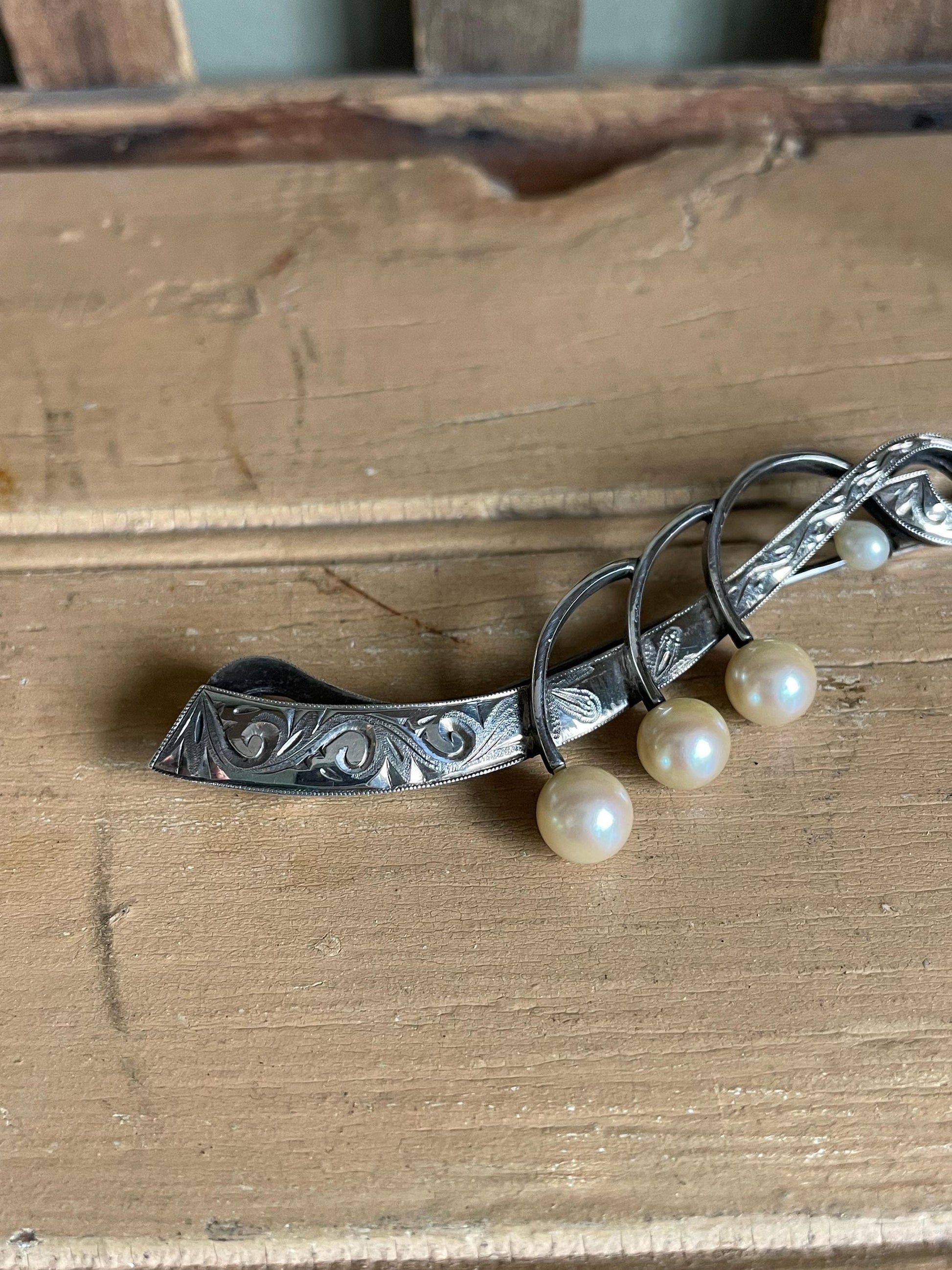 1950's - 950 silver (abover sterling silver) brooch featured an engraved ribbon with four pearls set on posts. The pearls range in size between 3.92-7.20 mm. The pearls have a cream hue. Trombone clasp in good working order. 3" length x 1" wide.