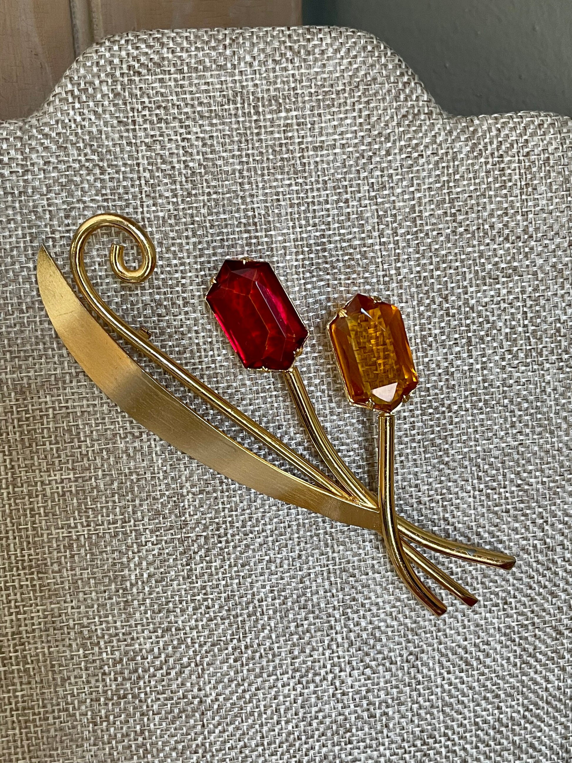 Rich gold tone with faceted red and yellow glass stones prong set in a stylized flower motif. Very good condition. Leaf has a brushed finish. Safety clasp in good working order.