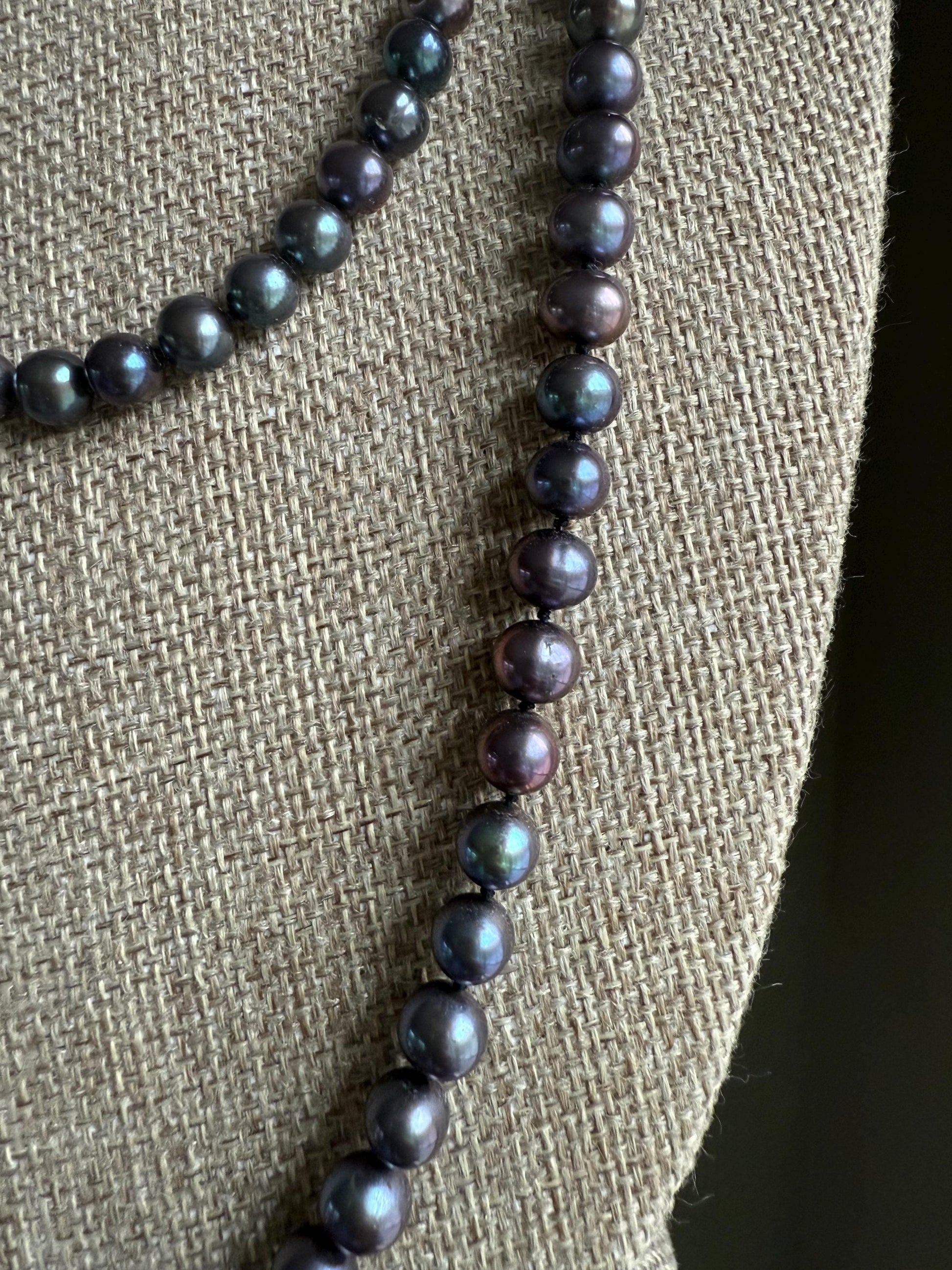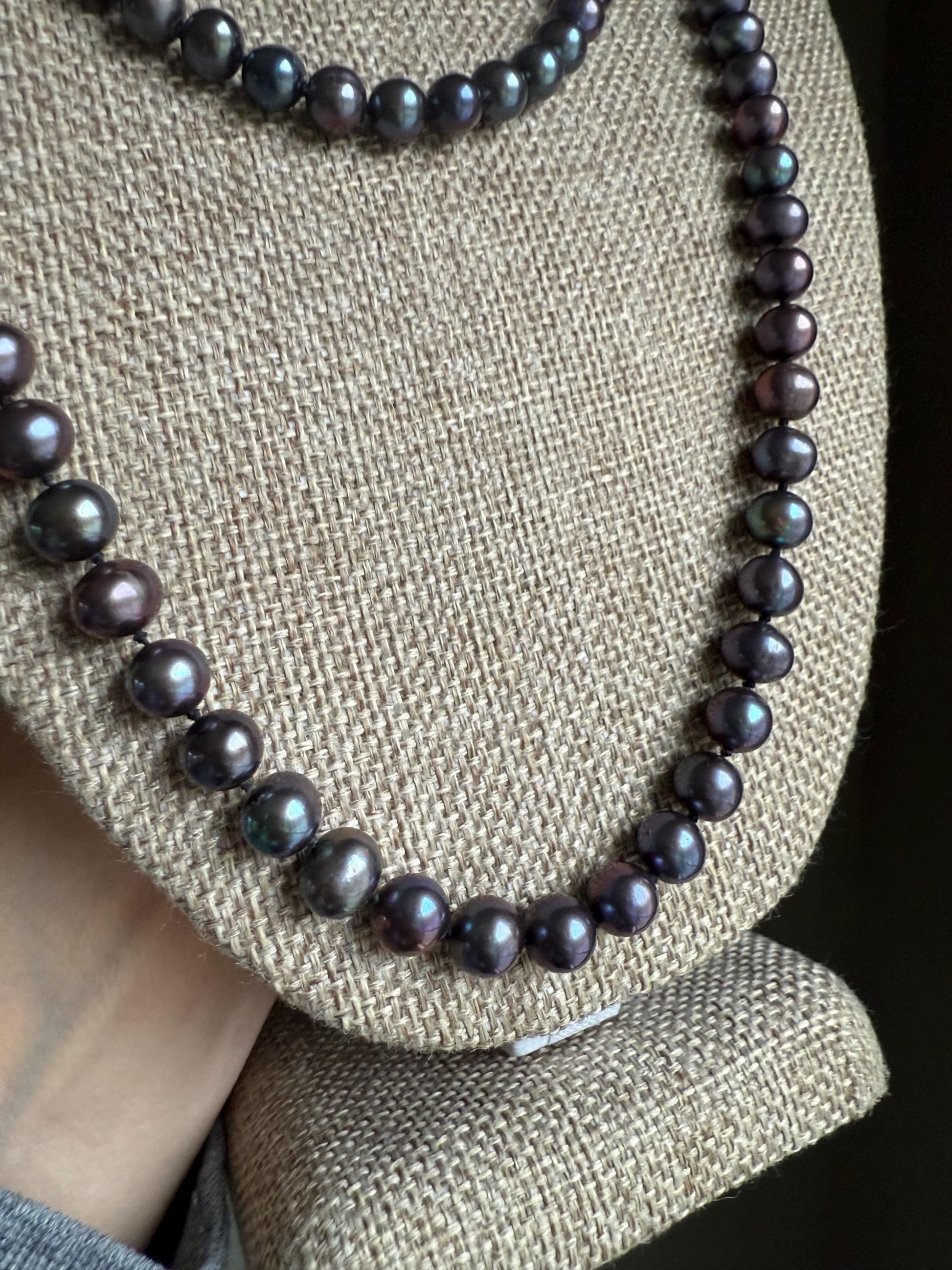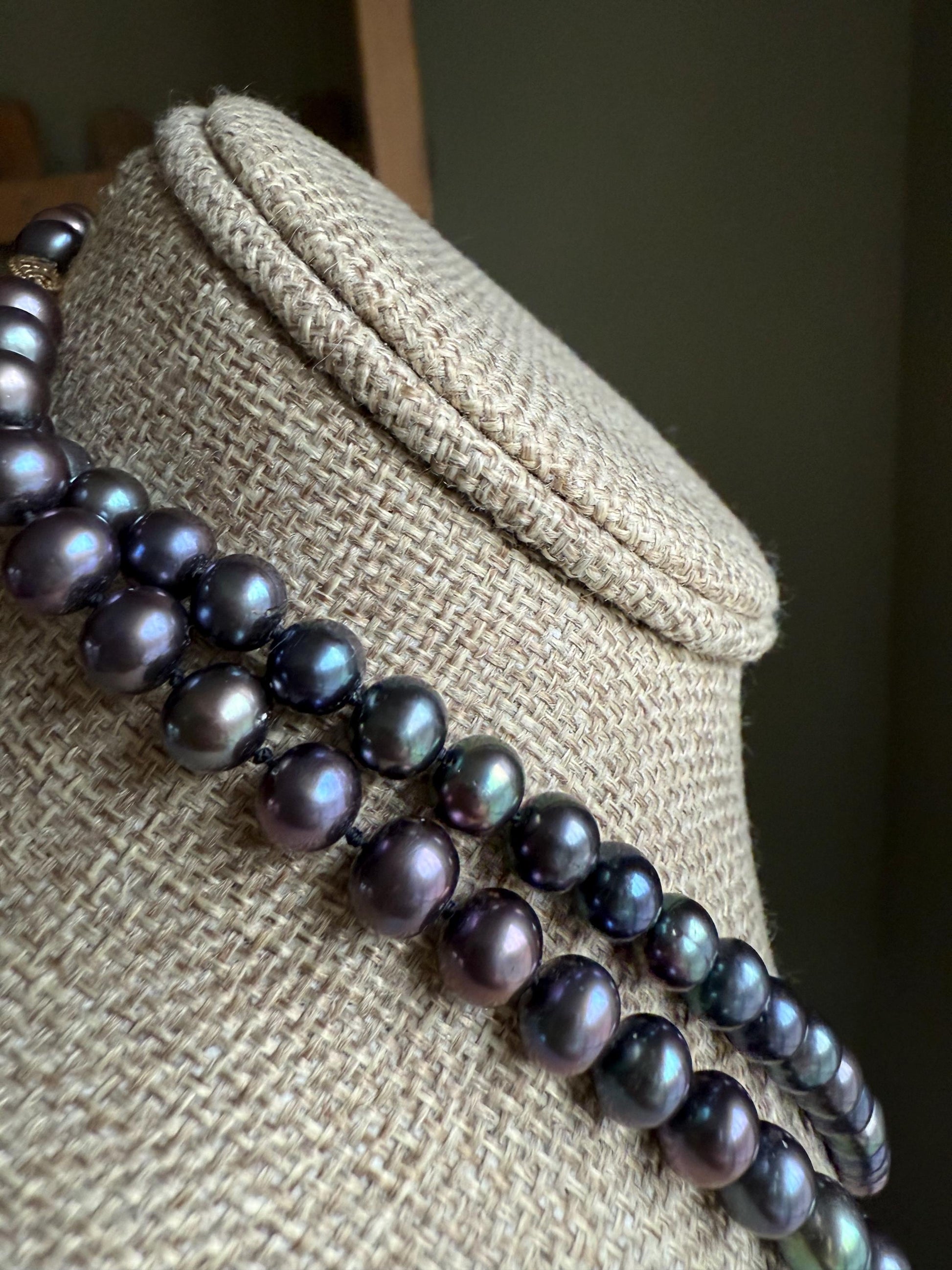 Vintage-Two strands of hand knotted freshwater peacock rainbow pearls. They came together and look very nice stacked but you can just buy one if you want. Both have 14K clasp. The first one is 18" length, approx. 6.9 mm diameter pearls. The second is 24" length, 7.93 mm diameter pearls. The colors are gorgeous and my photos are not catching the iridescence. Pictures are taken by a window on a cloudy day-untouched.