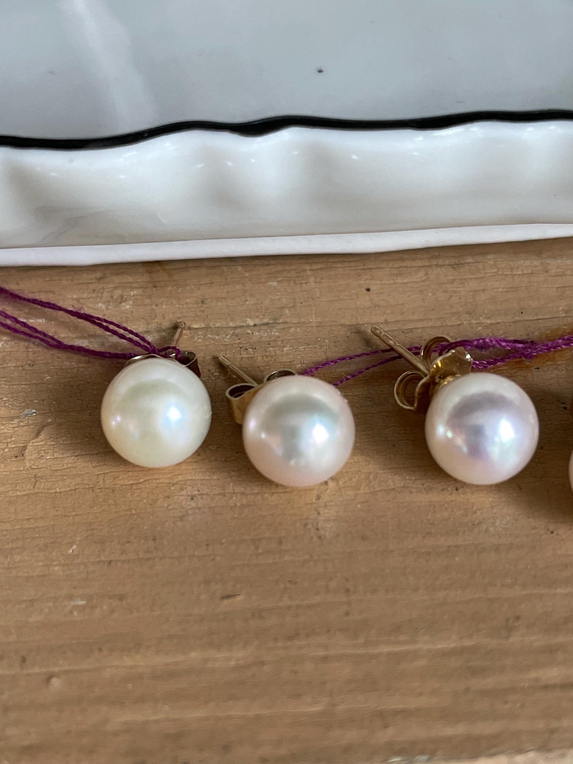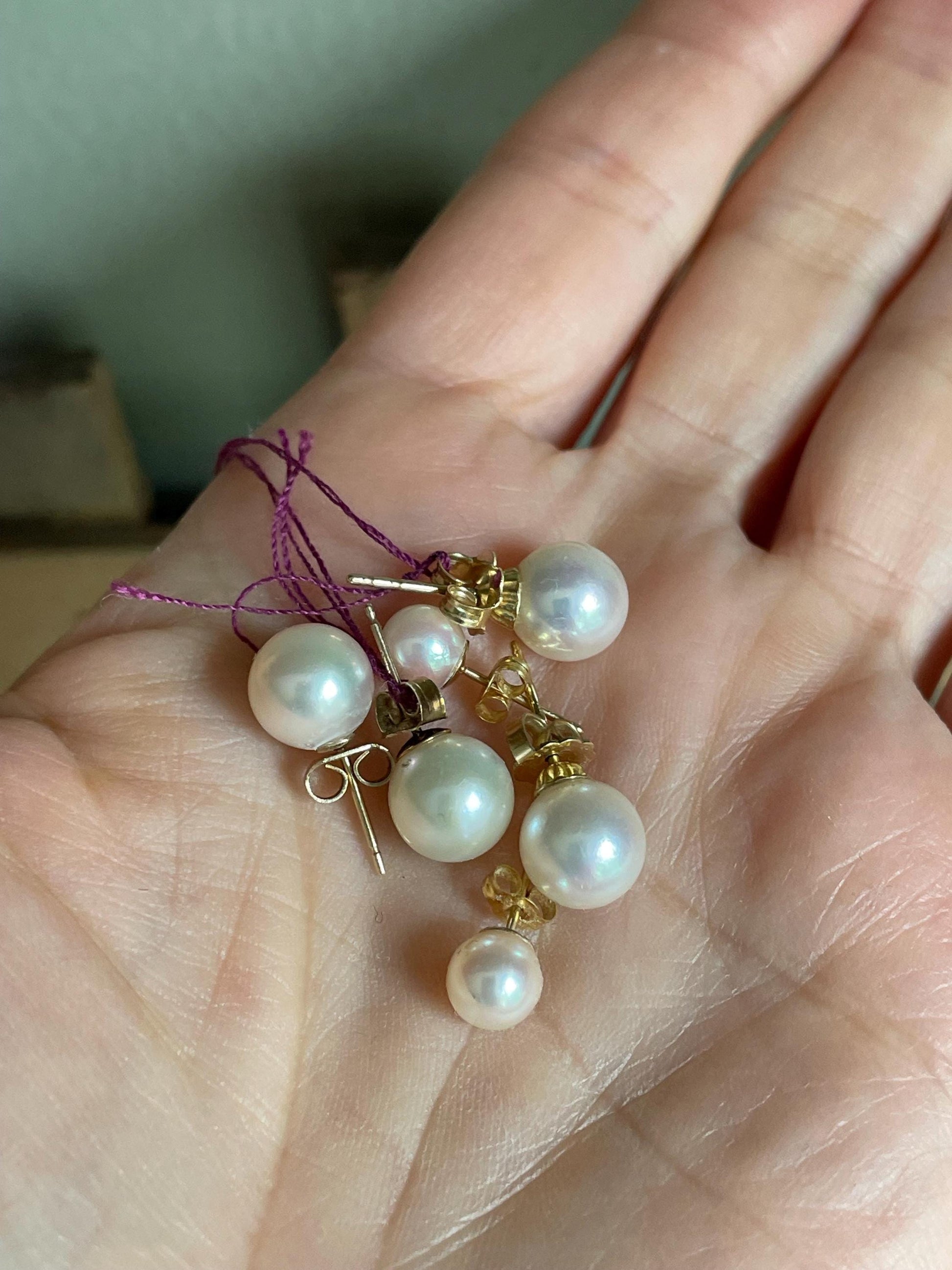 Perfect little gift. Pick a pair of vintage pearl stud earrings. All of them have 14K stems and 14k tension backs. Starting from left to right: 1- Approx. 5.8 mm each, slight cream, good nacre, with rose overtones 2-SOLD Approx. 8 mm each, slightly cream 3-SOLD Approx. 7.90 mm each, slightly cream, good nacre with very slight pink overtunes All of them of are in very good preowned condition.
