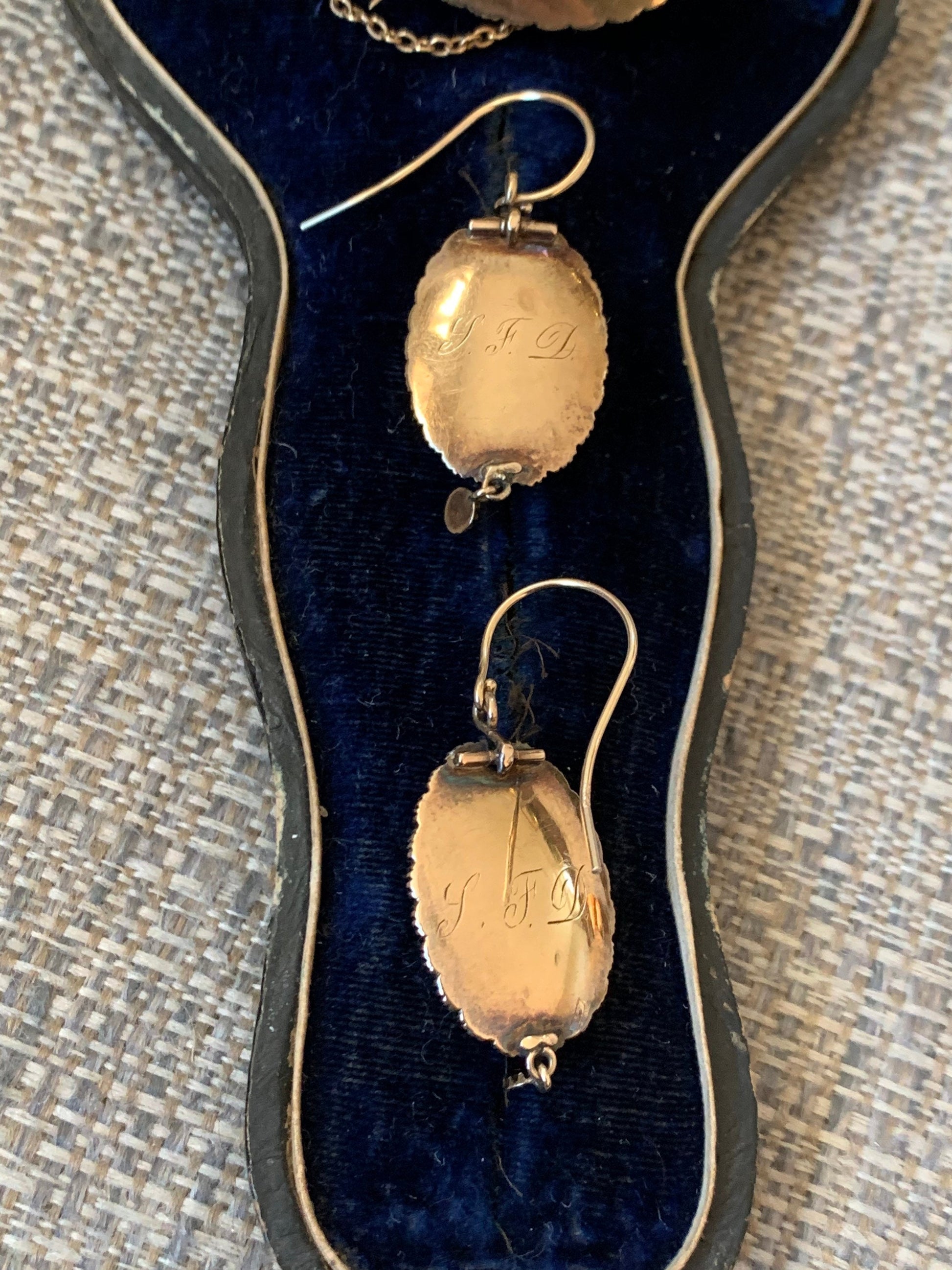 I adore the hand engraving to each piece. The back of the brooch is engraved Susan F. Dike and the earrings have matching initials.