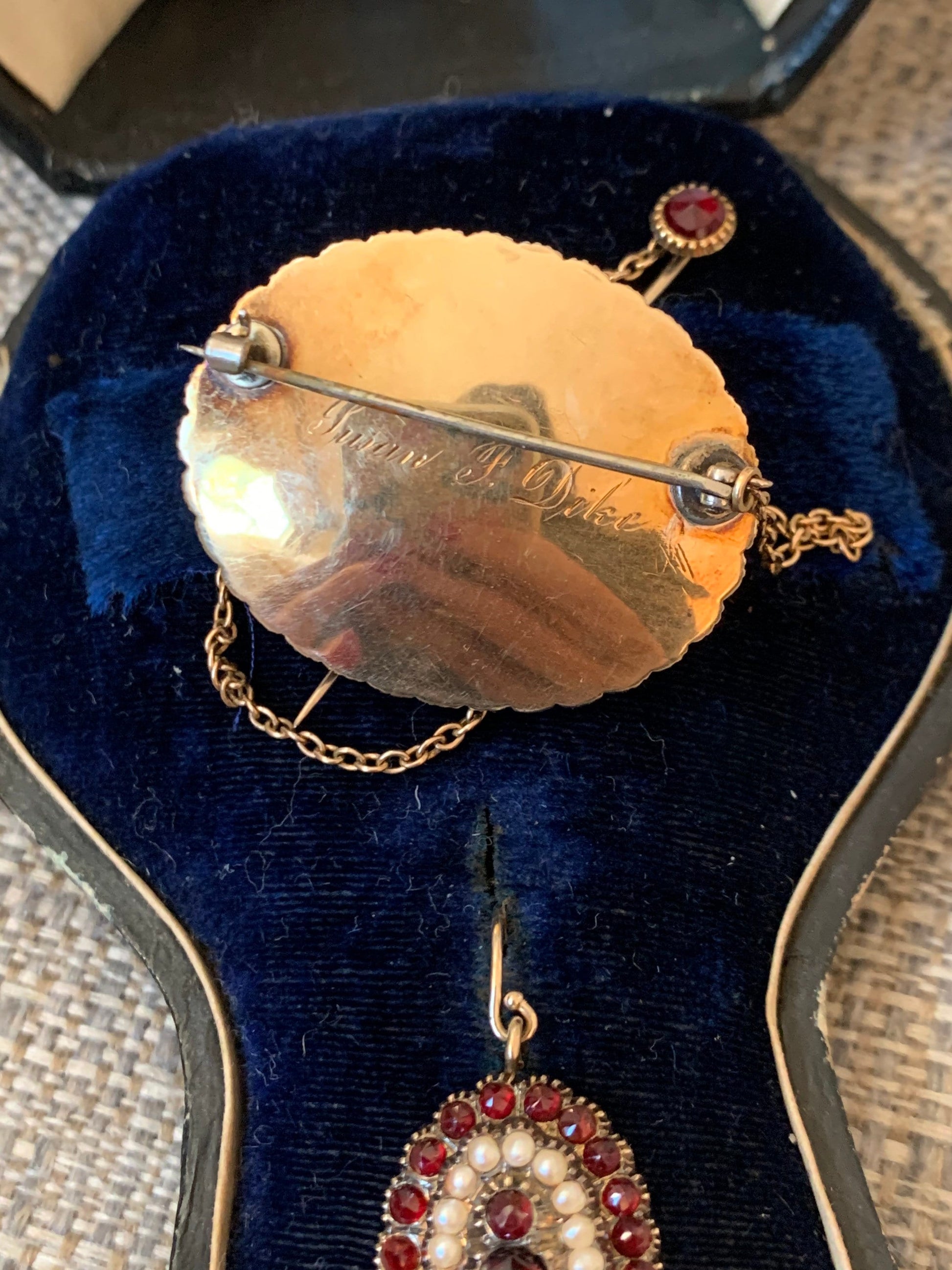 The brooch is 14k yellow gold and beautifully set with with five tiers of bohemian cut garnets and pearls. Quality workmanship, garnets are deep color but when hit with light they become a ruby red. Pearls are in very good condition. 1 3/8" wide x 1 1/8" tall. I can tell the pin has been updated during its life and is not gold but it is in good working condition. There was also added a gold filled chain and a 10k head garnet stick pin. Please note the stem is not gold. They match so well but upon magnification you can see the crimping is slightly different.