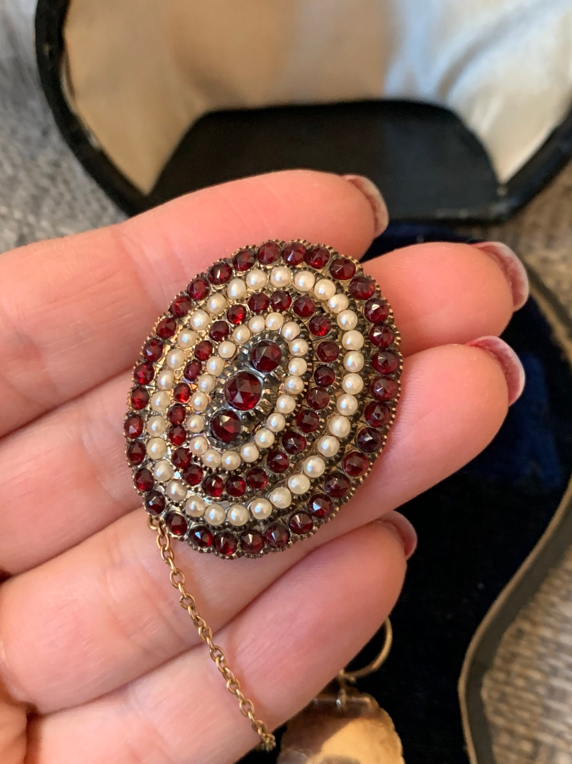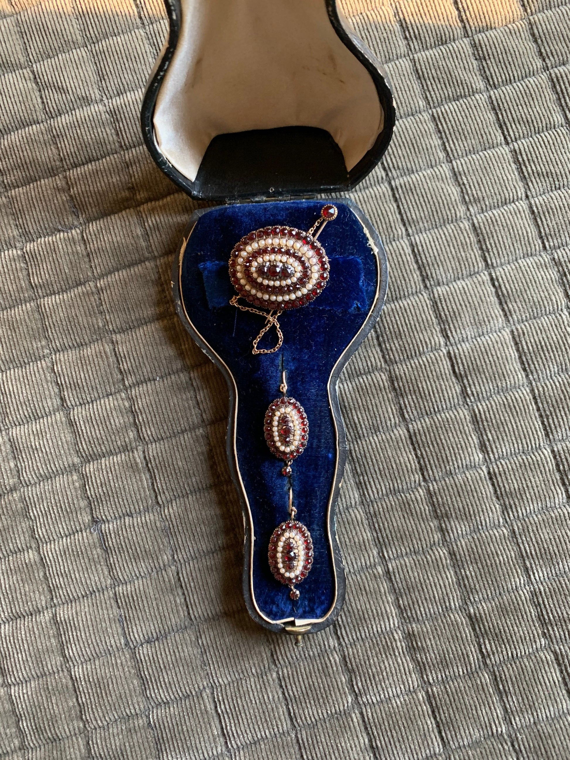 SALE 14K Late Victorian Bohemian Cut Garnet and Pearl Brooch and Matching Earrings
