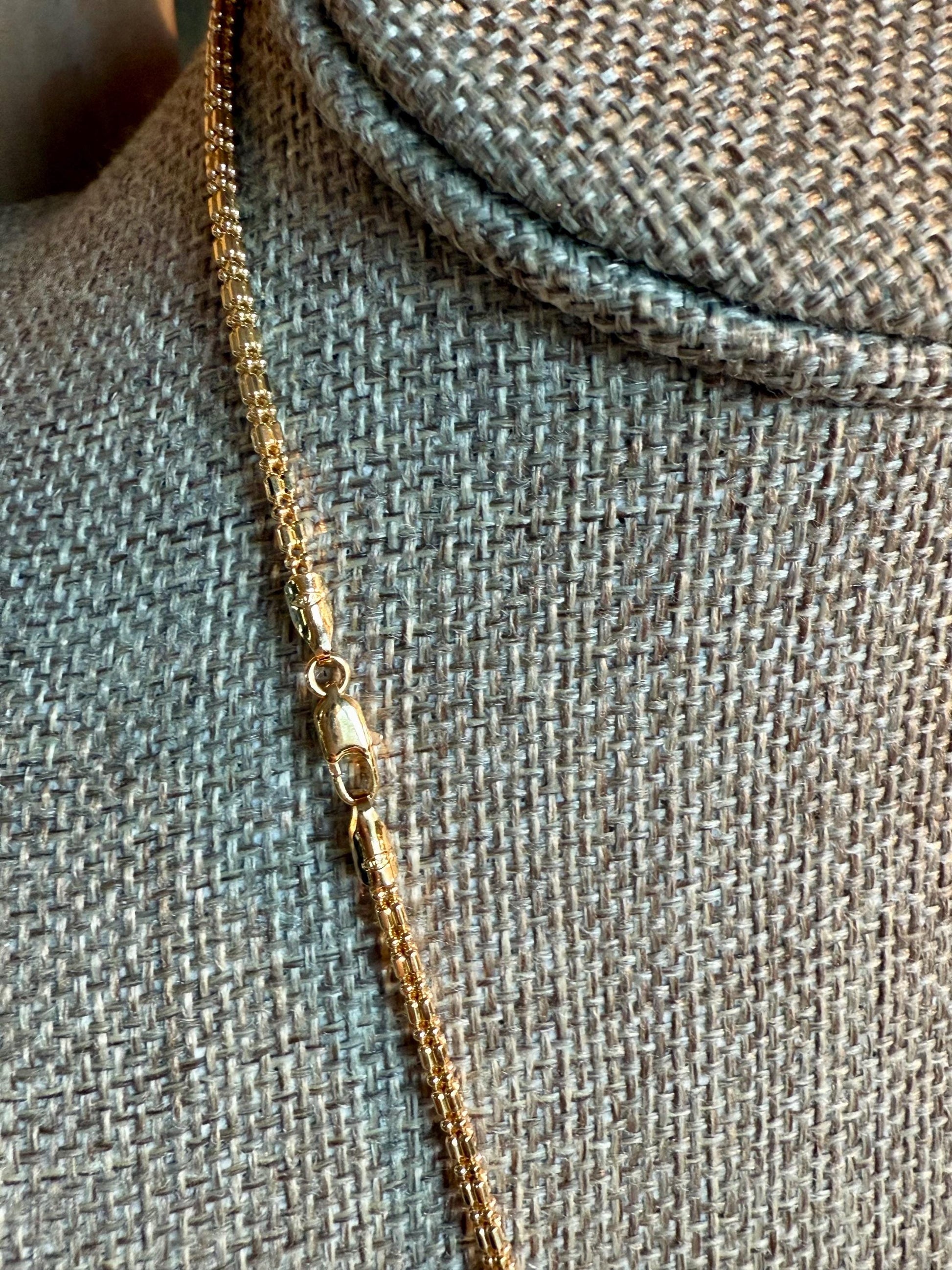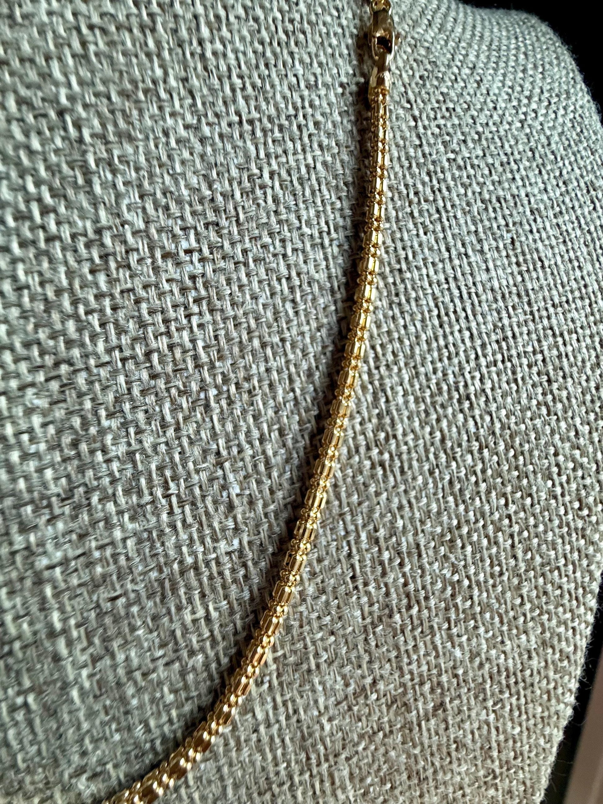 Vintage 18K Yellow gold unique link Italian chain. Hallmarked, stamped 750 and tested. Solid made piece. Doesn't look worn-bright and shiney! The links are made up of rectangle bars and balls, shape of link is square. 1/16" wide. 20" length. Lobster clasp. Smooth feeling link that is strong enough to hold heavier pendants or wear alone.
