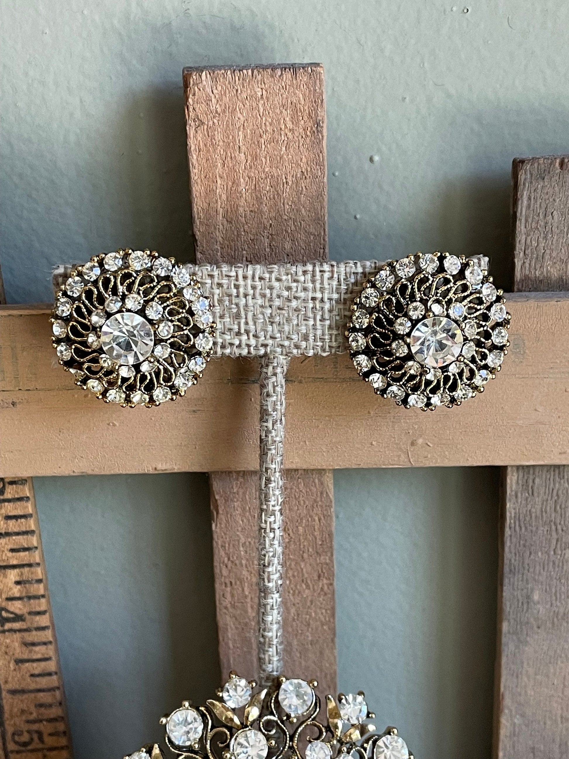 Domed brooch measures 2" in diameter, rich gold tone with sparkly rhinestones. The earrings measure 1" diameter, clip backs. The brooch is signed Lisner.