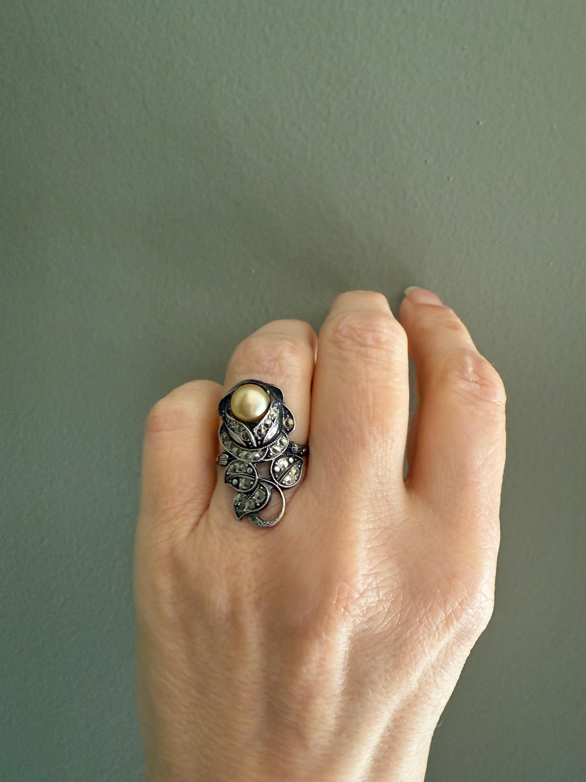 Sterling Silver c1920-1930 Art Deco Marcasite Pearl Rose Ring