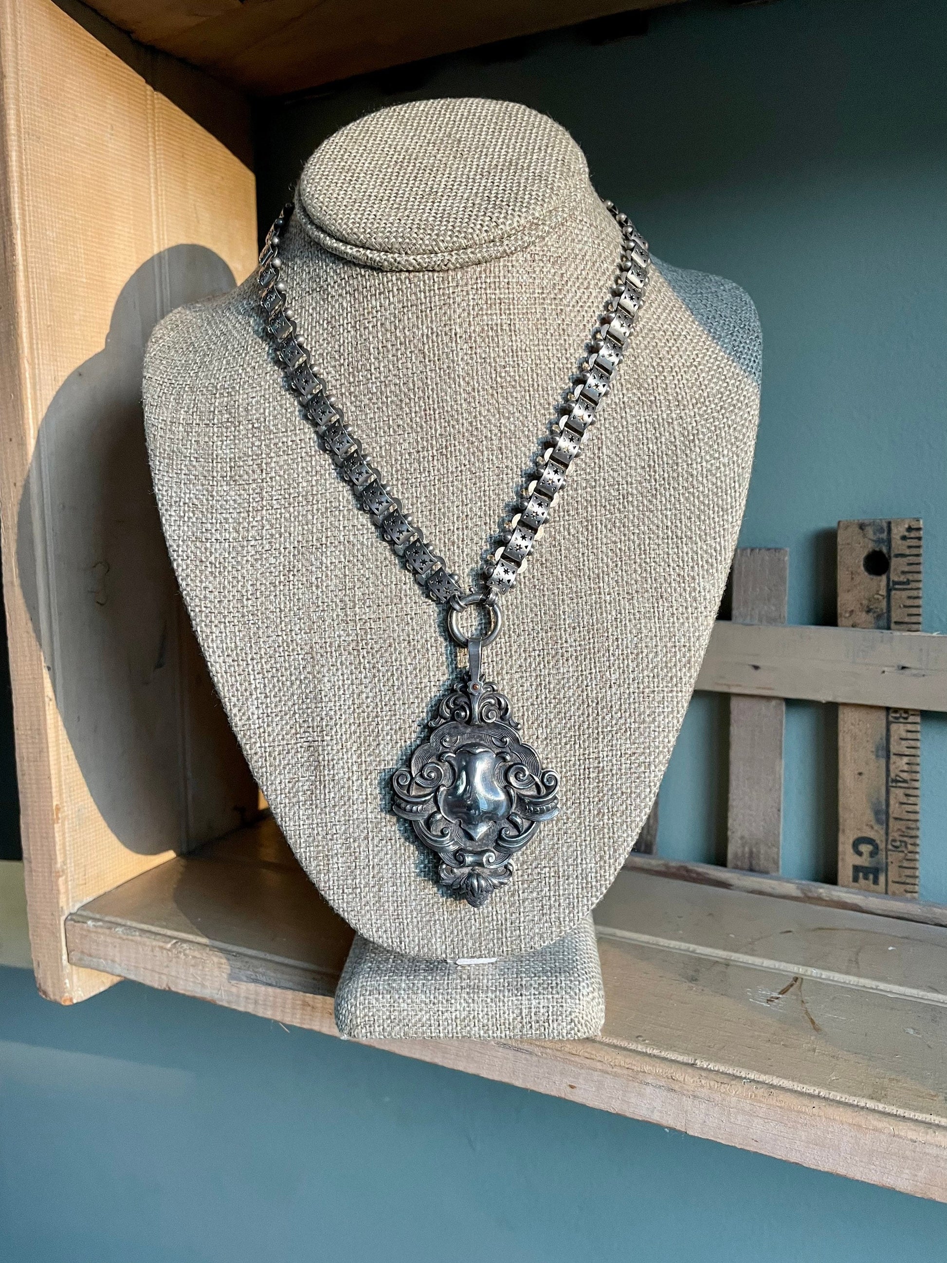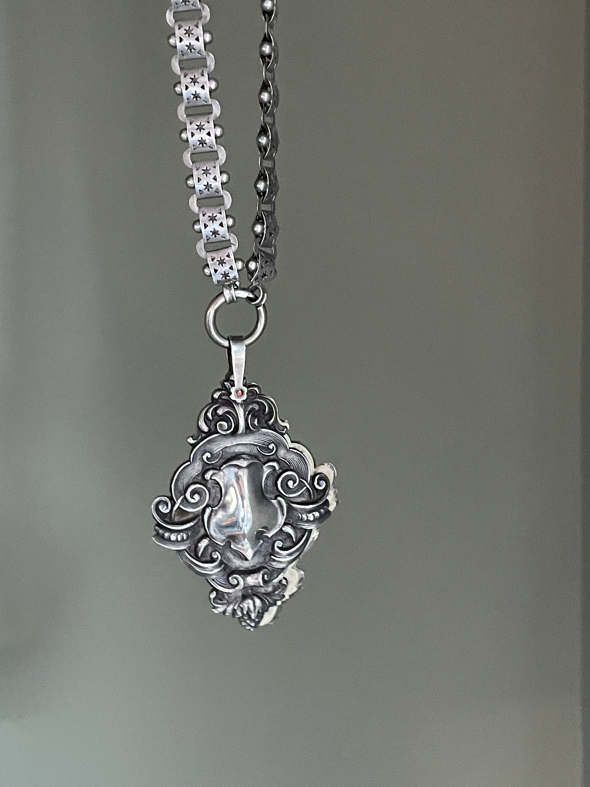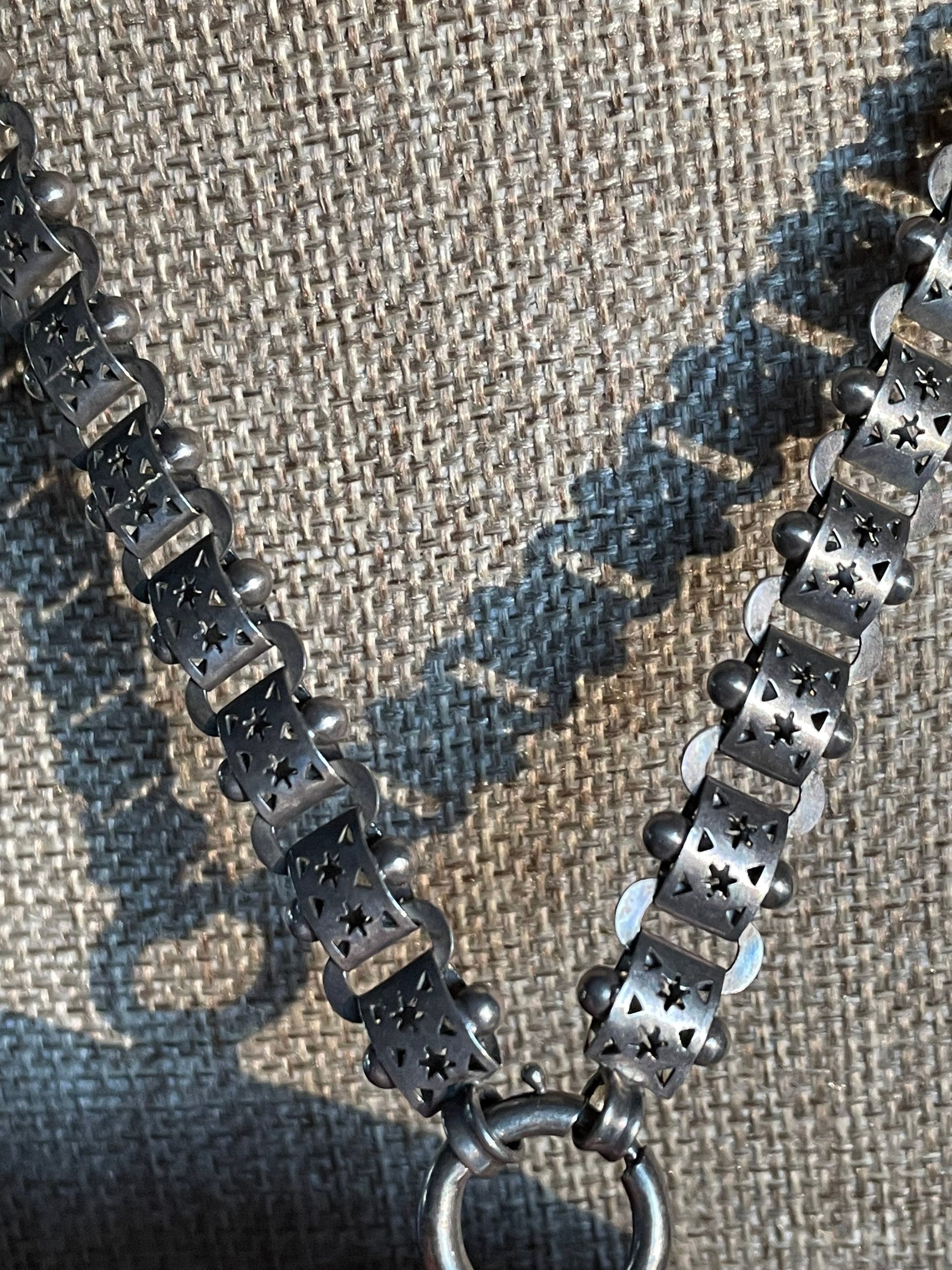 It hangs from a Victorian bookchain that features links with cut out stars, triangles. The clasp is a large spring ring measuring 15 mm. So easy to use the chain on multiple pendants.