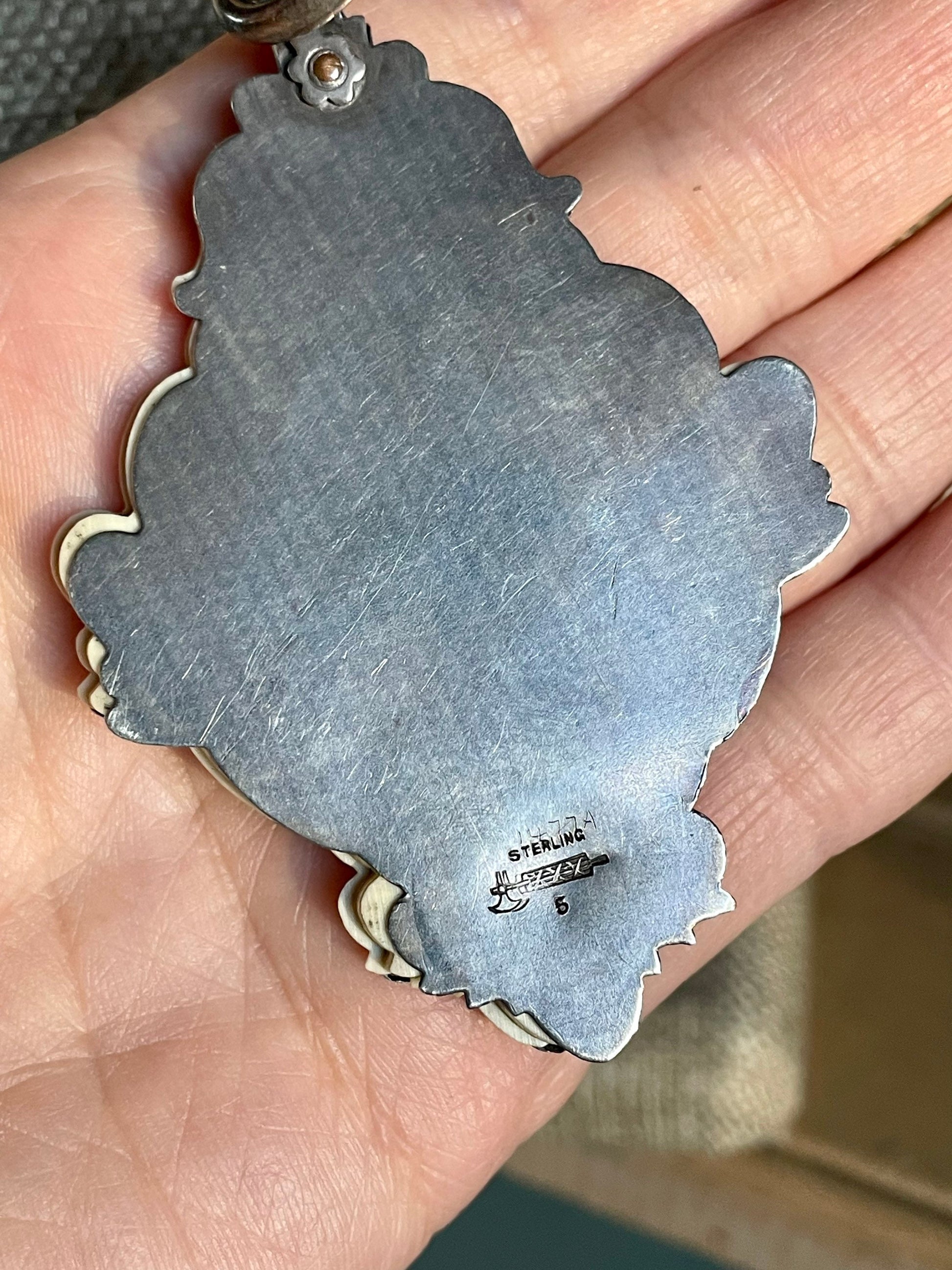 The pad is sterling silver and measures just shy of 3” in length and 2” wide. It is a beautiful example of repousse. It has a hinge with a large bale. There are six celluloid pages. I lightly polished but kept the patina.