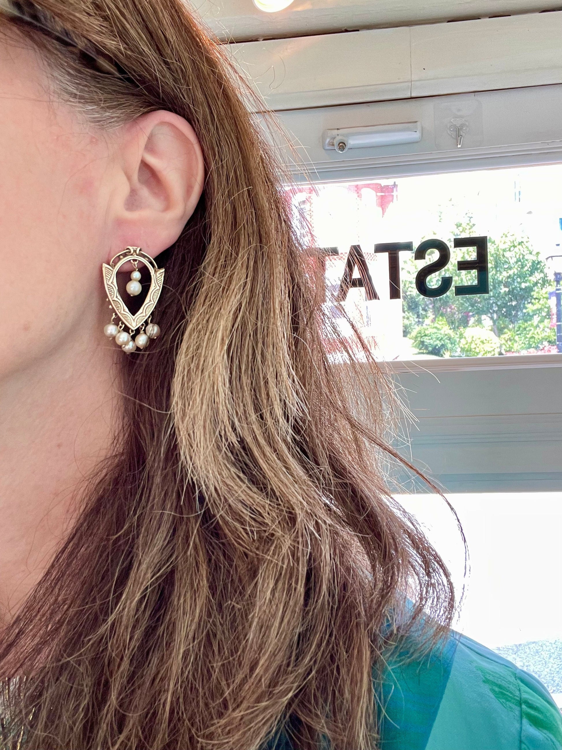 Victorian revival 10K yellow gold (tested) dangle earrings featuring pearls. 1 1/2” tall x 7/8” wide. Posts with 14K yellow gold tension backs. 8.79 grams tw