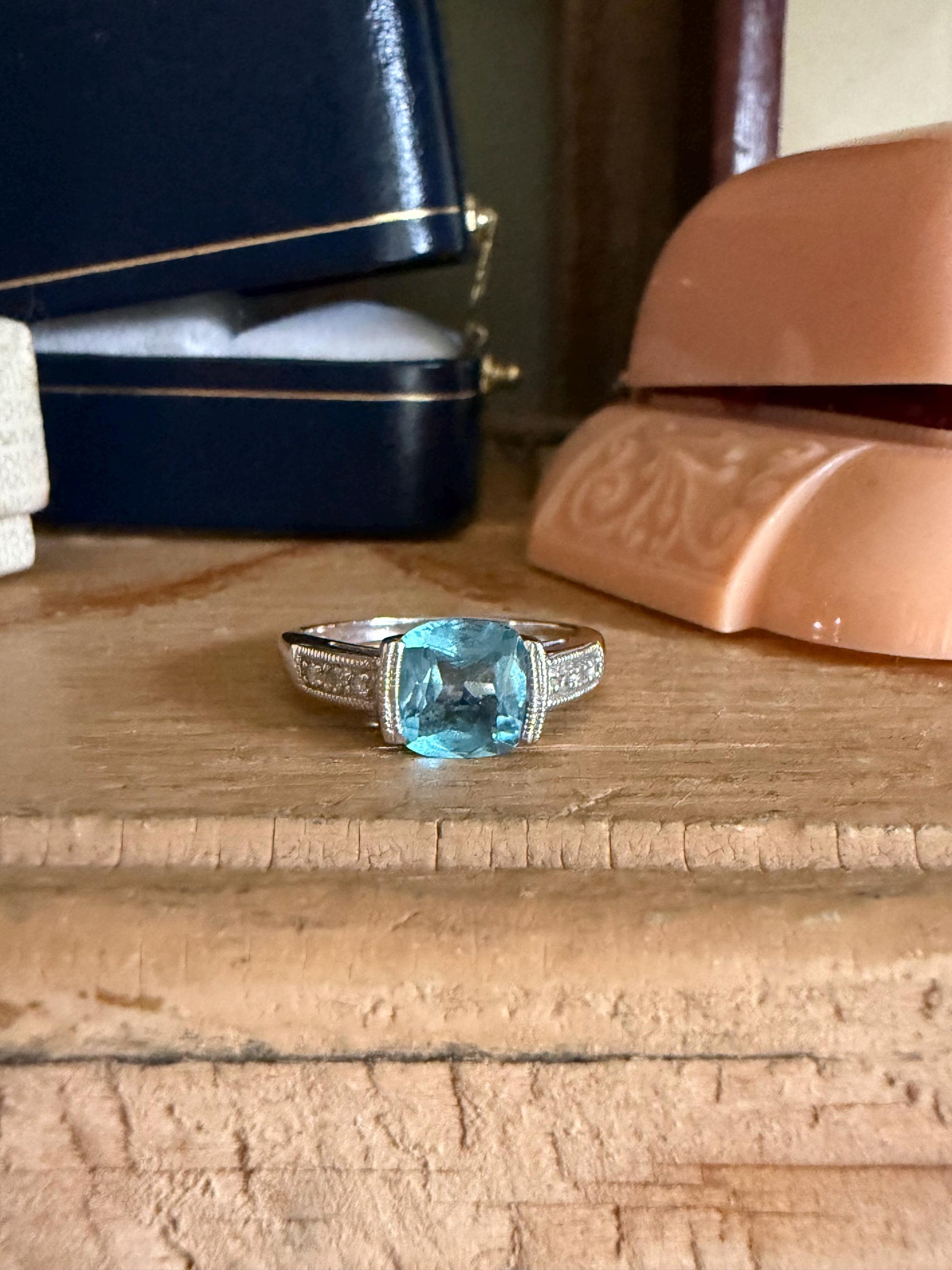 Vintage 10K White Gold Cushion Cut Blue Topaz and Diamond Ring