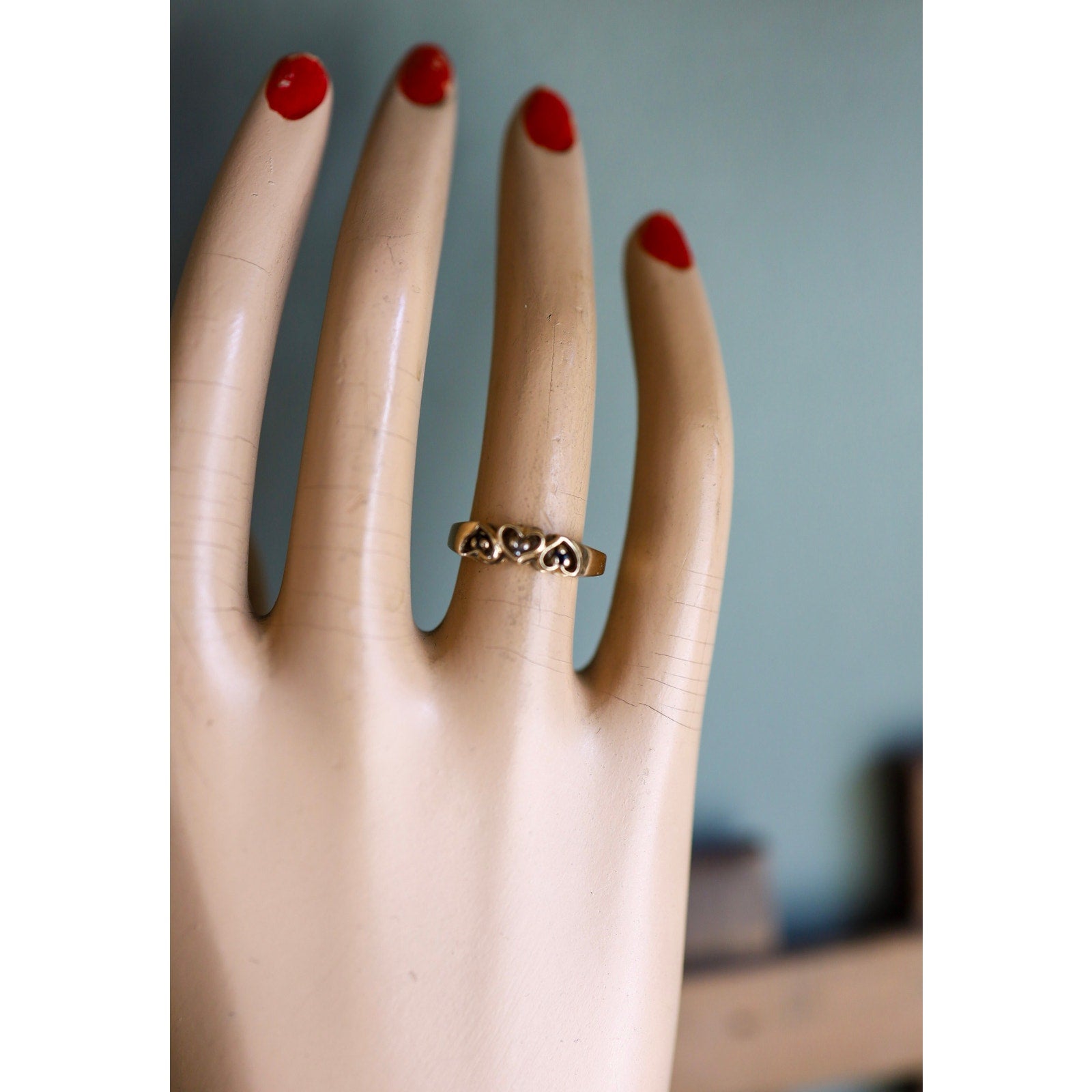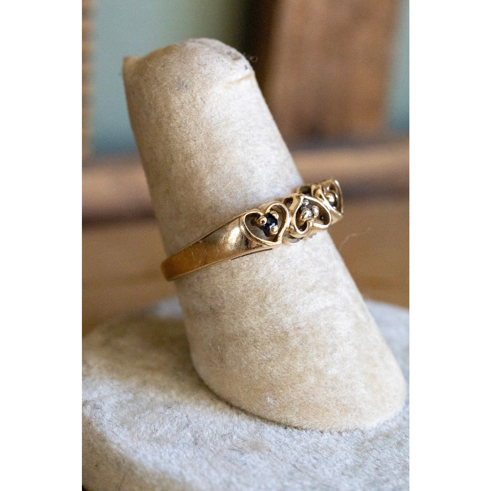 c1970 10K yellow gold ring features three open work hearts set with small round cut sapphire (sides) and a diamond (center). 3/16" wide, sz 6 - message if you need sizing service.