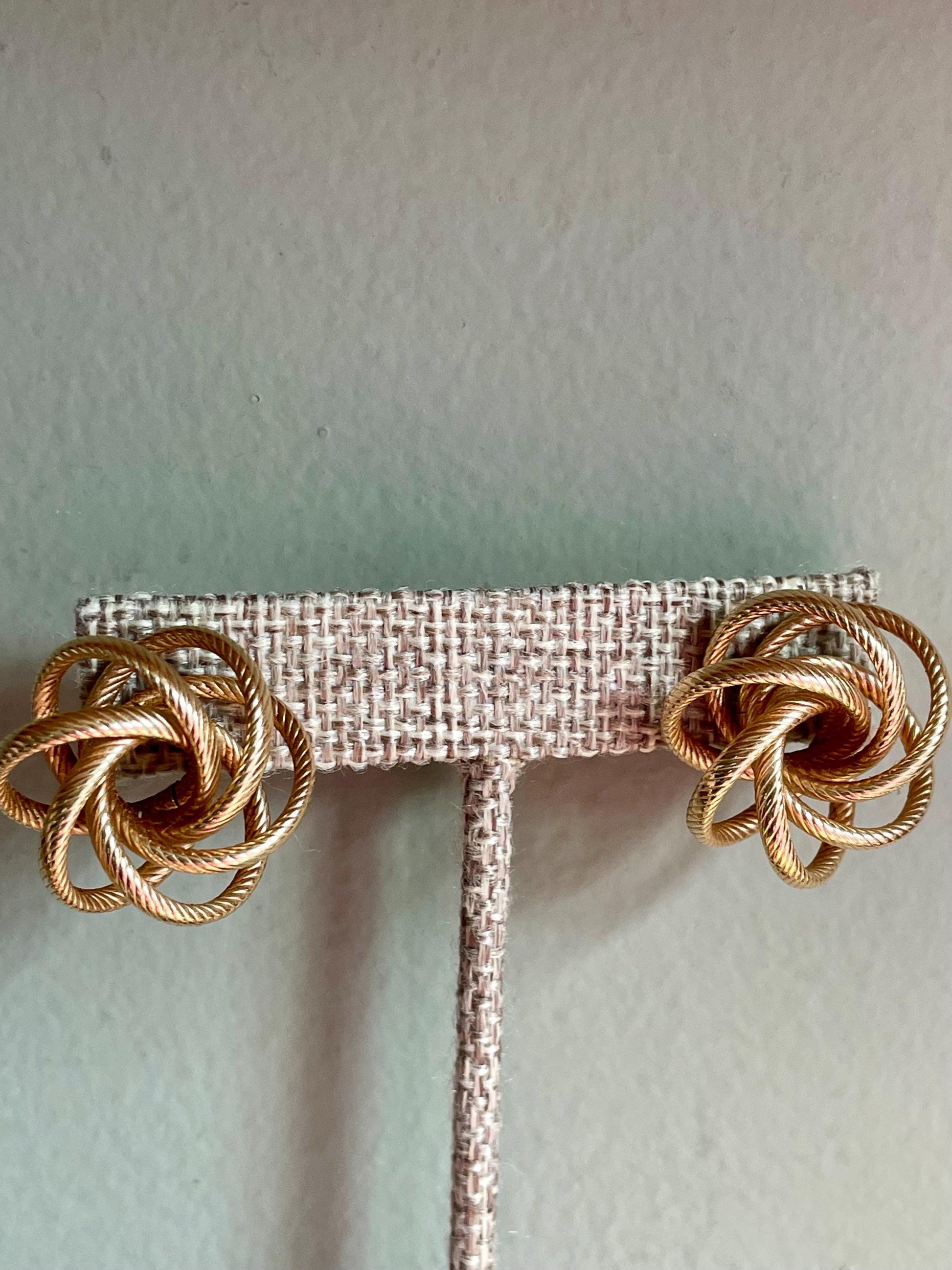 14K yellow gold earrings (tested) in a loopy textured knot. 14K yellow gold tension backs (they are mismatched but both 14K). 7/8" diameter, sits off ear 1/2". 7 grams tw.