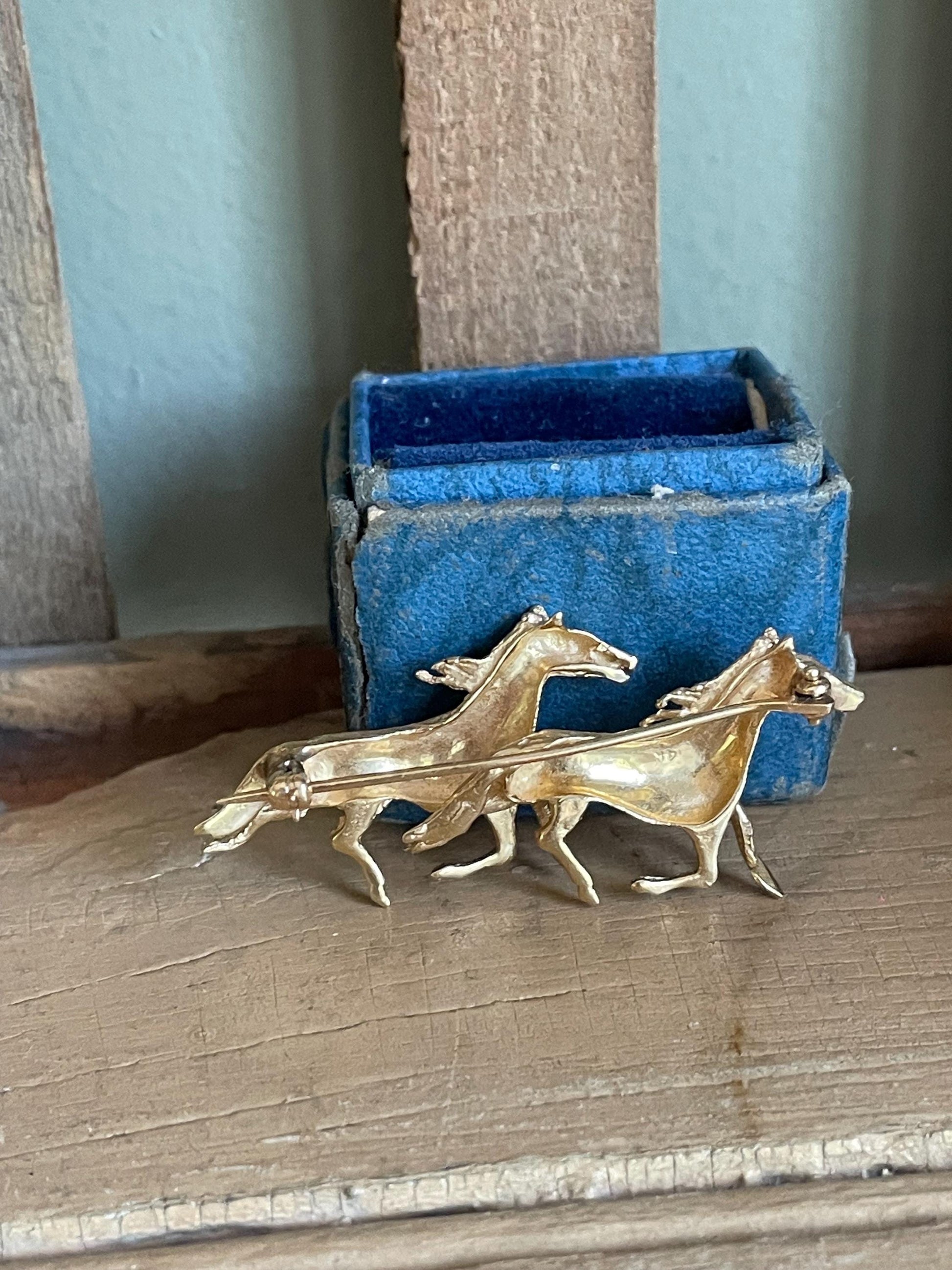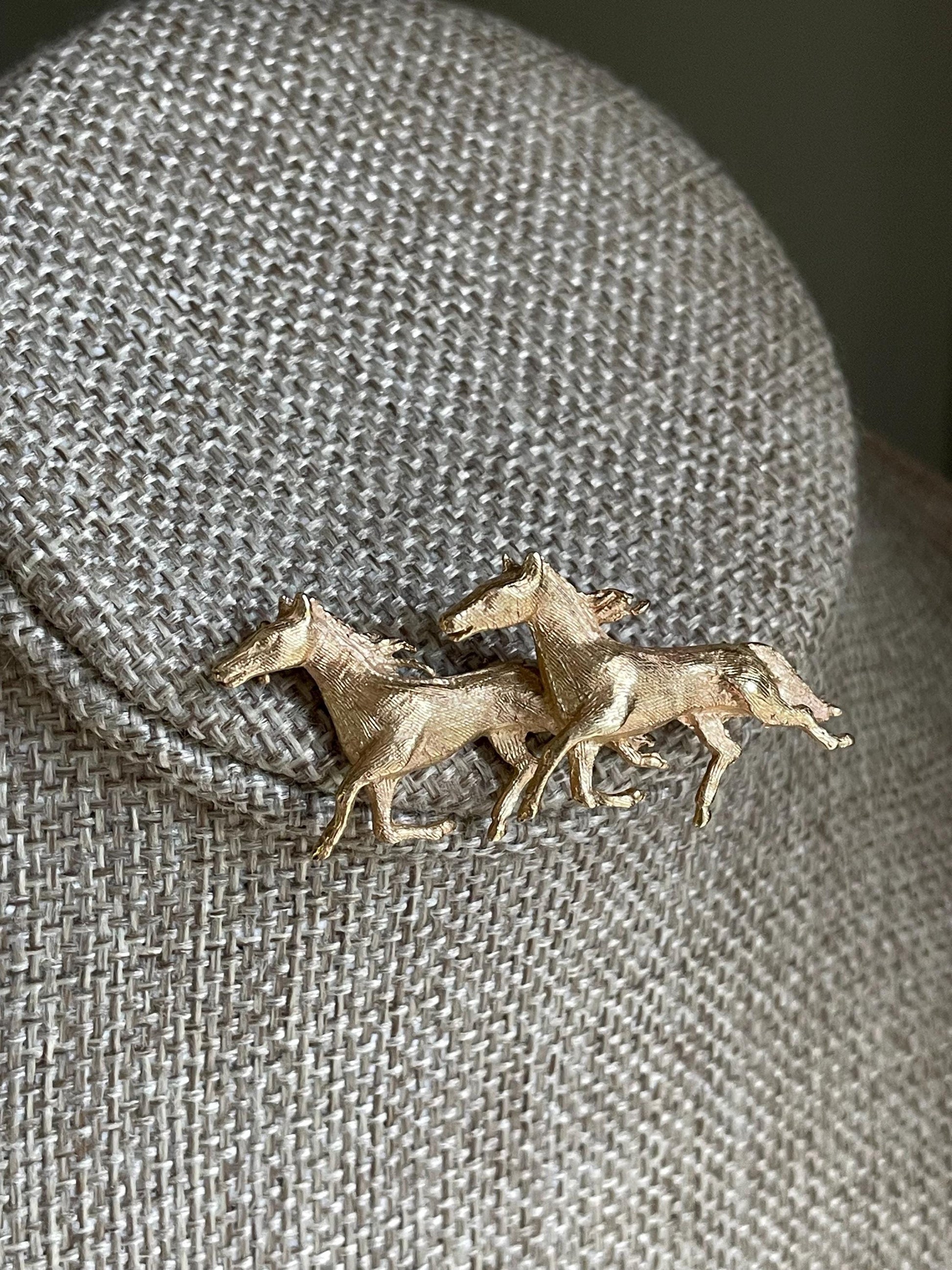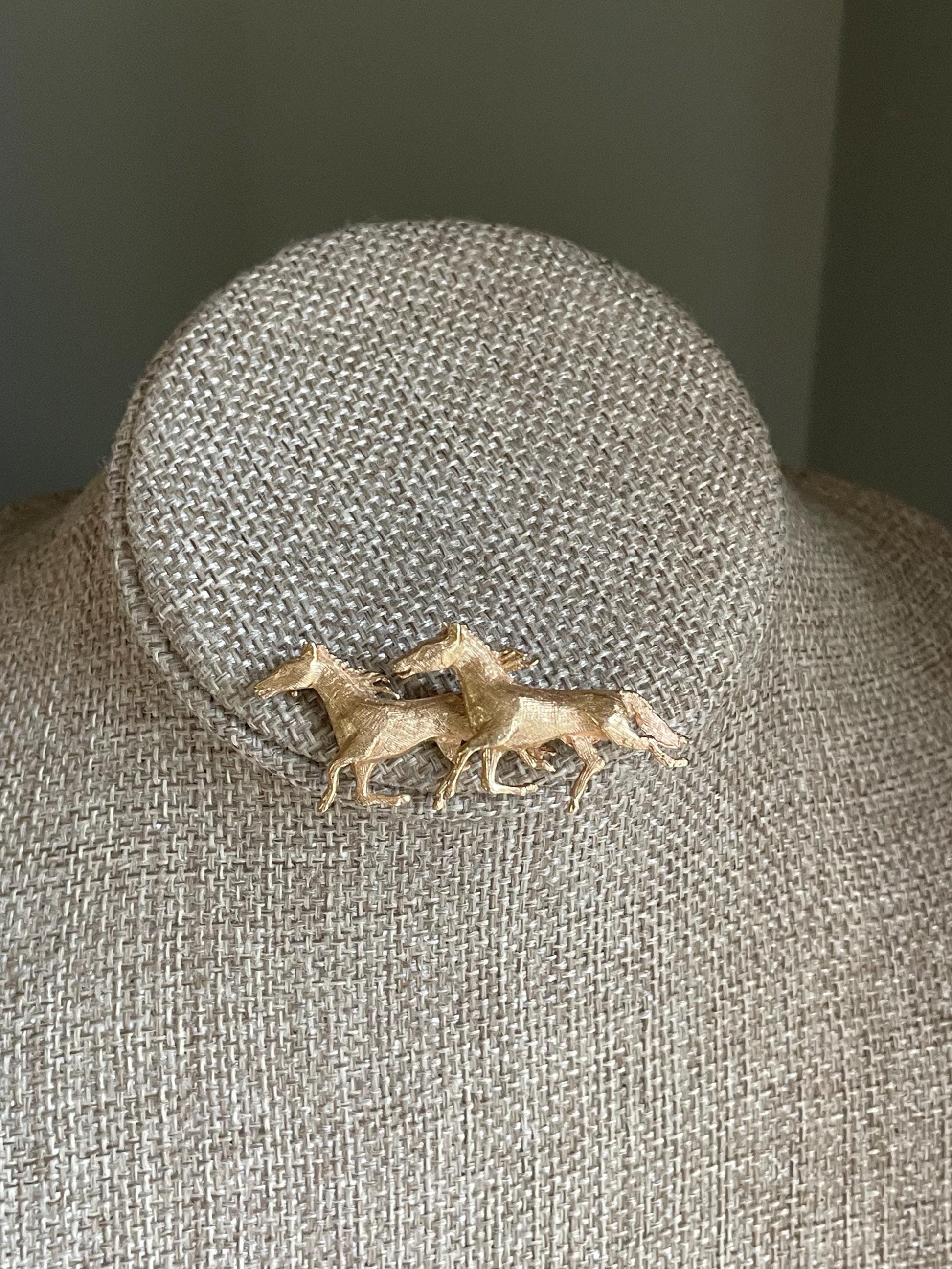 14K solid yellow gold (stamped on back and tested) brooch featuring two horses galloping. They have textured bodies, flowing manes and tails. 2 15/16" wide x 3/4" tall. Locking safety clasp.