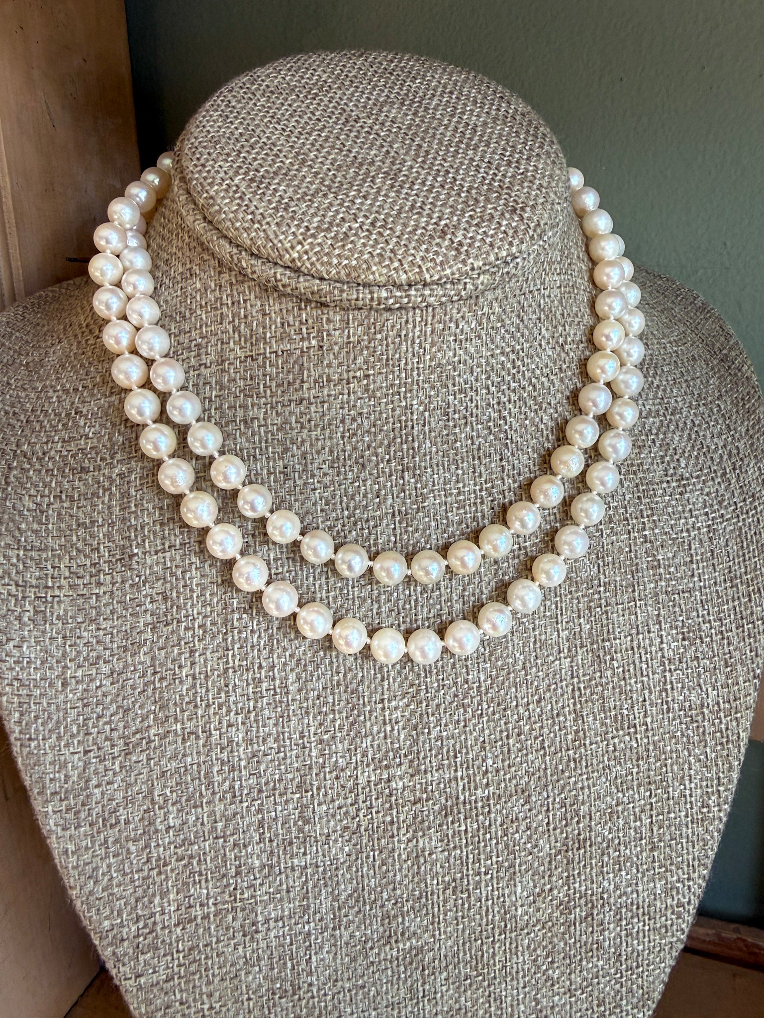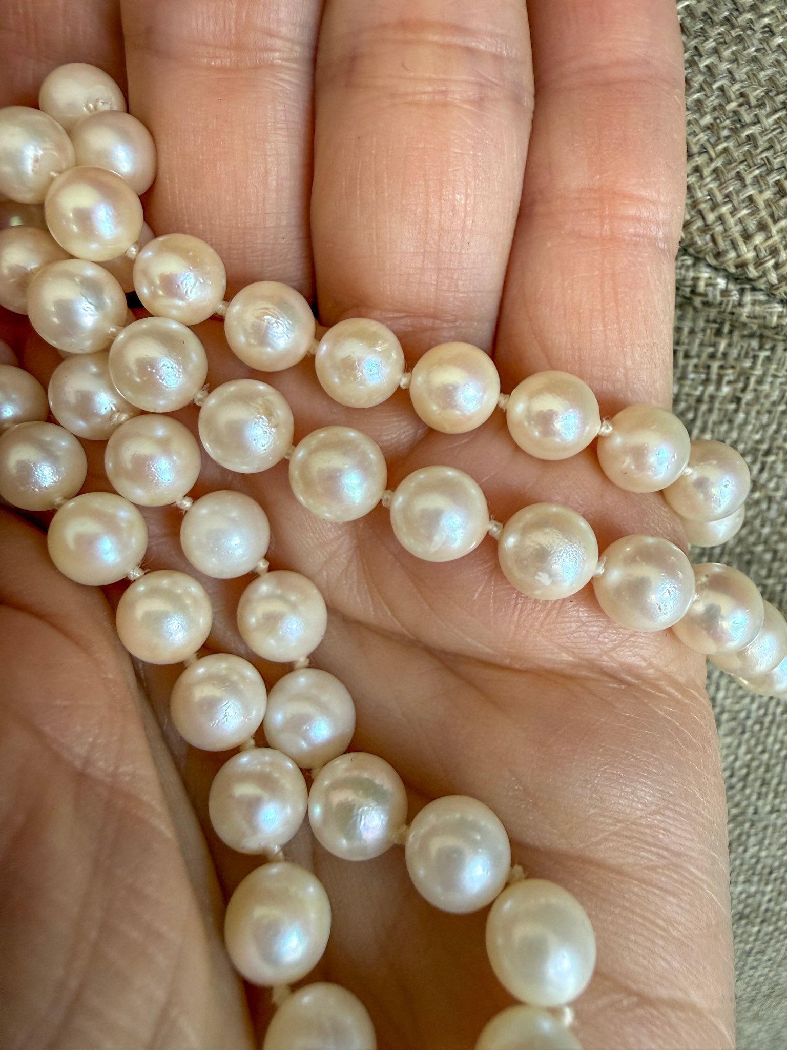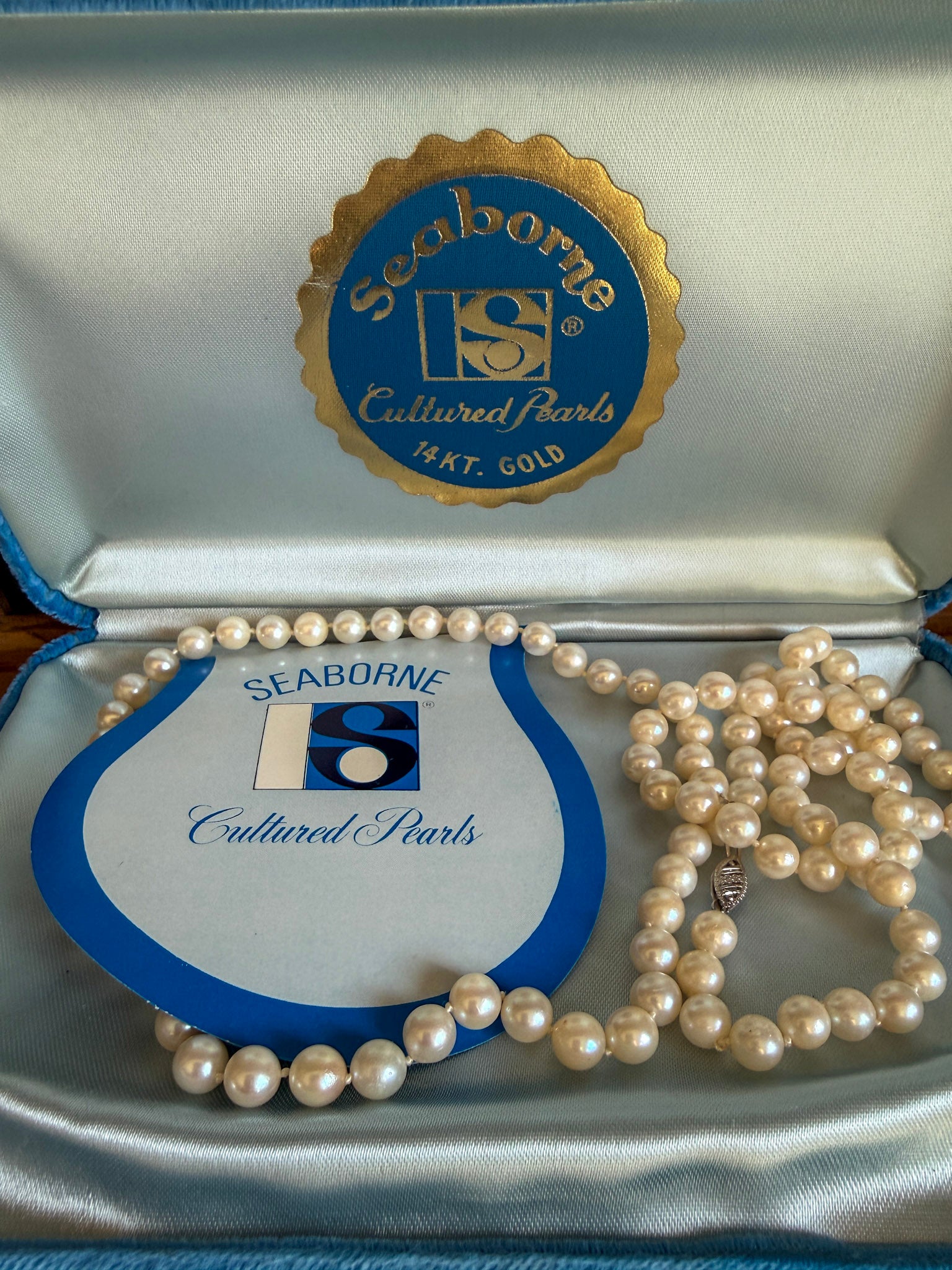 Vintage 1950-1960 Seaborne Cultured pearls with a 14K white gold clasp. They are a slight cream hue and measure about 6.90 mm diameter each. They are an opera length -approx. 30" long. Hand knotted between. Long enough that you might be able to double them and wear like a choker.