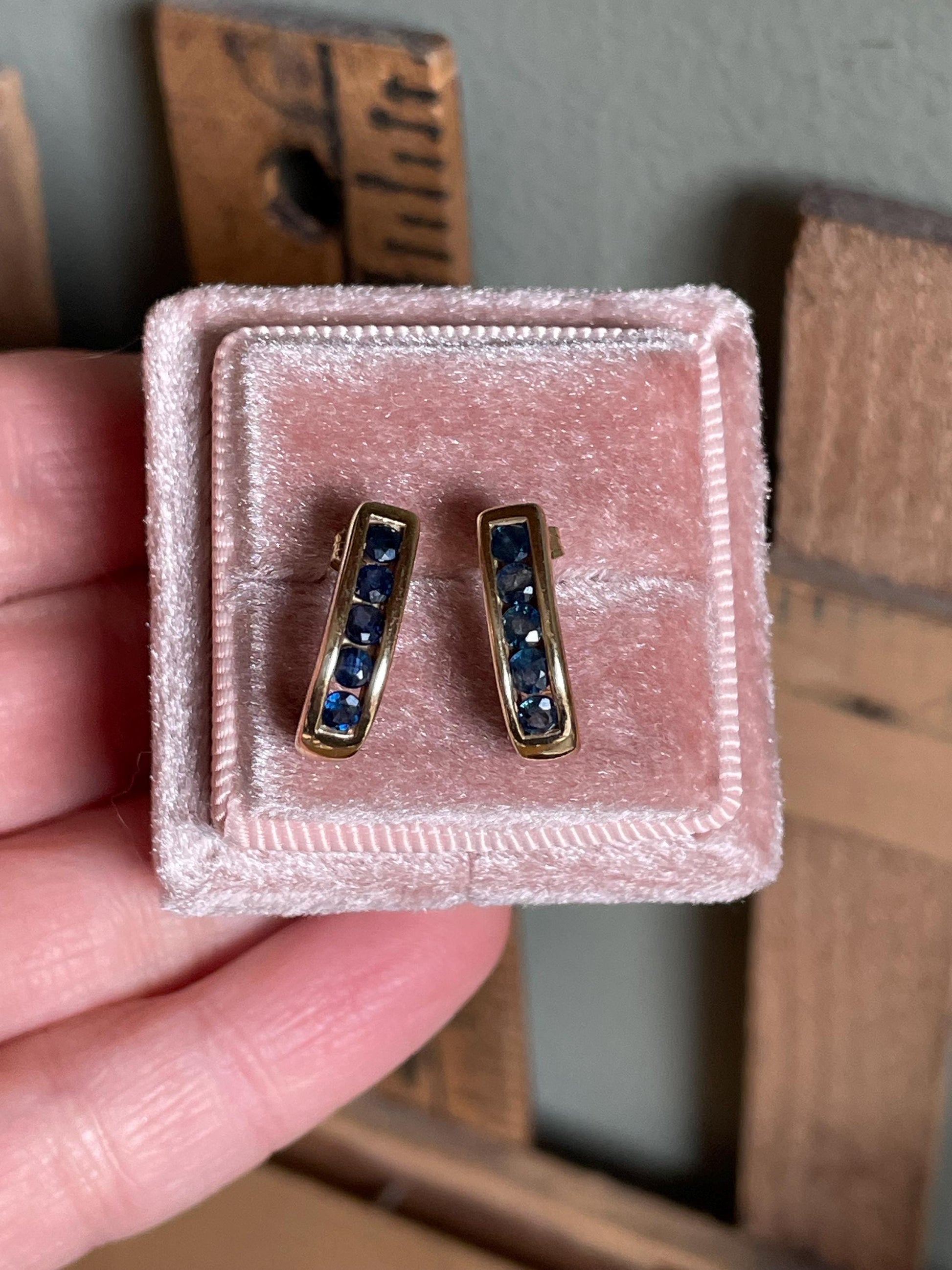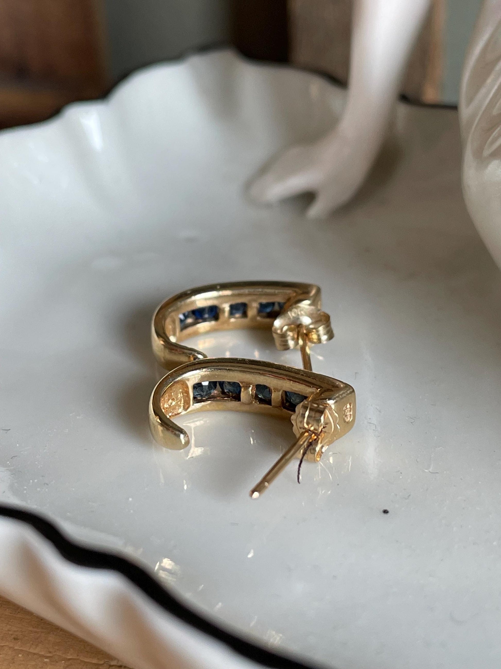 14K solid gold half hoop earrings set with 10 channel set round cut sapphires. .30 ct each earring, .60 ctw. The sapphires are a deep navy blue. The earrings measure 4.36 mm wide and 9/16" length. Posts with 14K tension backs (they are slightly different style backings if you look closely).