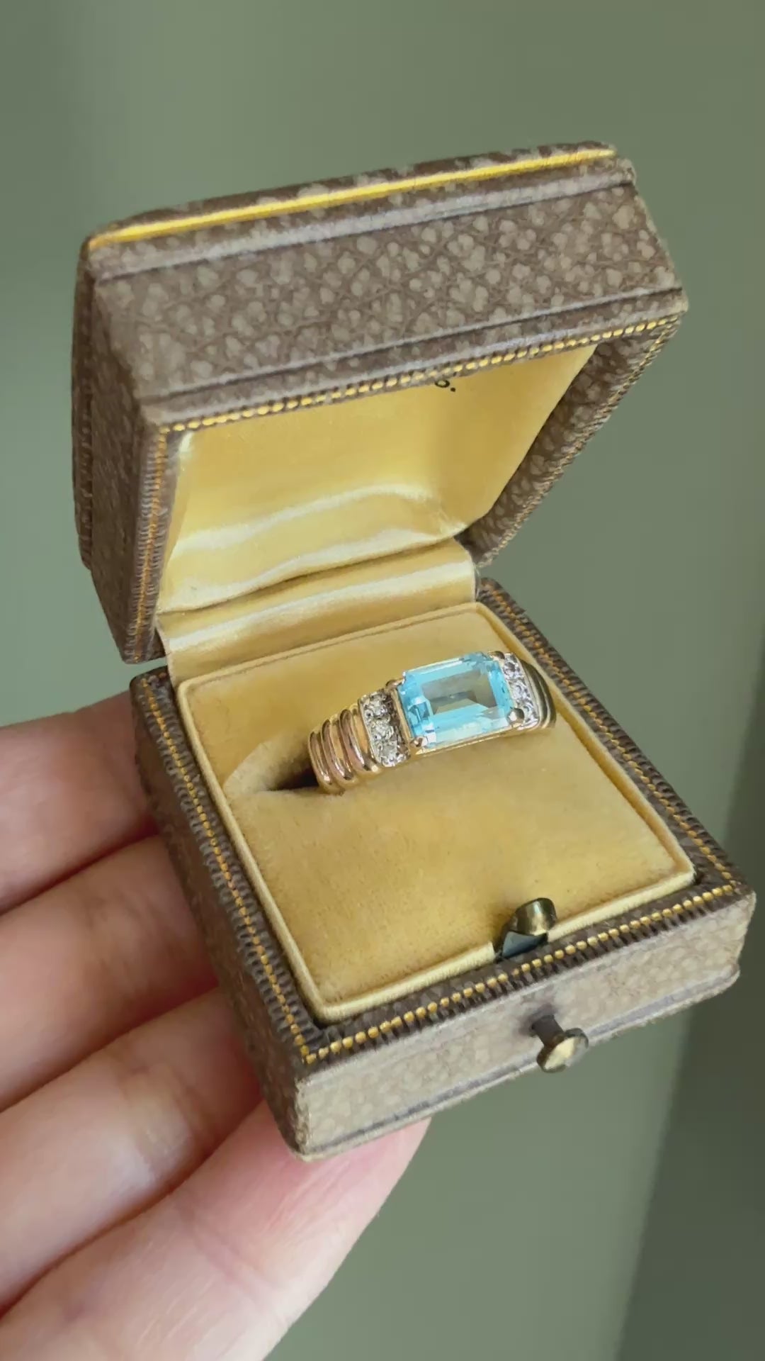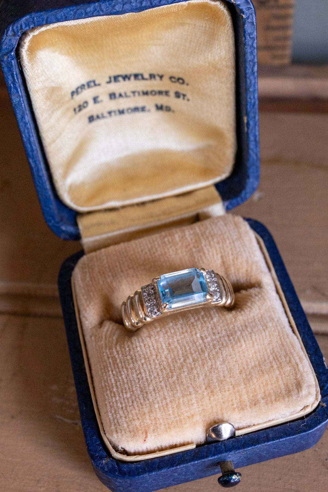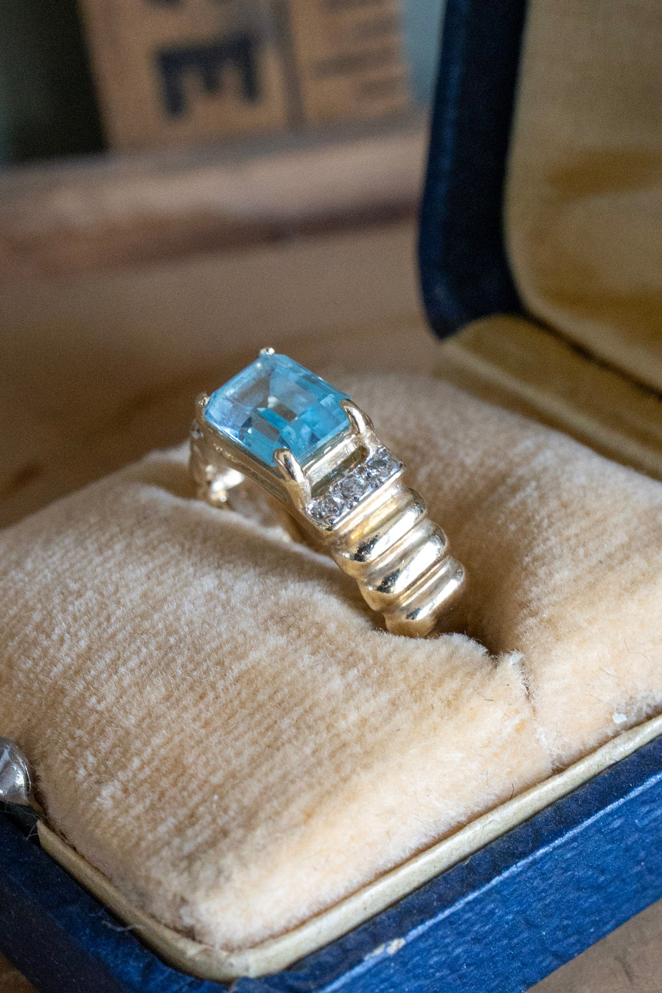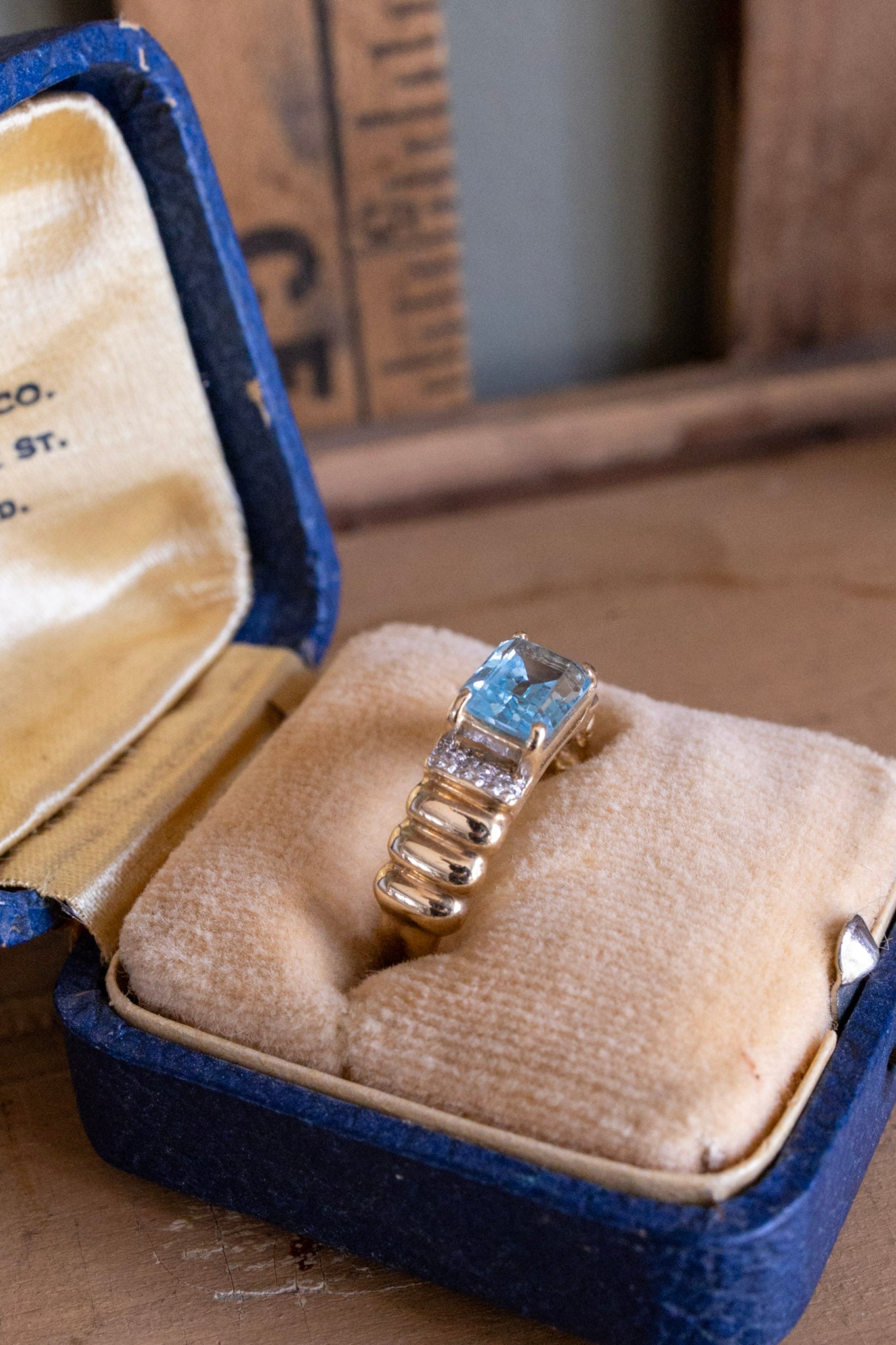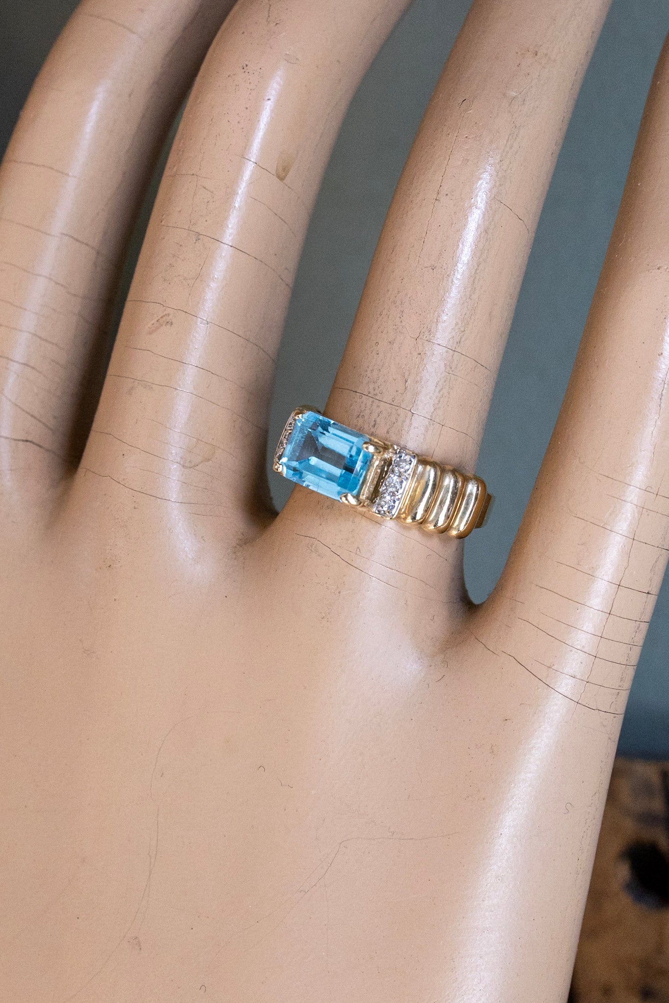 Vintage 14K Yellow Gold Emerald Cut Blue Topaz and Diamond Ring