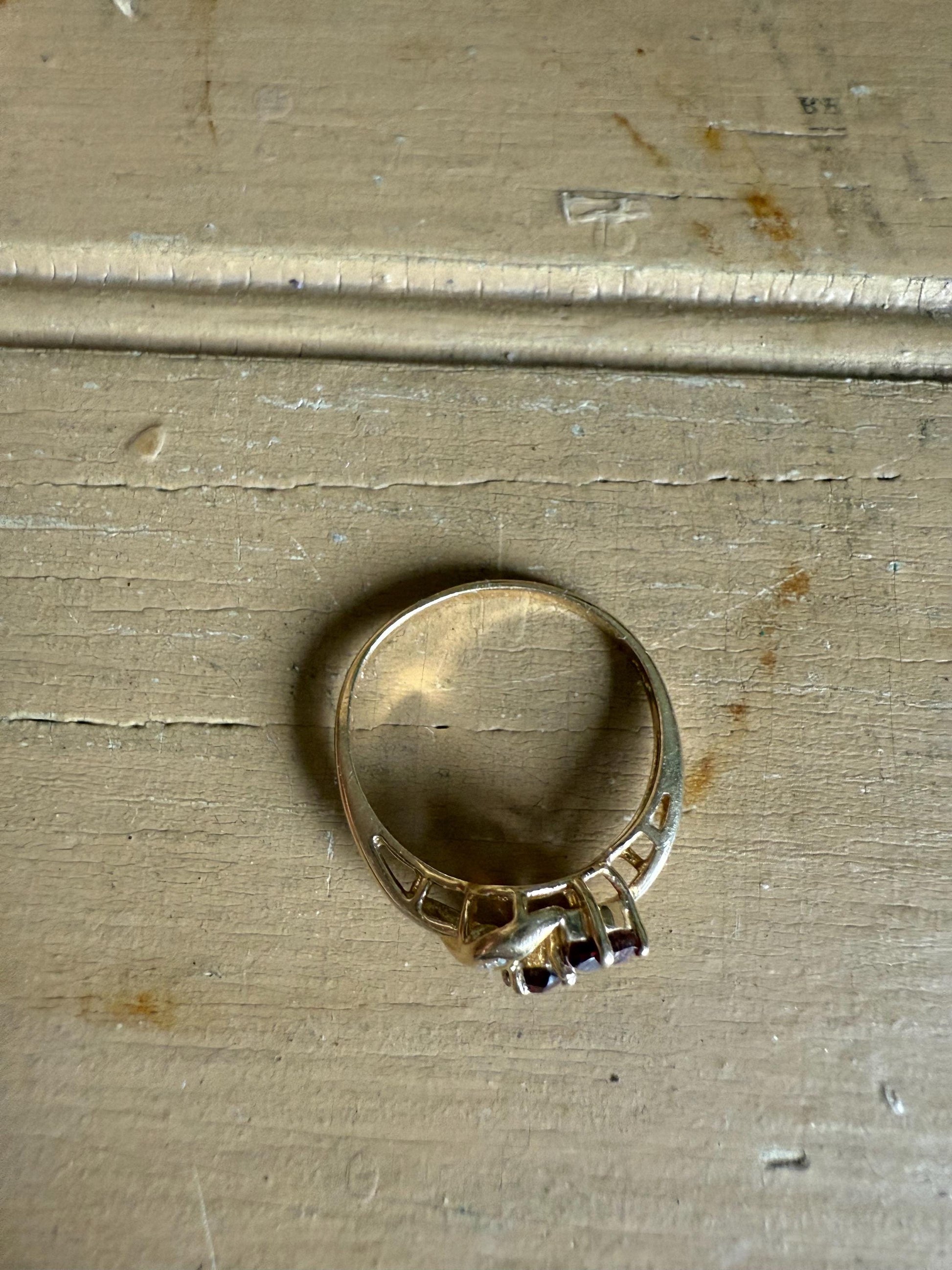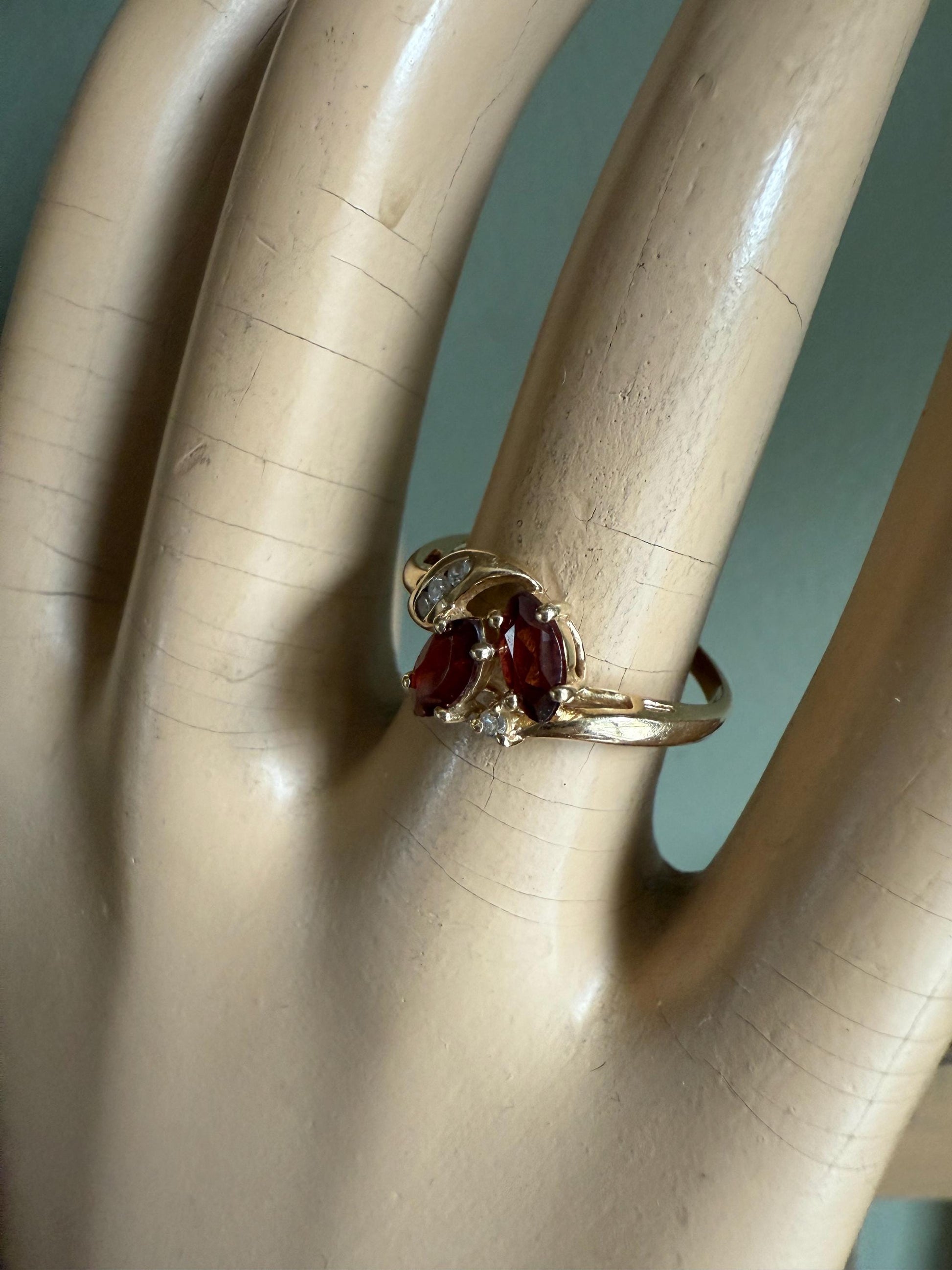 c1980-14K yellow gold ring (stamped in shank and tested) featuring two marquis cut garnets, approx. 6 x 3 mm each, securely set with a ribbon set with three round cut diamonds, sz 6.5 but message if you need sizing service. 1.9 grams. Very good preowned condition. Layaway available.