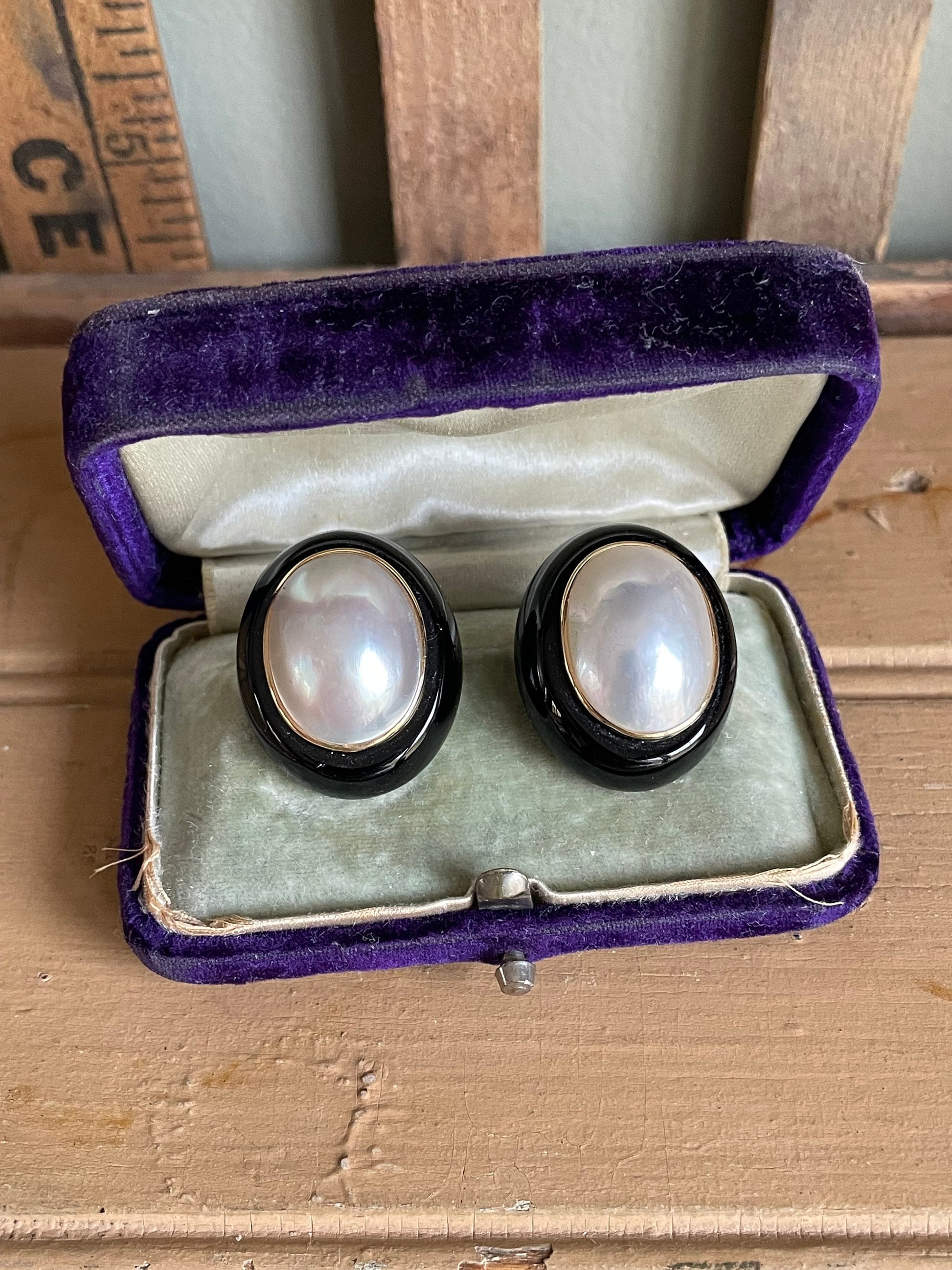 Classic style 14K yellow gold earrings featuring onyx and mabe pearls. Don't let the larger size scare you off the posts with clip back make them very comfortable wear. I have thin earlobes and the I can wear this style all day without them tugging on my ear.