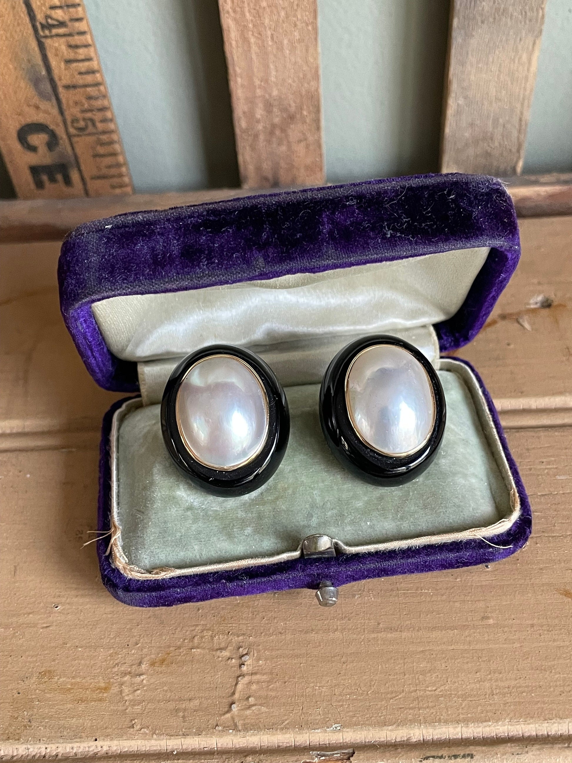 Vintage 14K Yellow Gold Onyx & Mabe Pearl Earrings Posts with Clip Backs