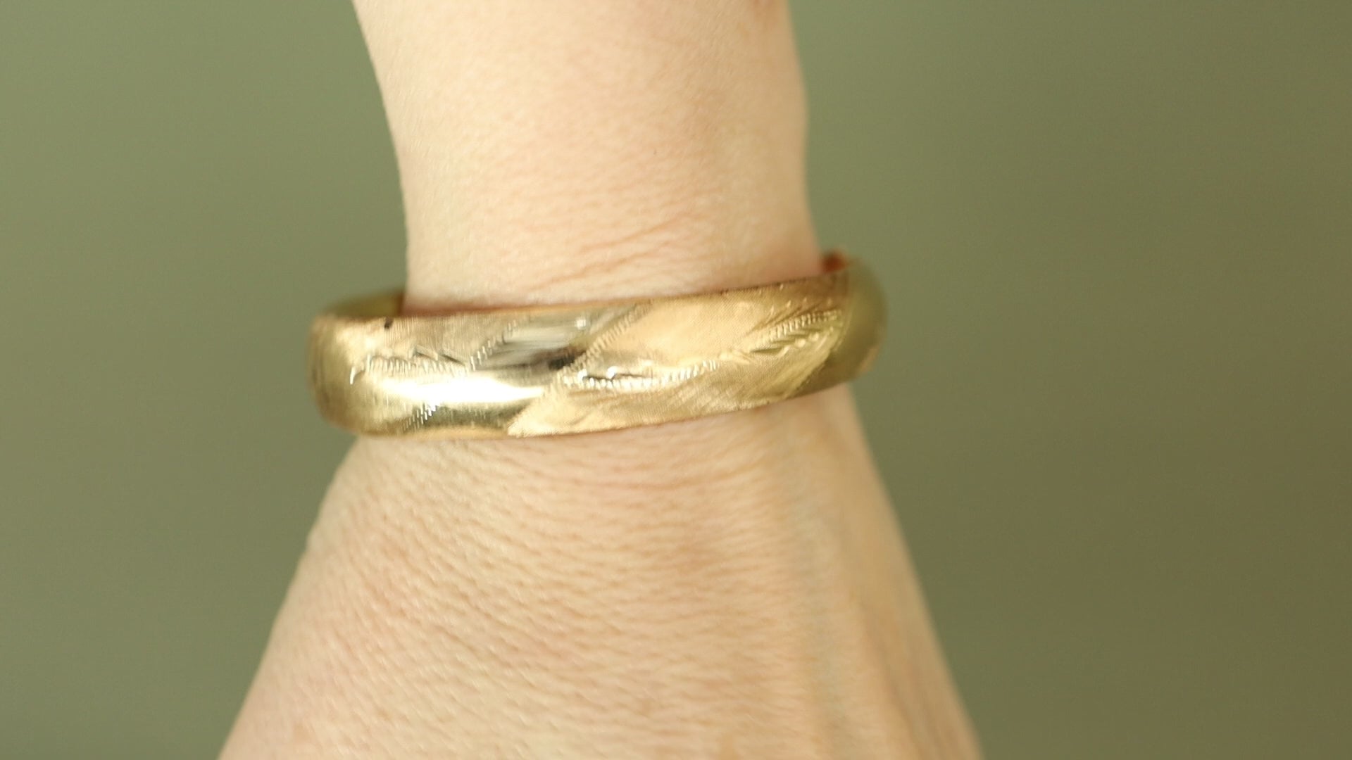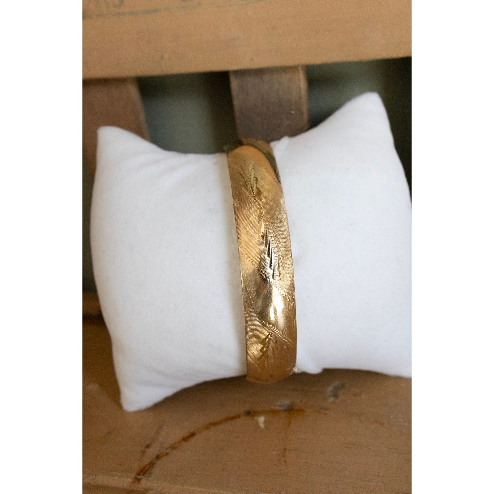 14K yellow gold bangle/bracelet with beautiful etched branches and ribbon design -front and back. The bracelet is stamped 14K on the saftey bar and has been verified as 14k. The hinge is tight and the clasp is tight and clicks shut. Condition is very good-no dents or damage. 7/16" wide. Inside measures 2 1/4" x 2 1/8". Fits a wrist up to 6.75"