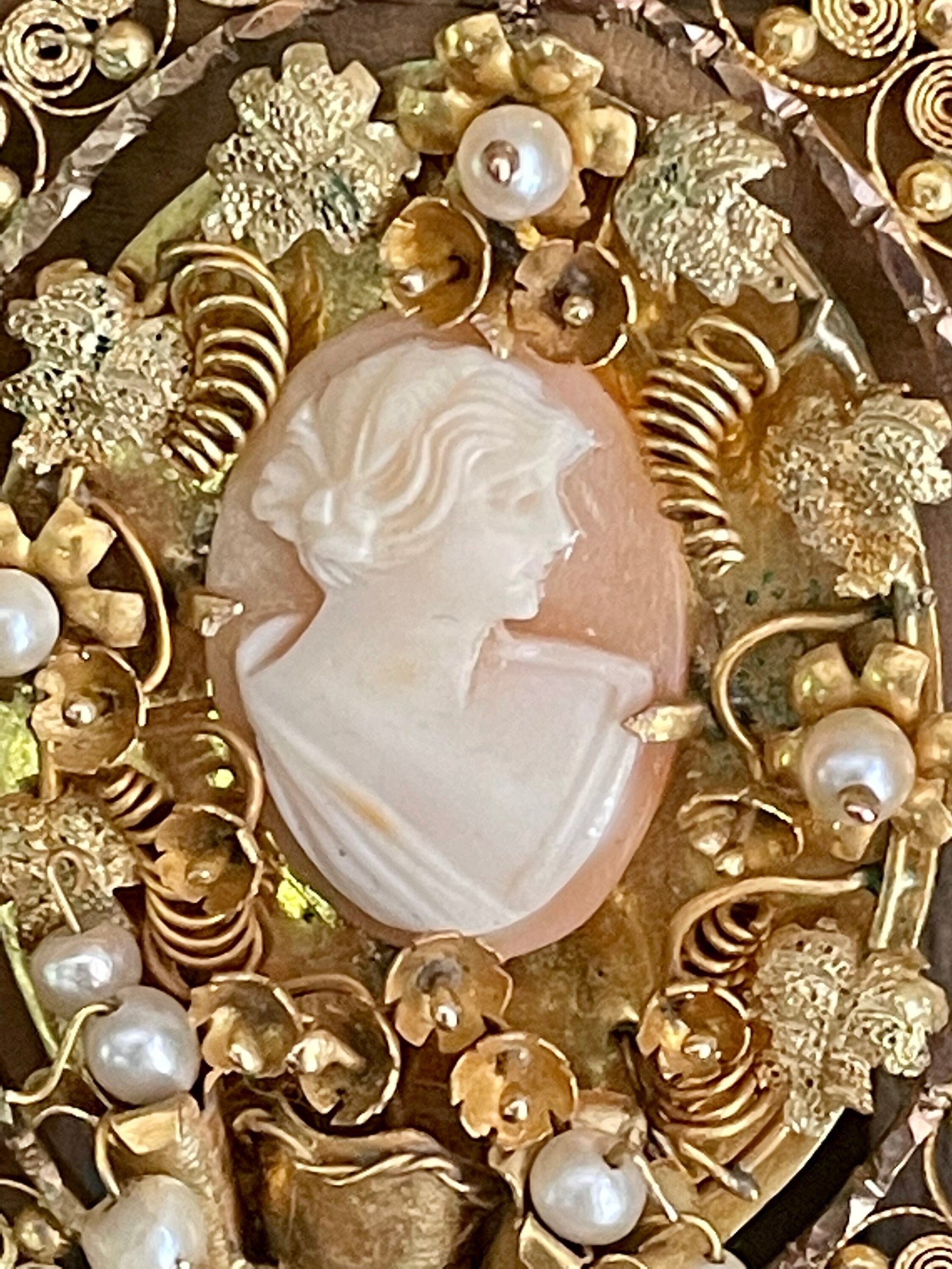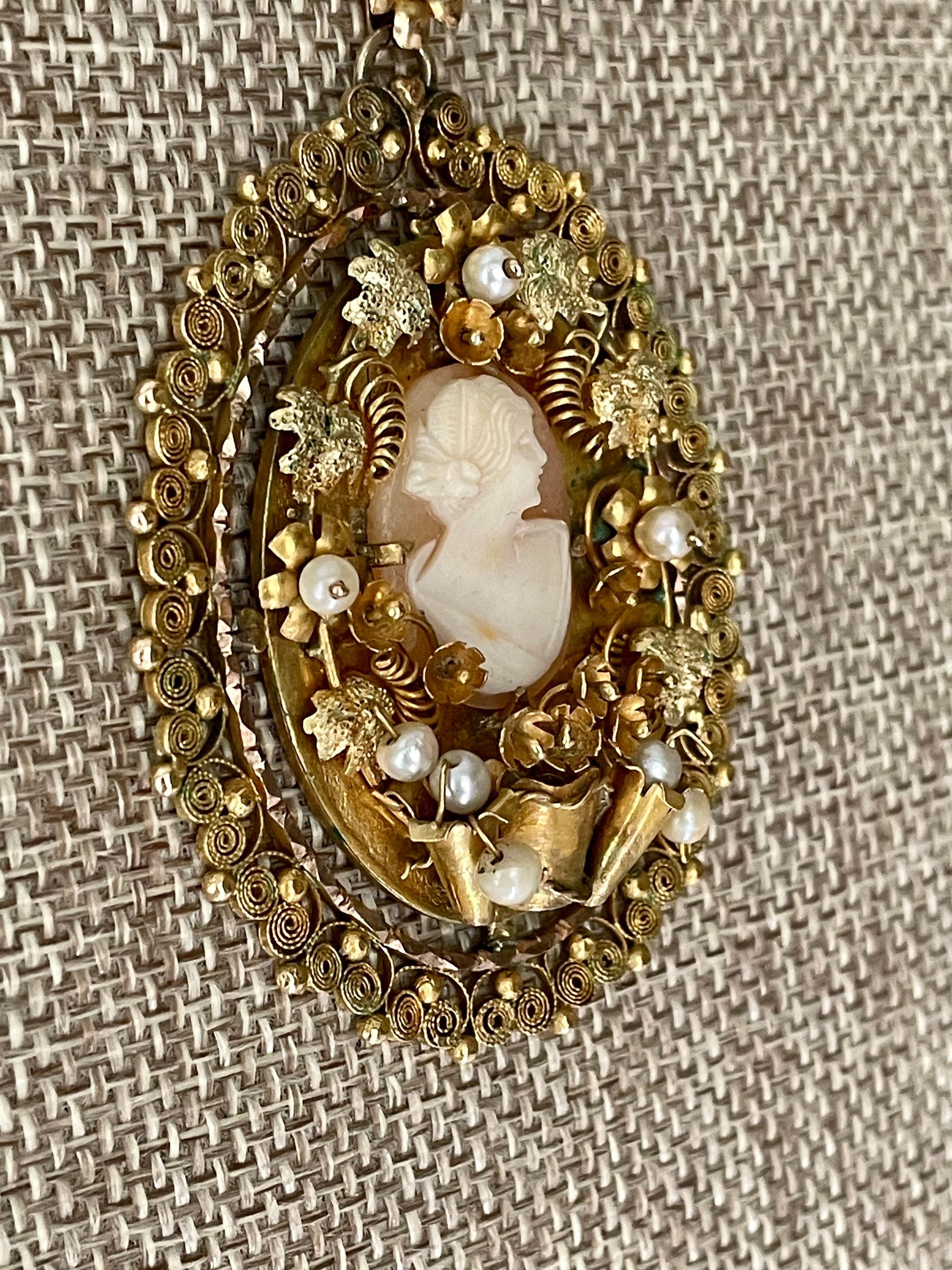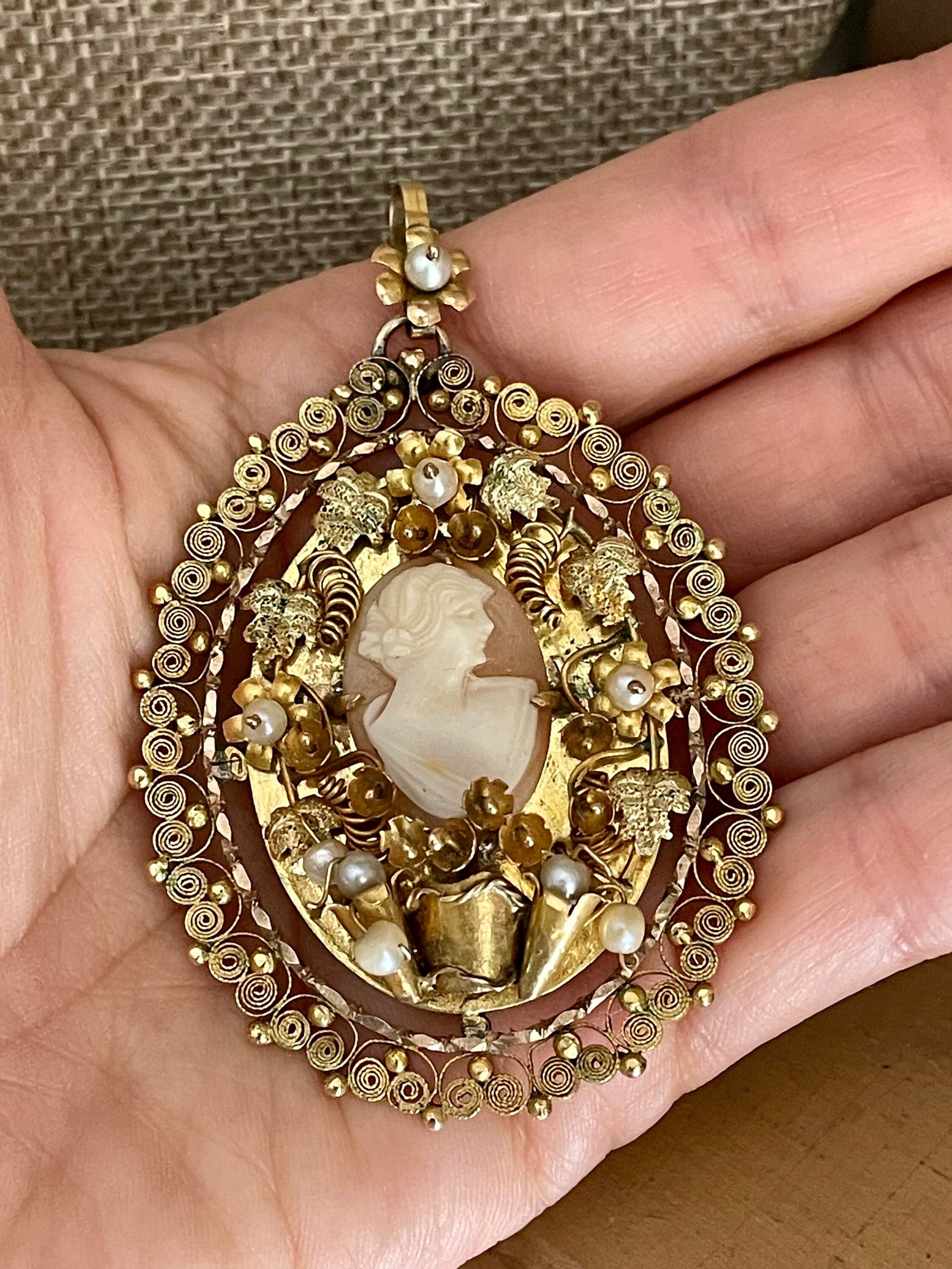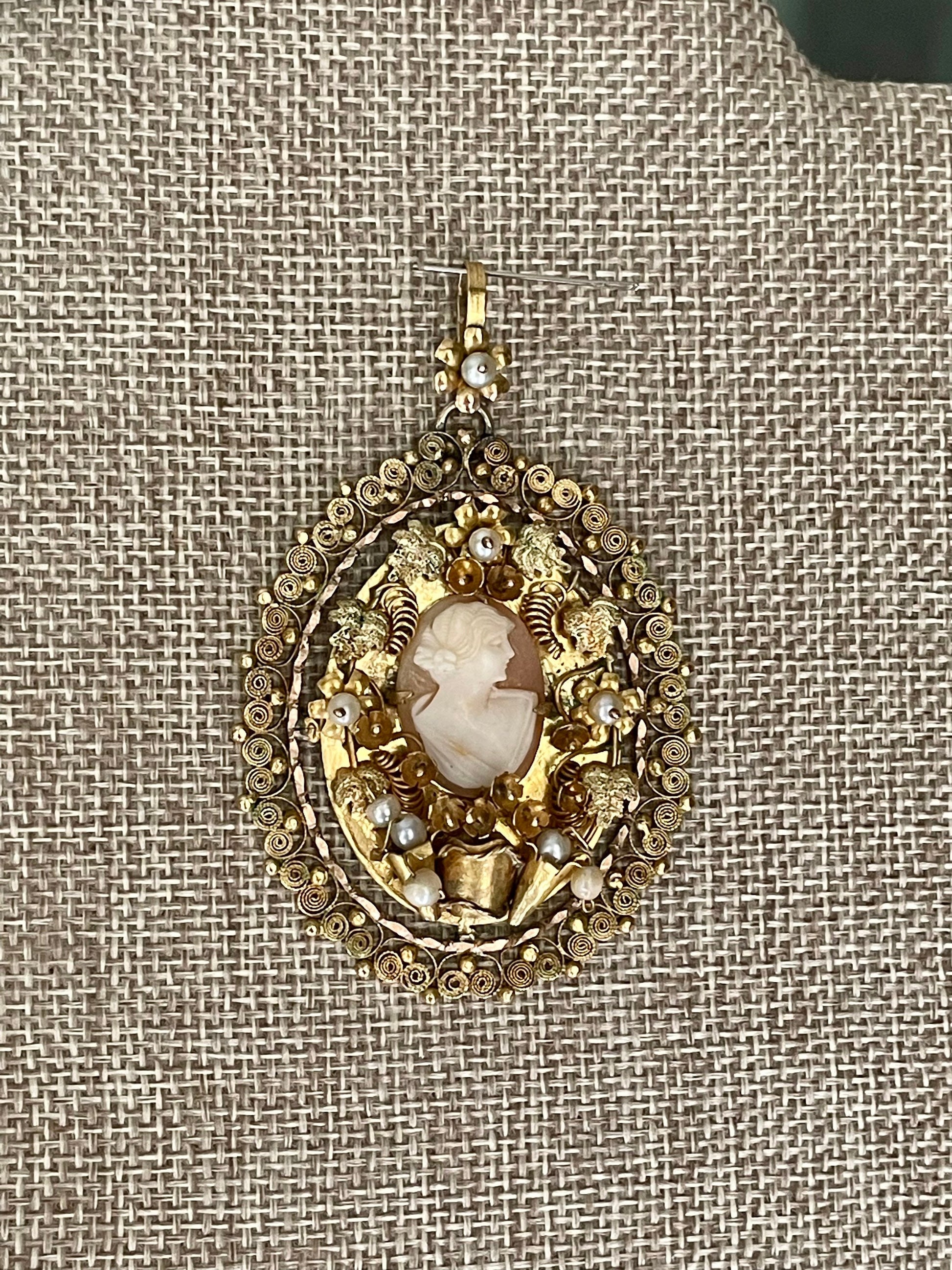 Large pendant hand made from 14K yellow gold. Intricate design with a prong set oval shell cameo measuring approx. 18.5 x 14 mm surrounded by flowers with pearl centers, textured leaves, curls. My favorite part-a pot at the bottom with flowers. There is a frame of gold spun wire. Decorated bale with flower and pearl. The piece is not marked but tested throughout to be 14K yellow gold. Surely one of a kind-I wish I knew the story behind this. Perhaps a token of love.